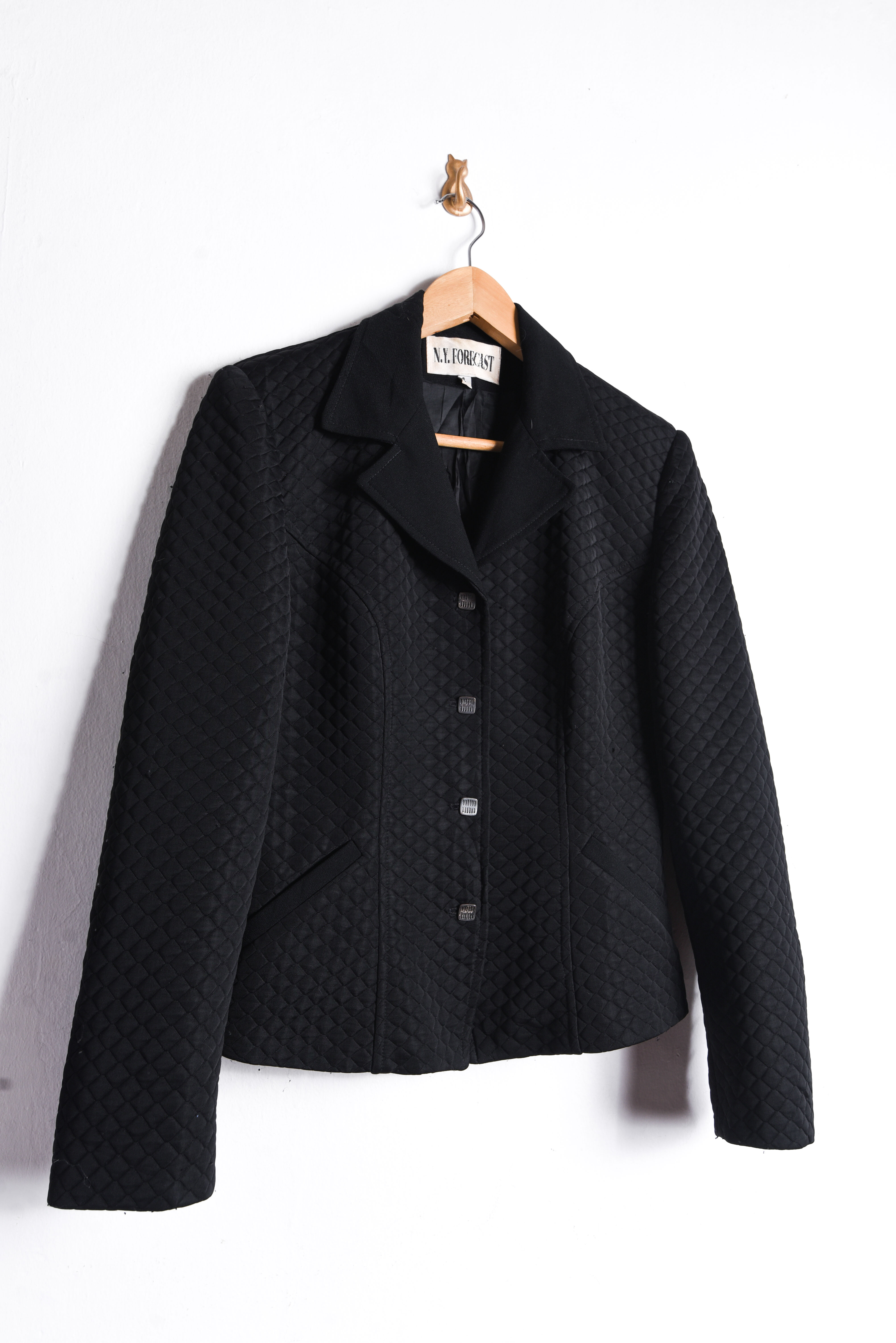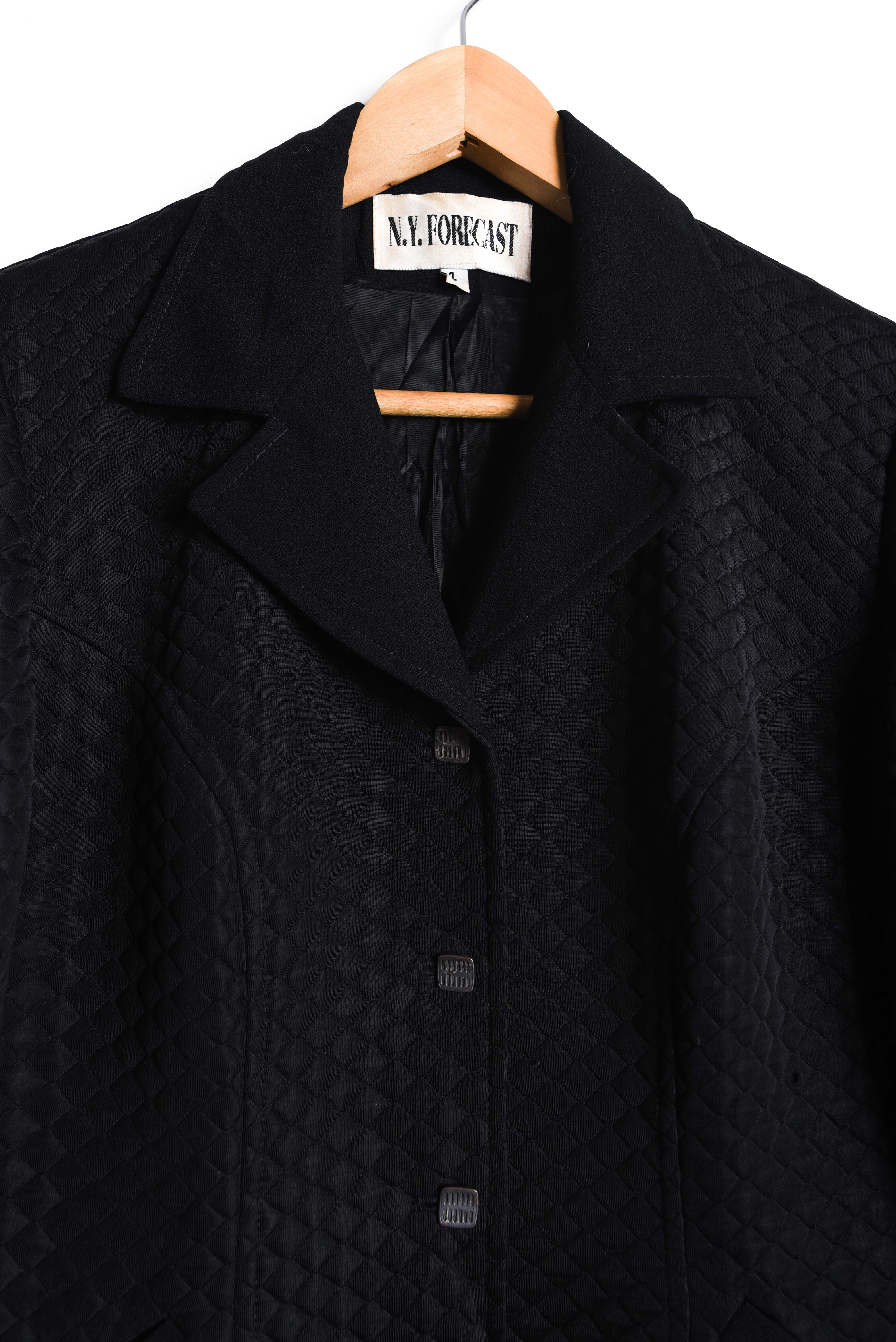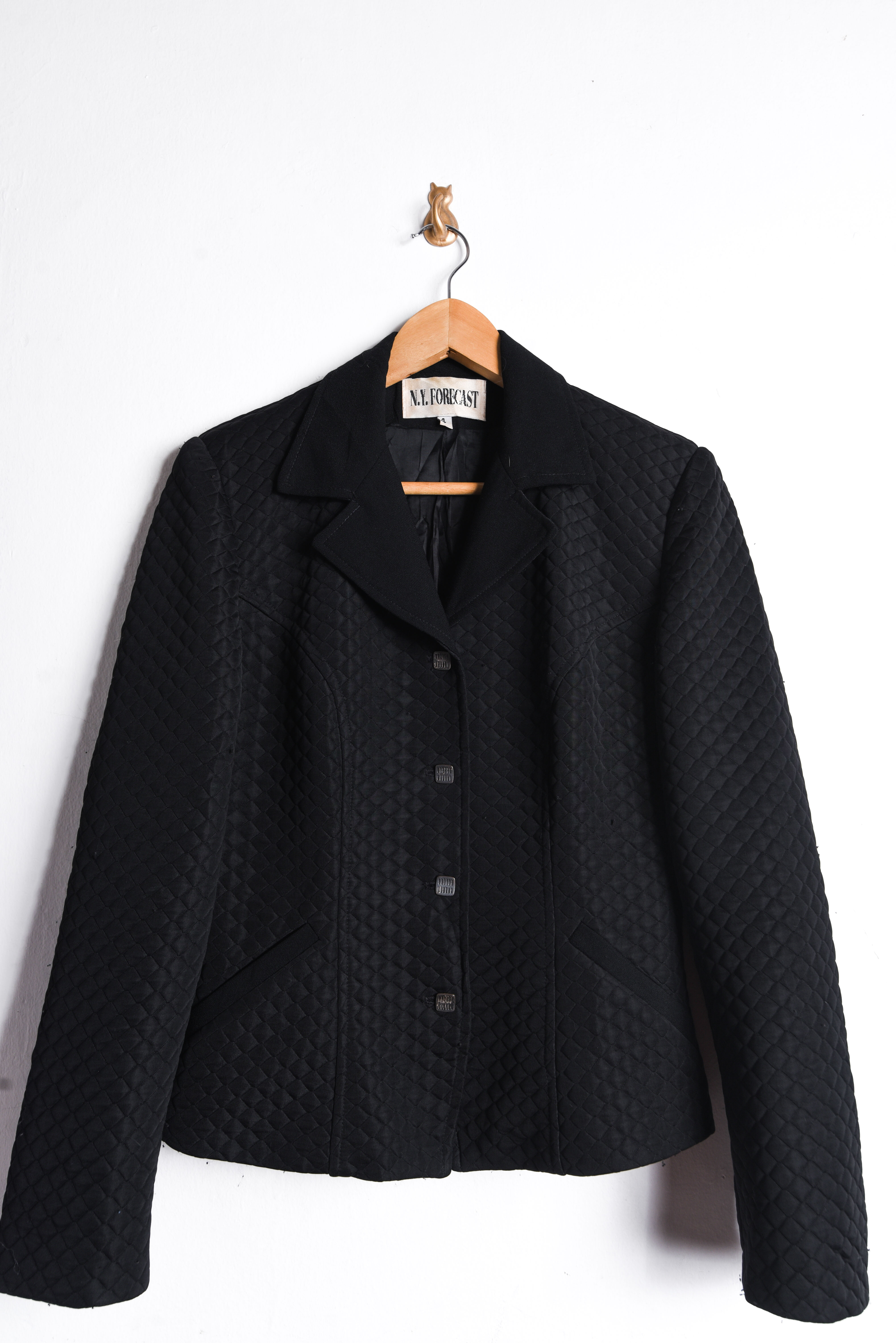 Hermoso blazer vintage de media estación, color negro con diseño acolchado y botones en el delantero. 66% acetato y 34% poliéster.