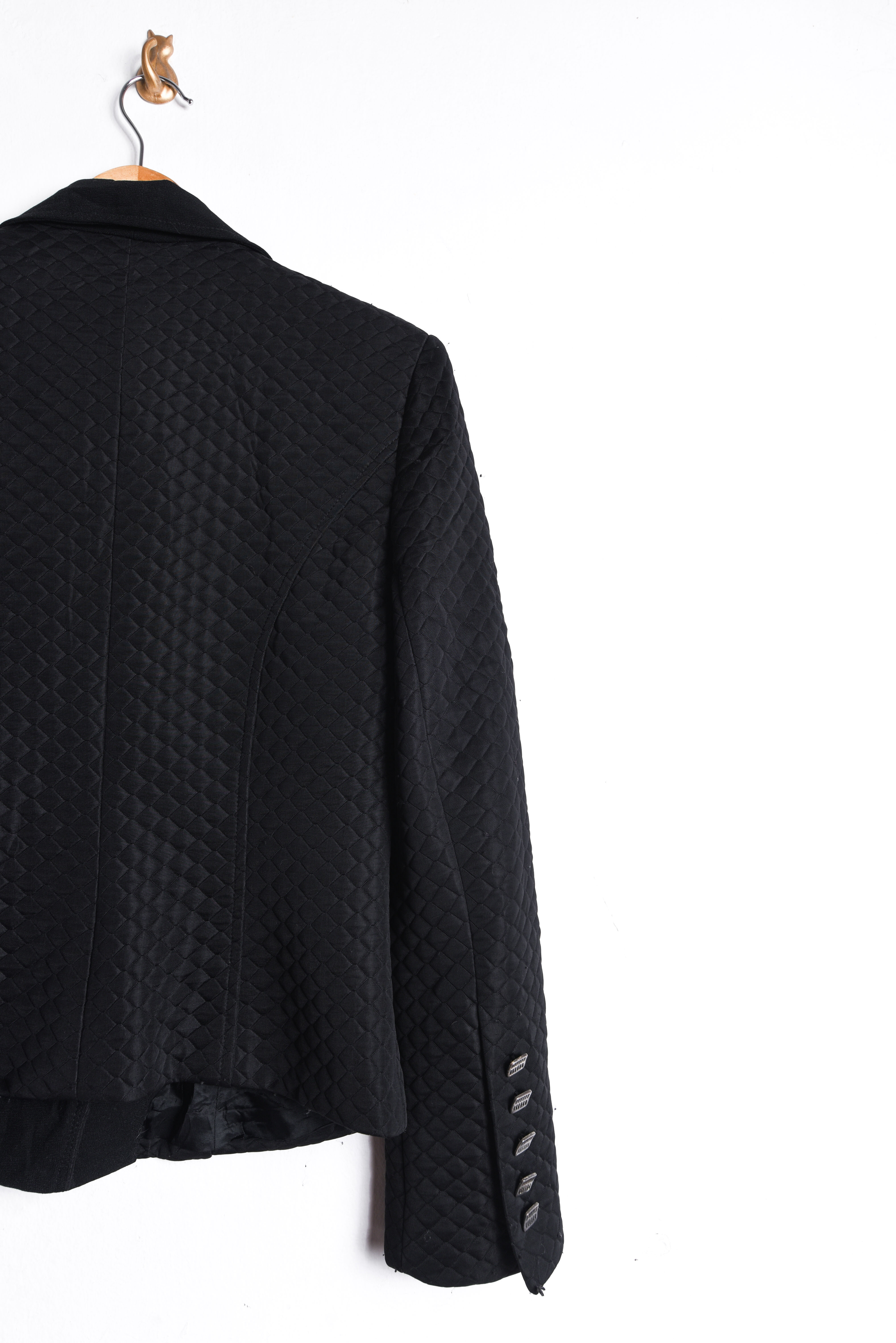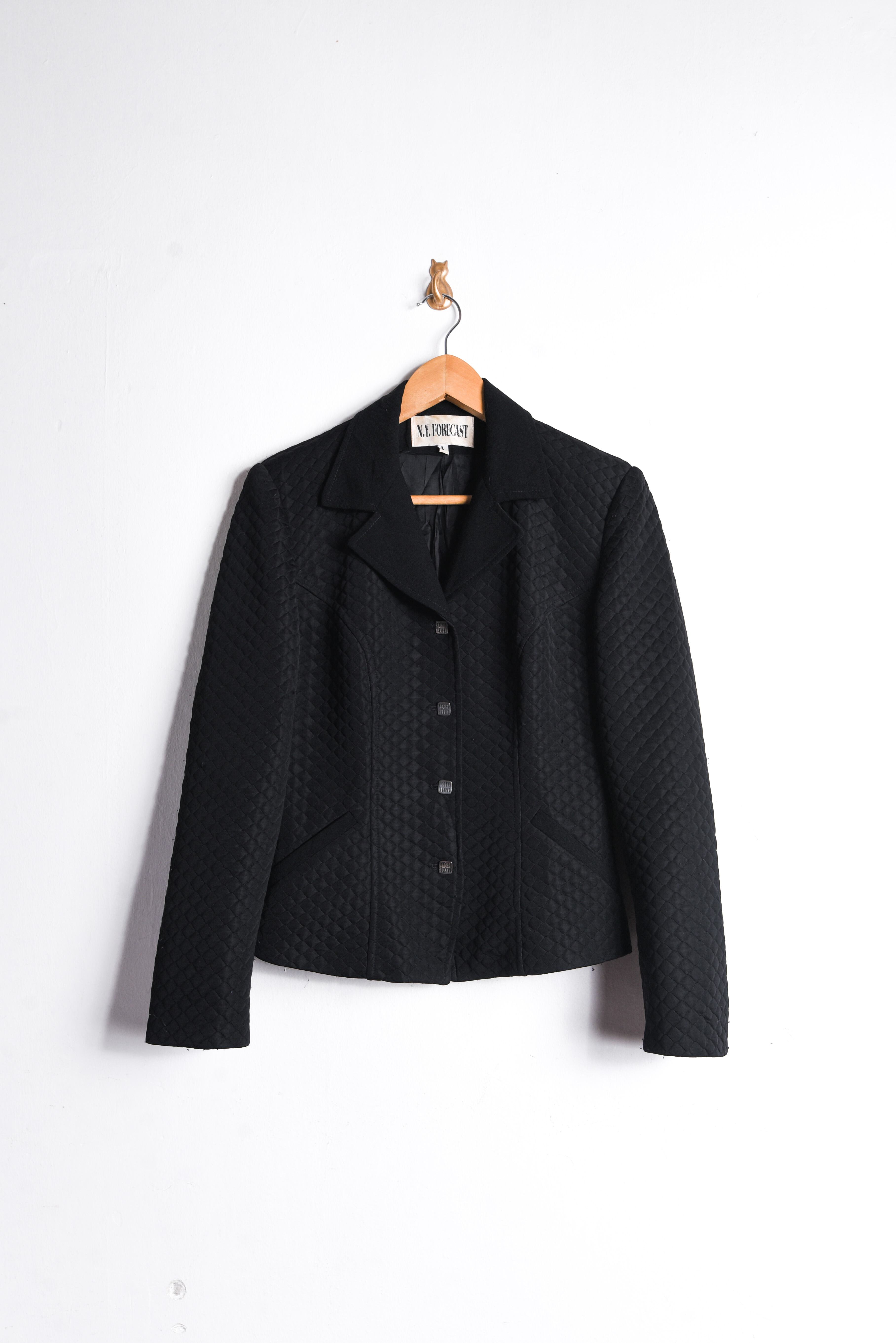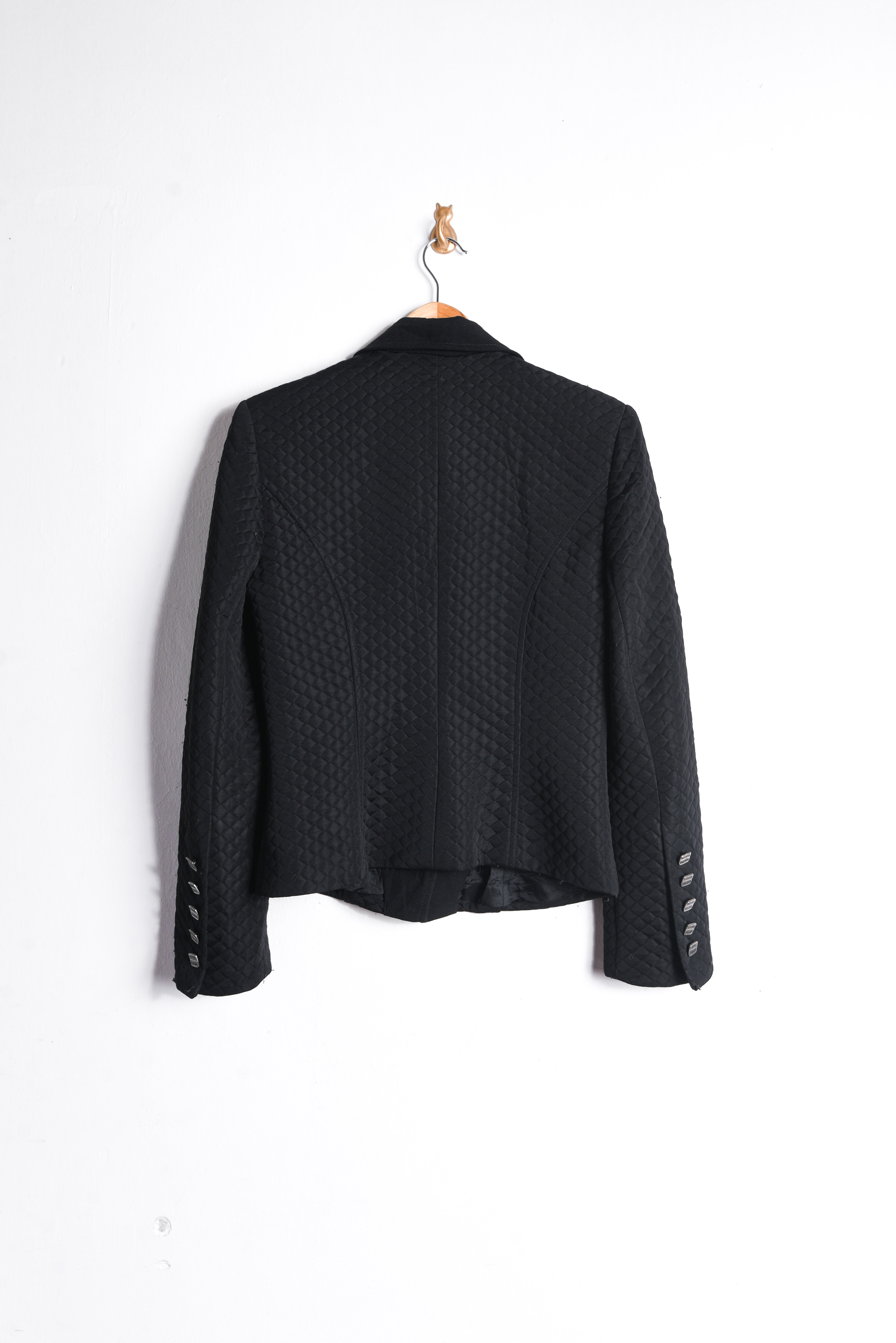 Hermoso blazer vintage de media estación, color negro con diseño acolchado y botones en el delantero. 66% acetato y 34% poliéster.