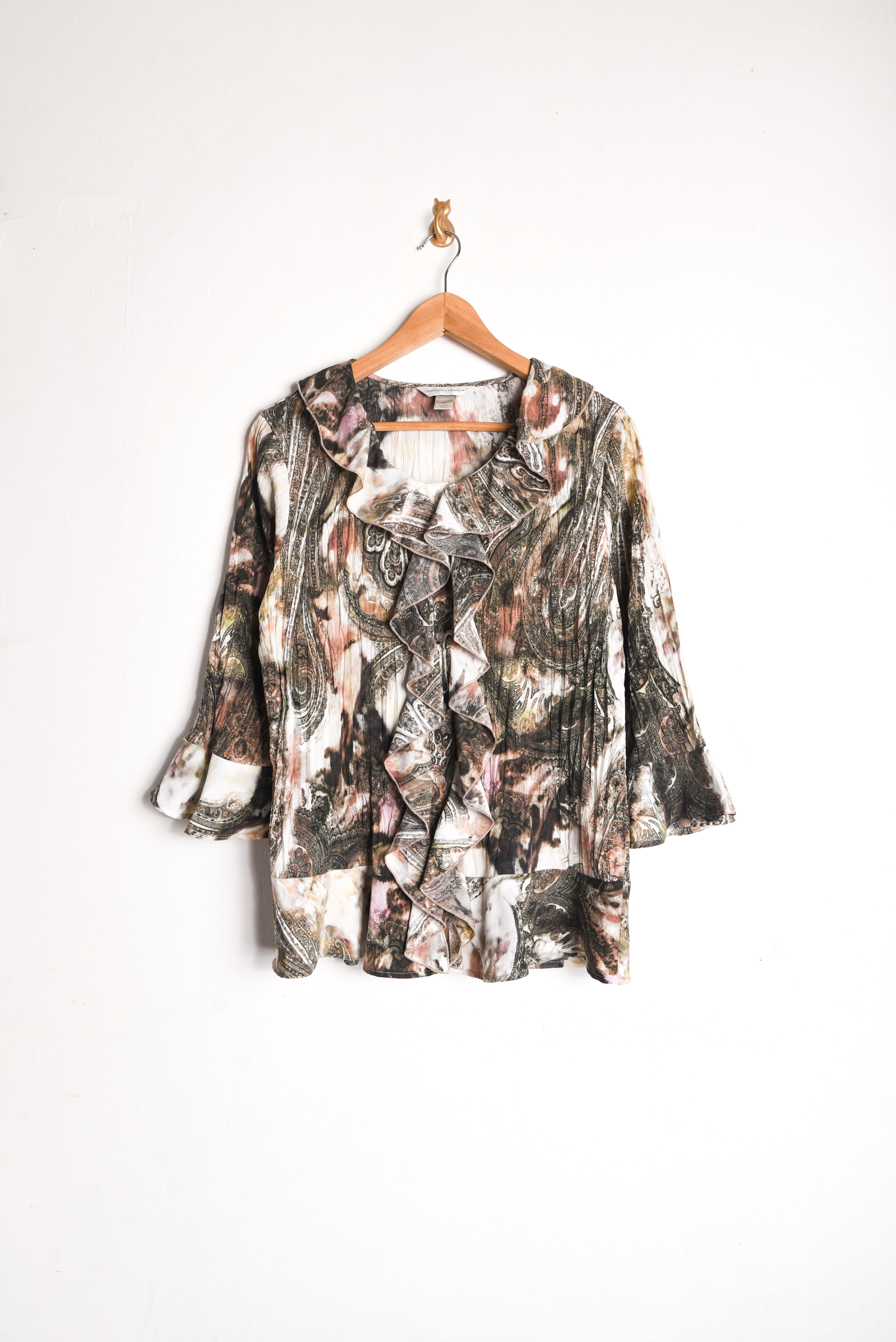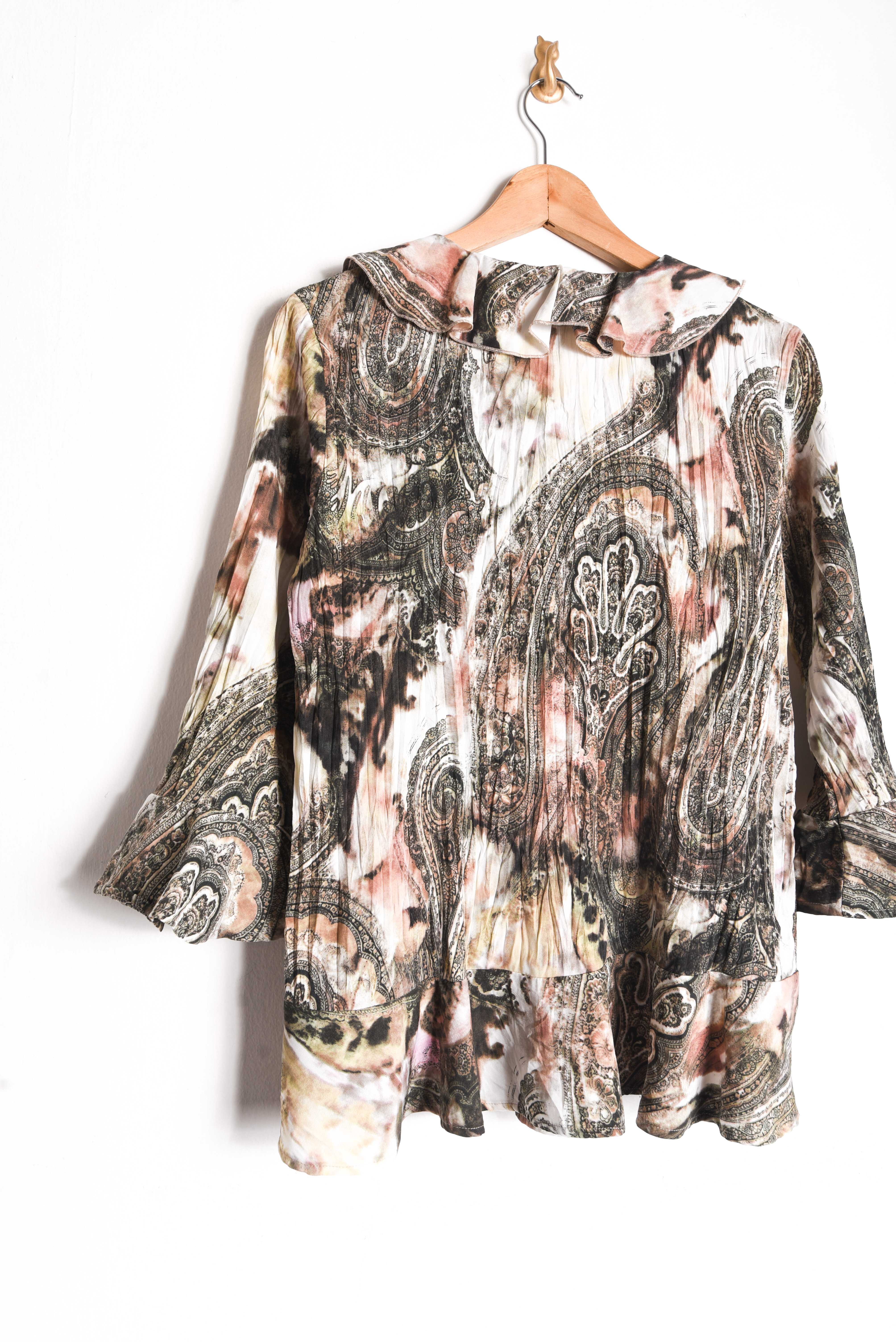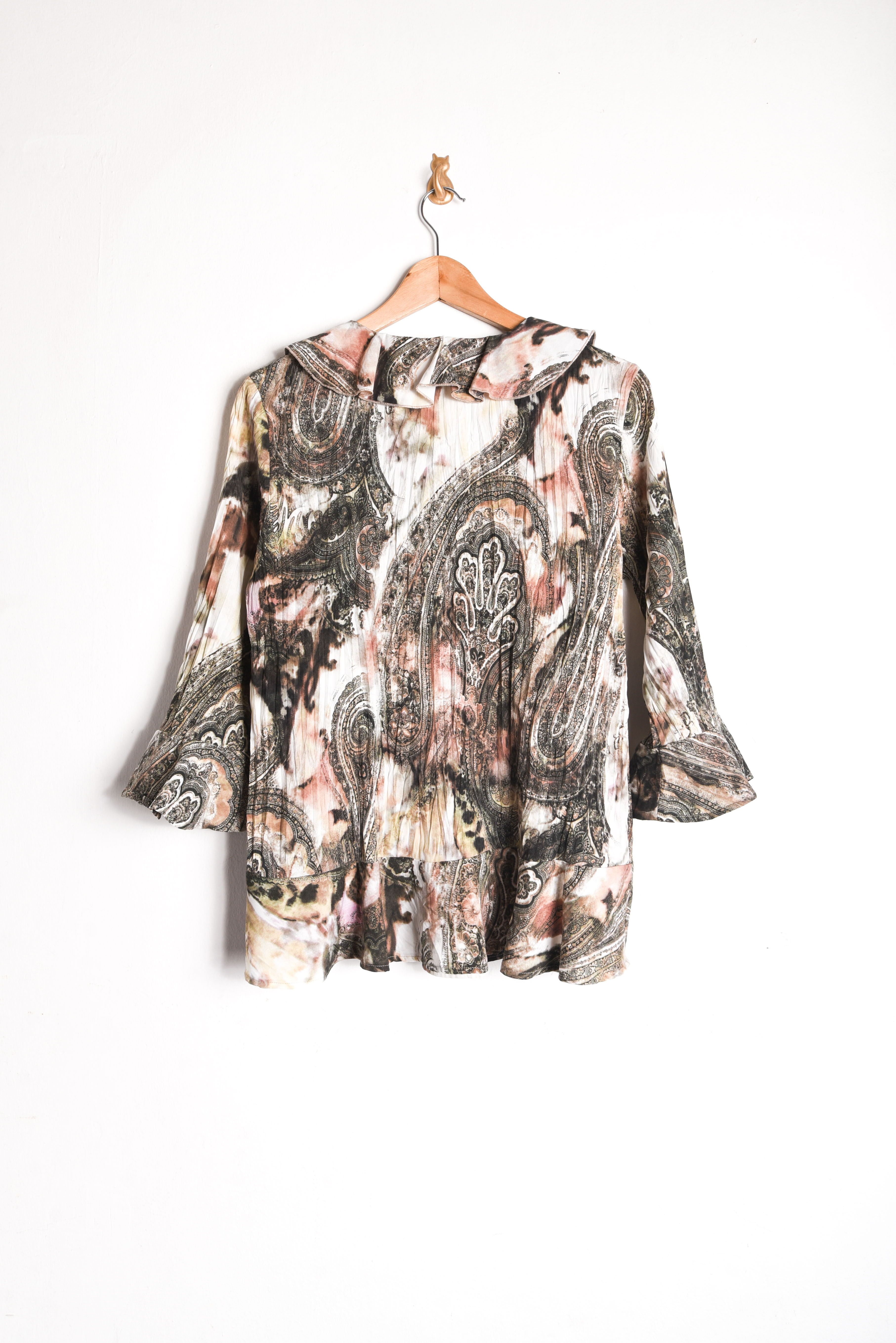 Hermosa blusa vintage con diseño paisley, tiene vuelos en el delantero y manga larga. 100% poliéster