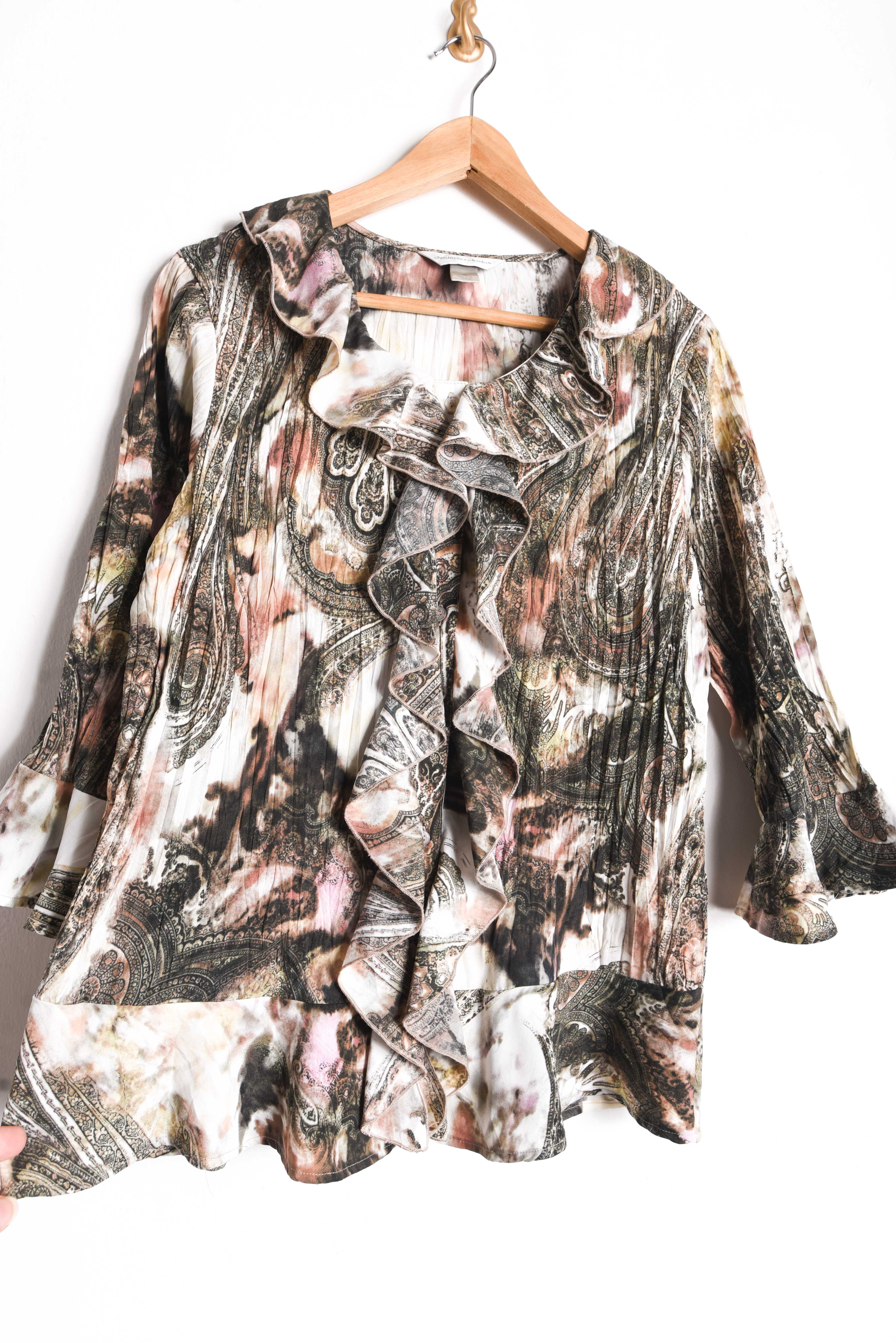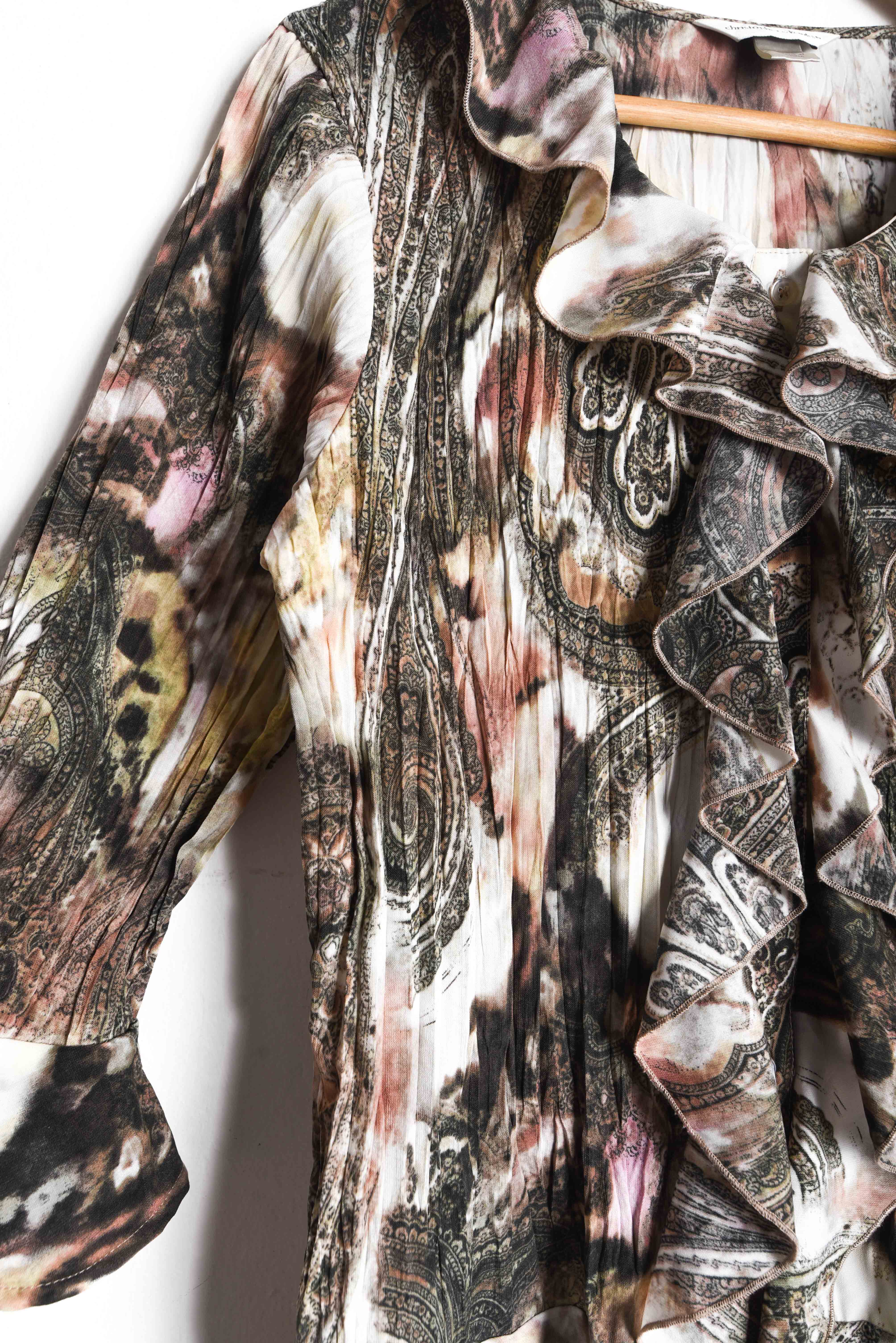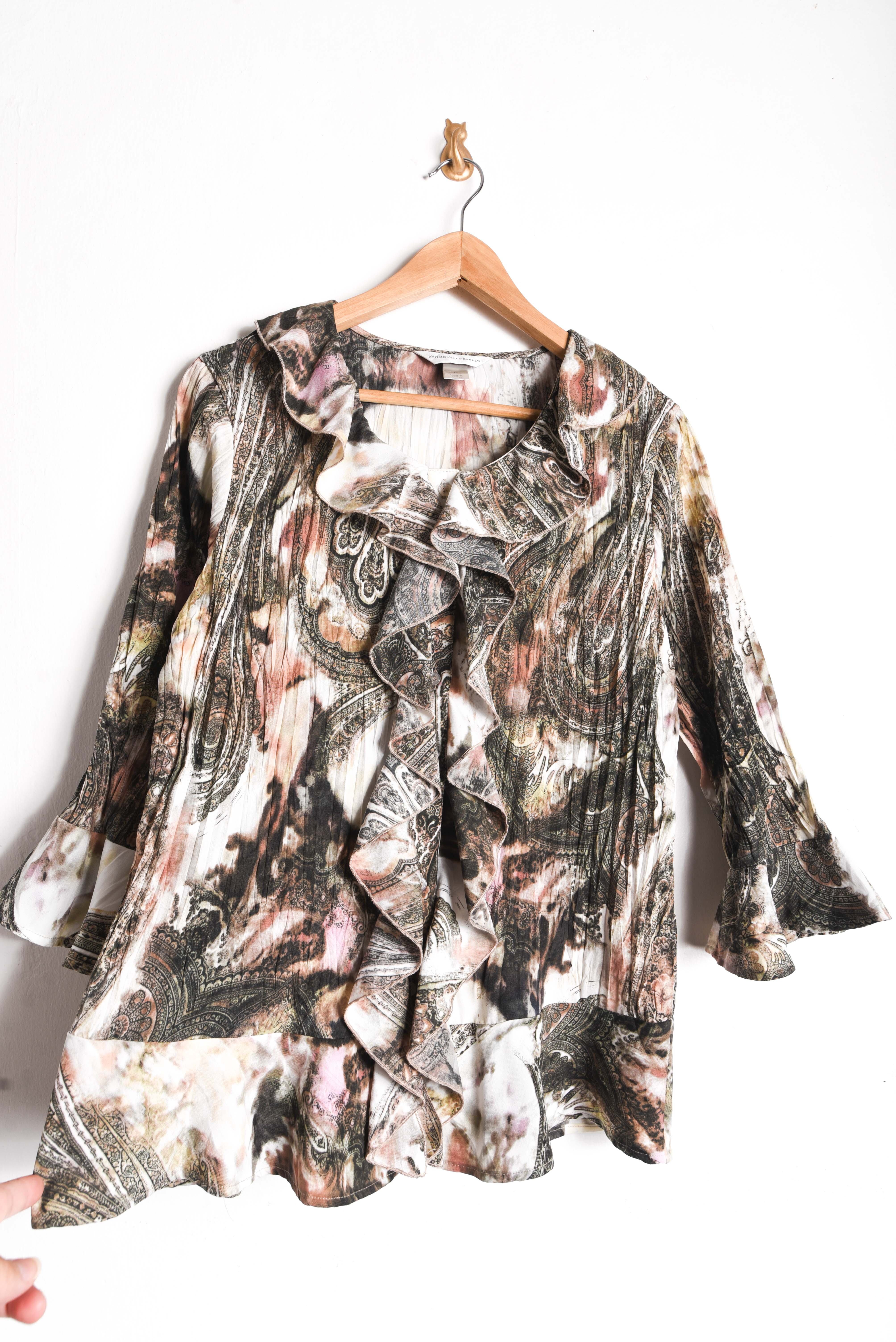 Hermosa blusa vintage con diseño paisley, tiene vuelos en el delantero y manga larga. 100% poliéster