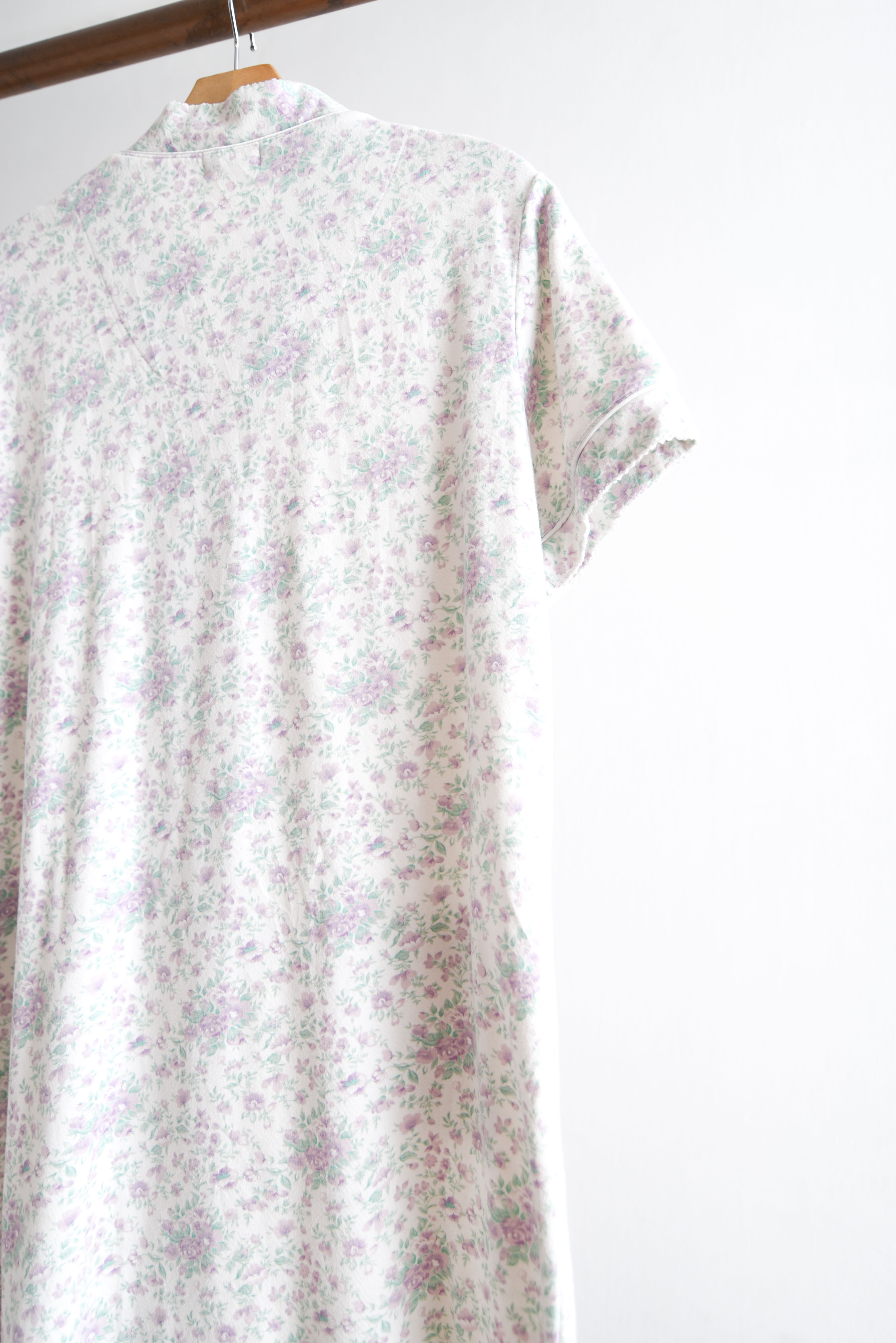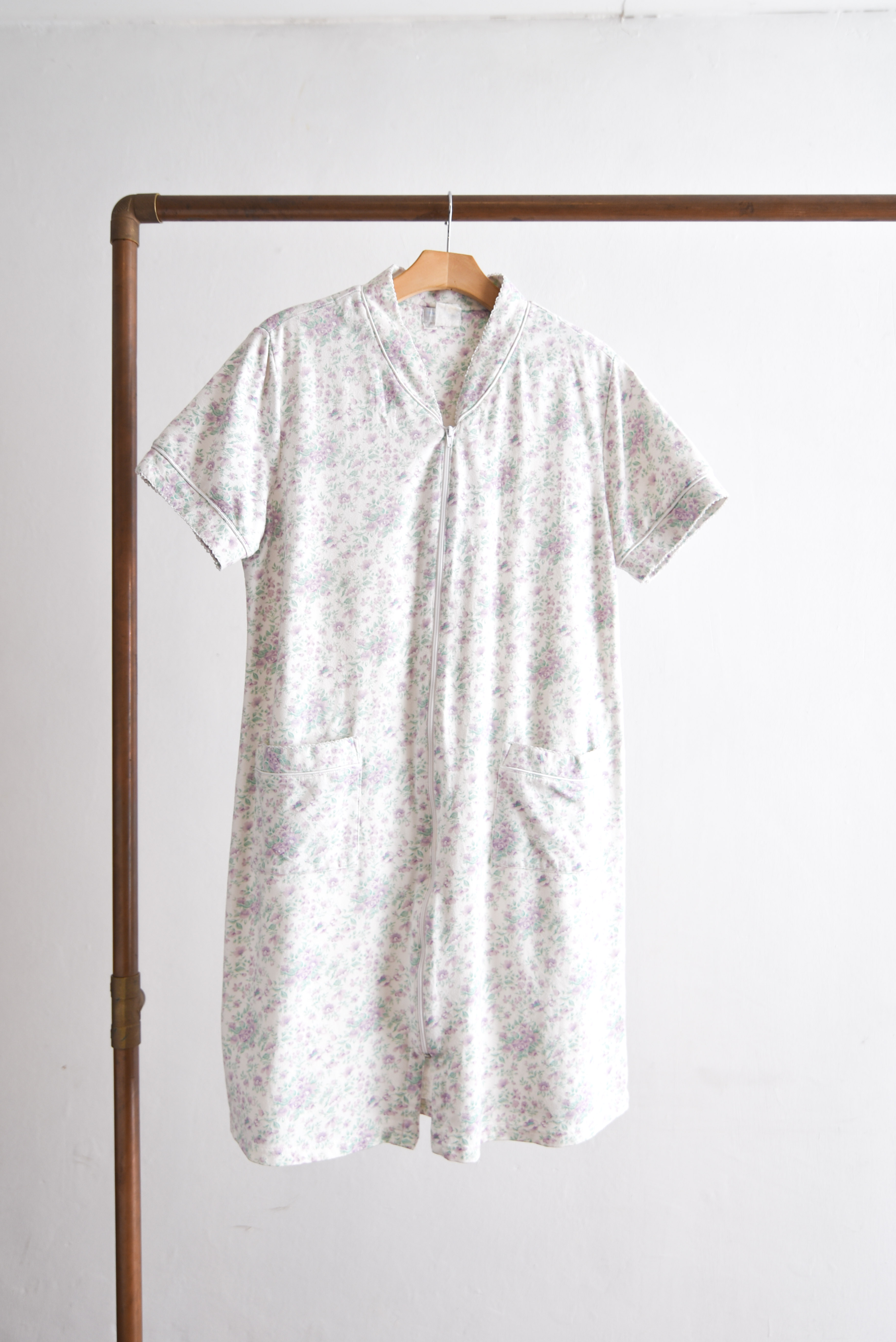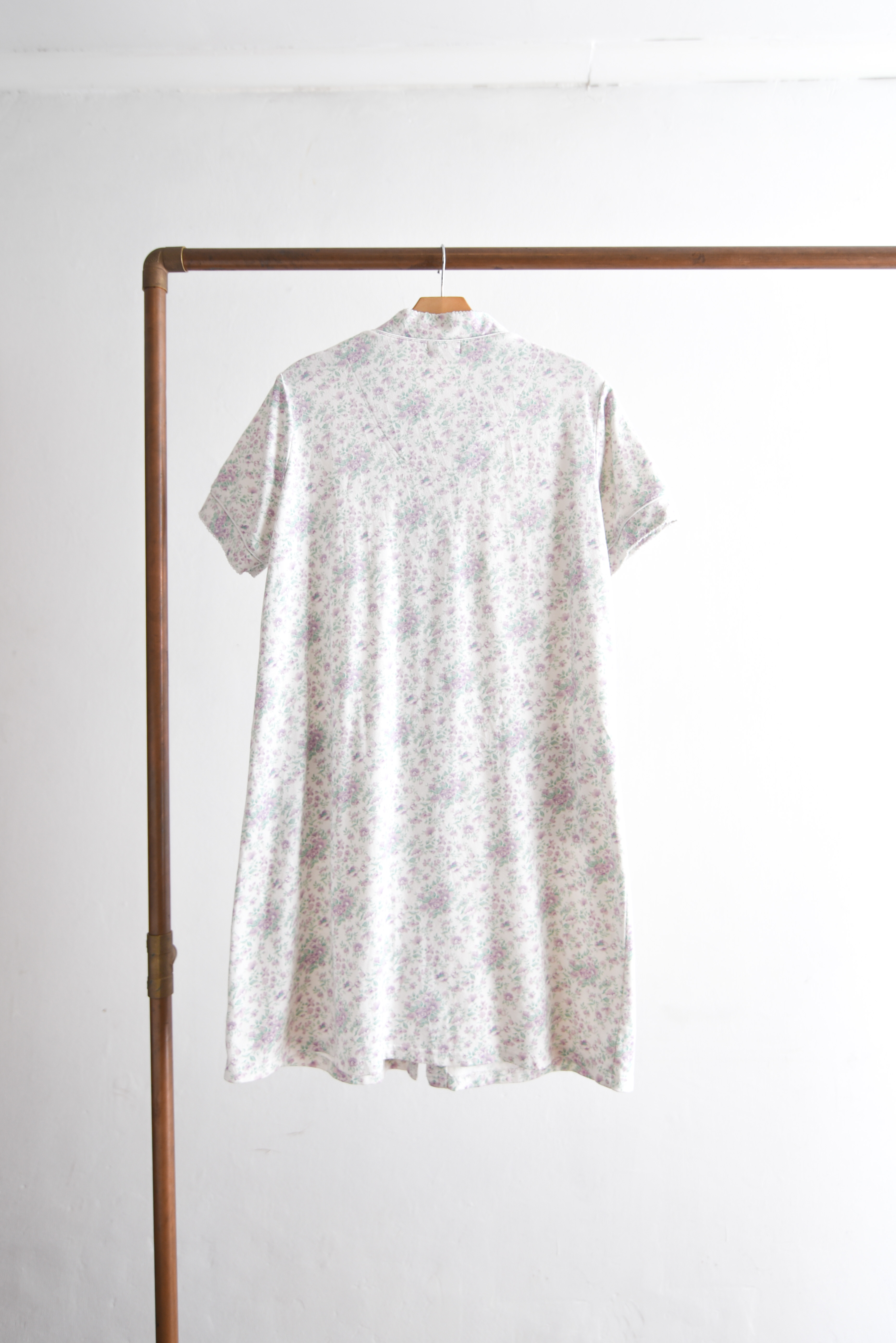 Bonita camisola vintage con diseño floral en tonos celeste pastel, tiene manga corta, cierre delantero y bolsillos.