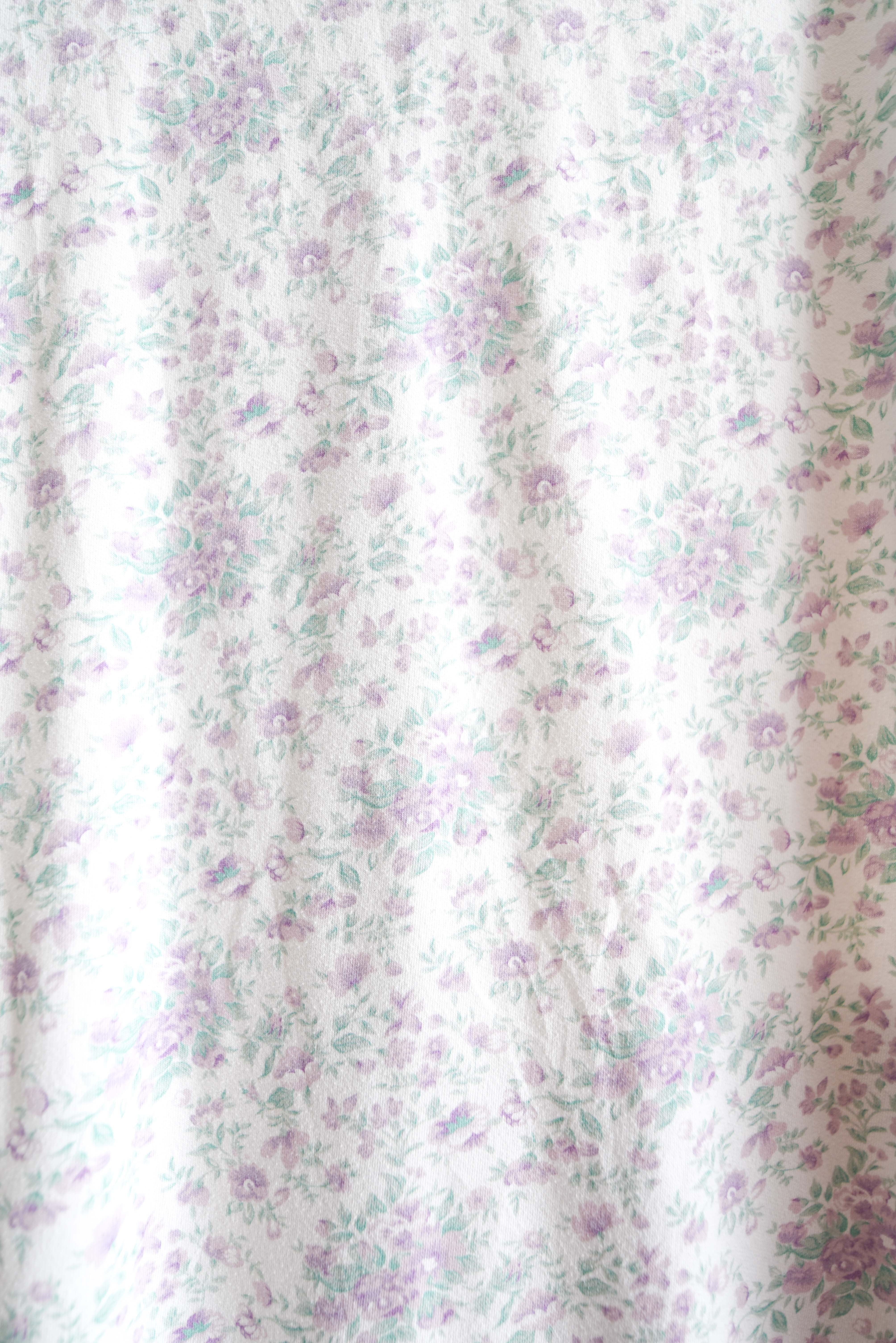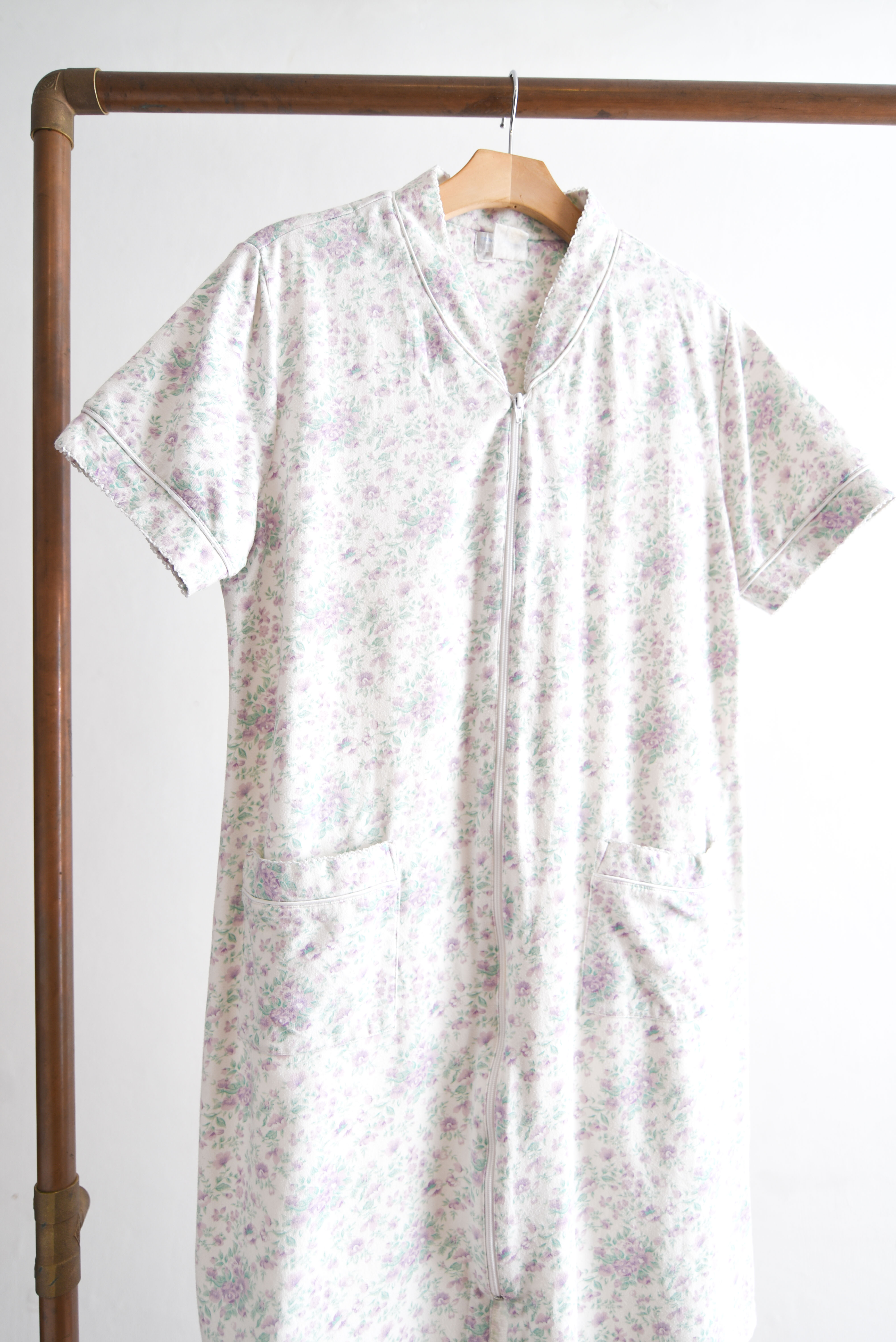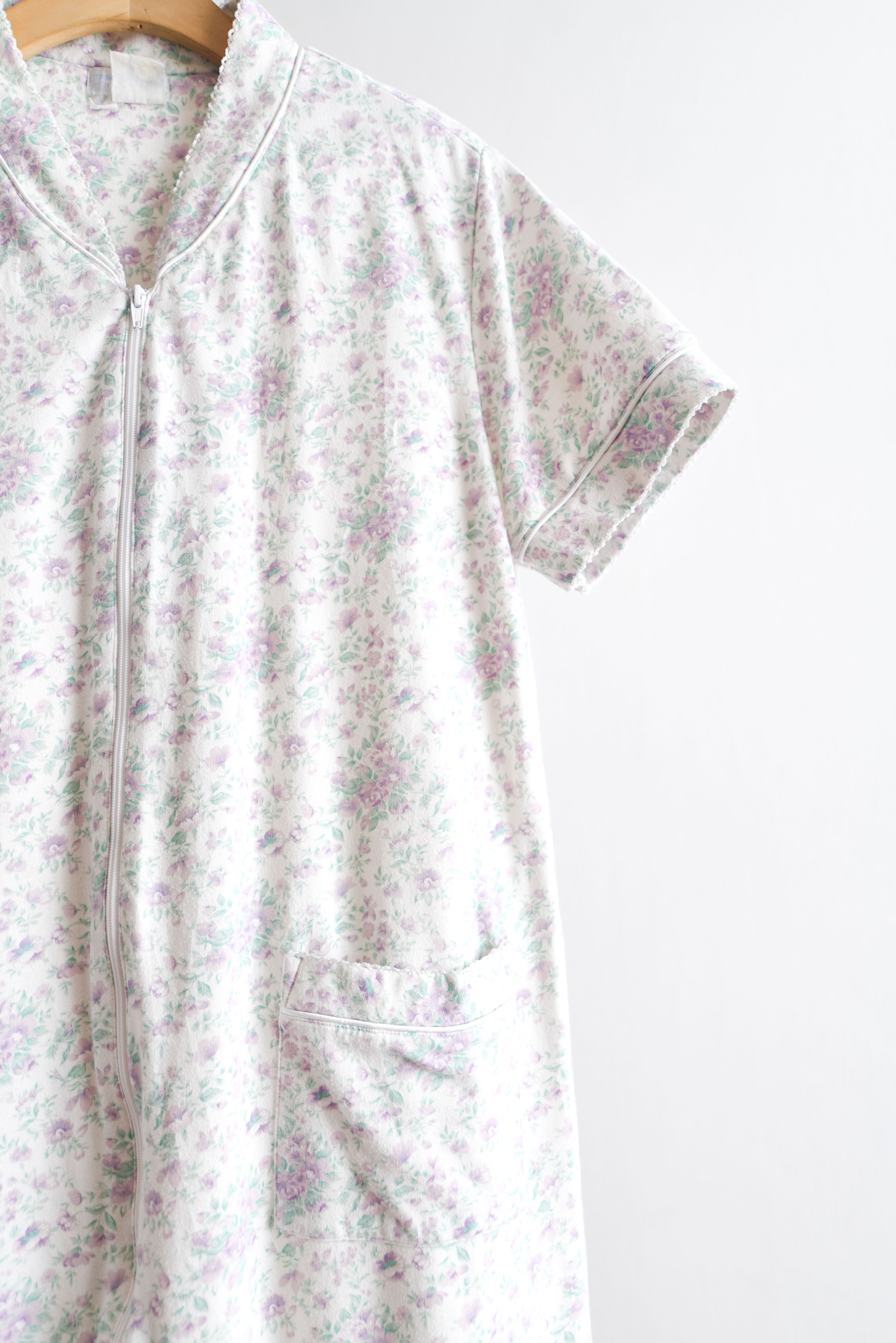 Bonita camisola vintage con diseño floral en tonos celeste pastel, tiene manga corta, cierre delantero y bolsillos.