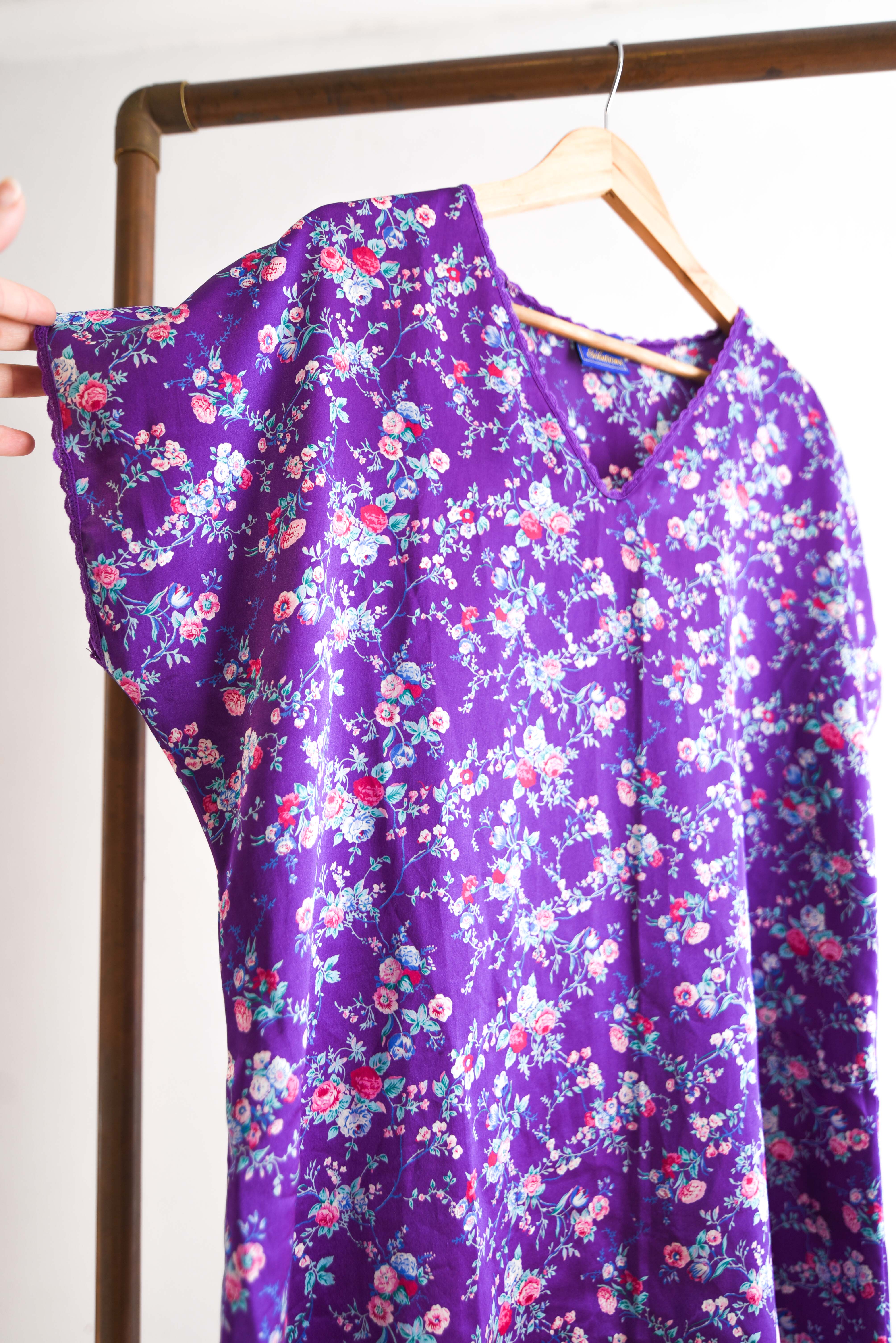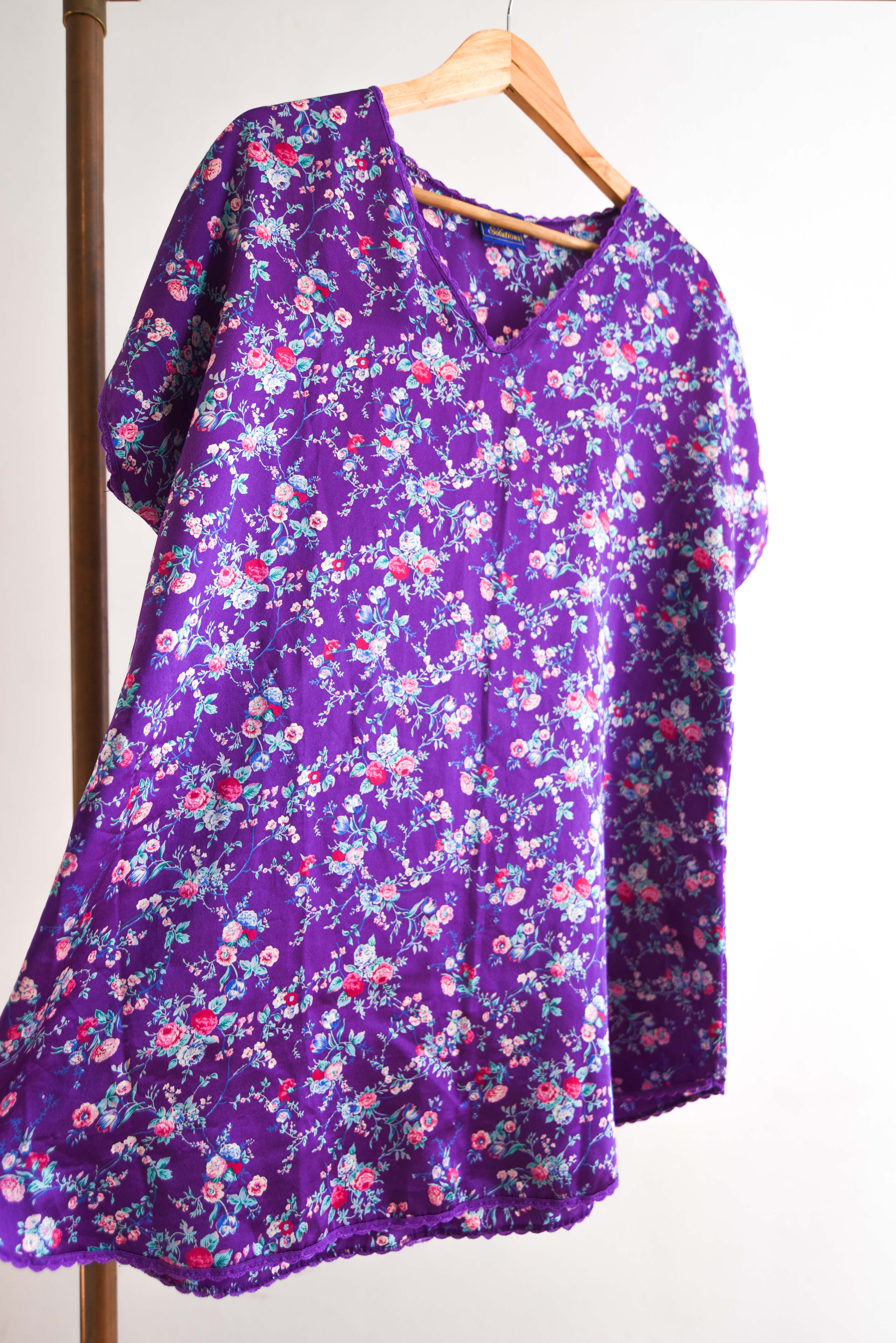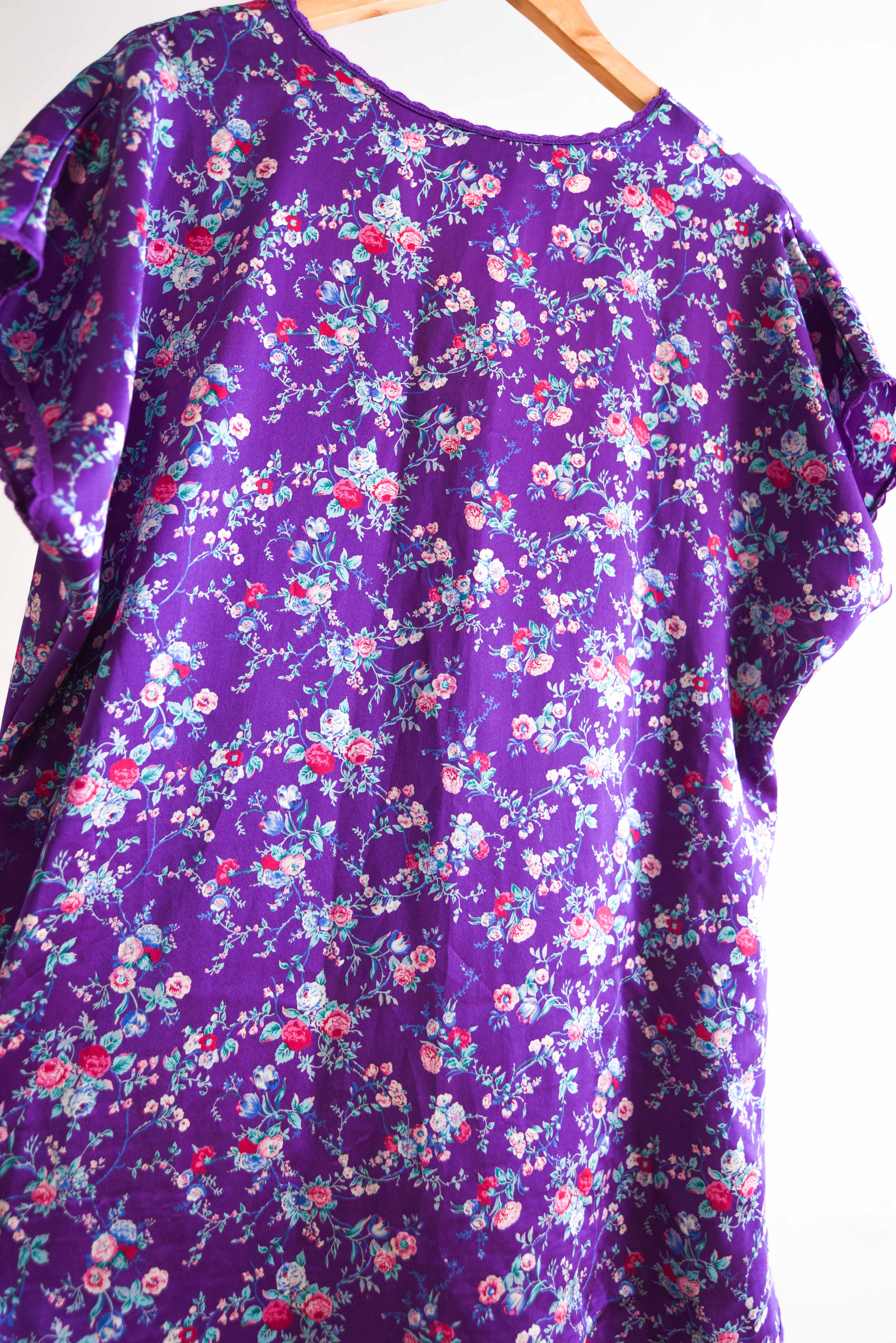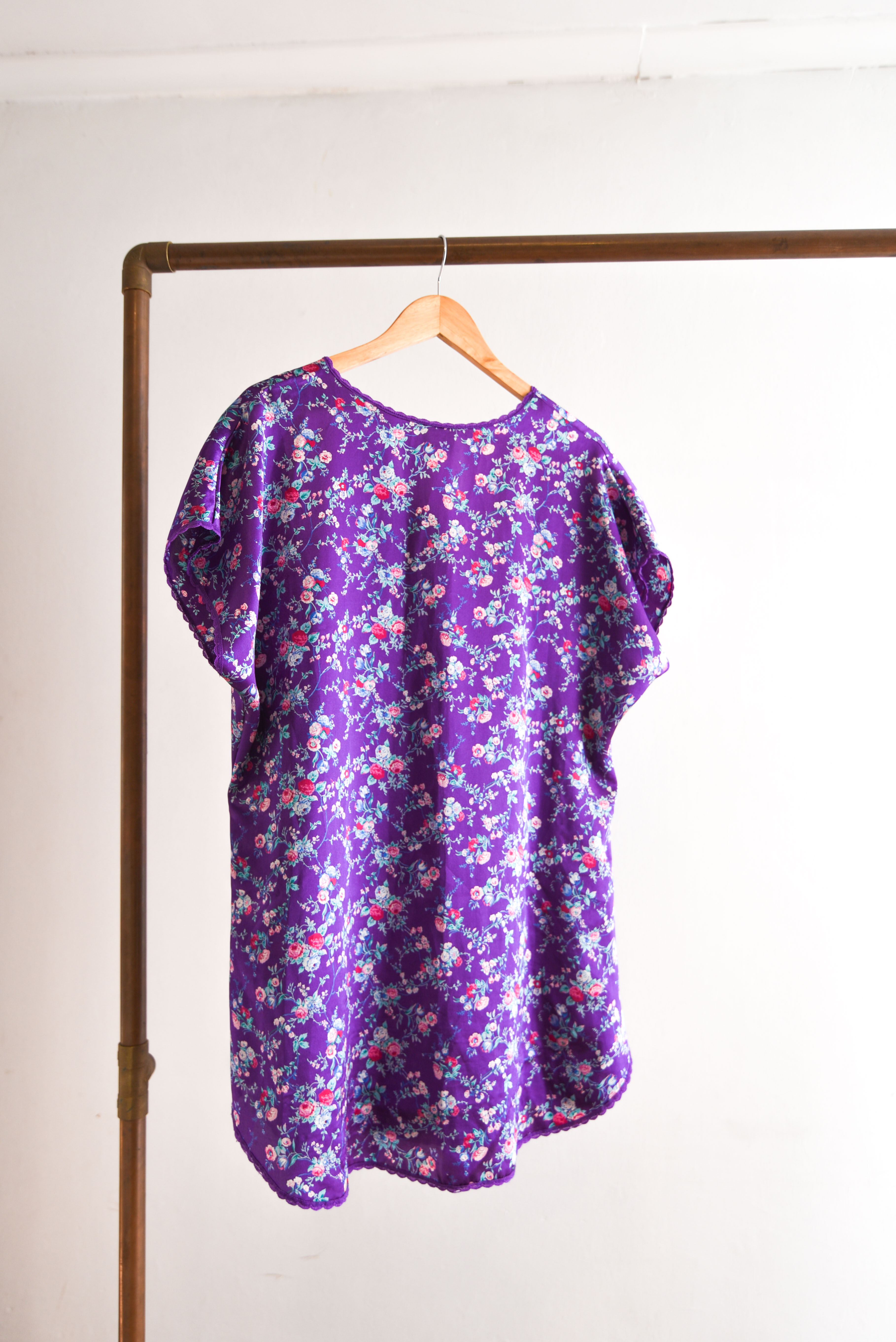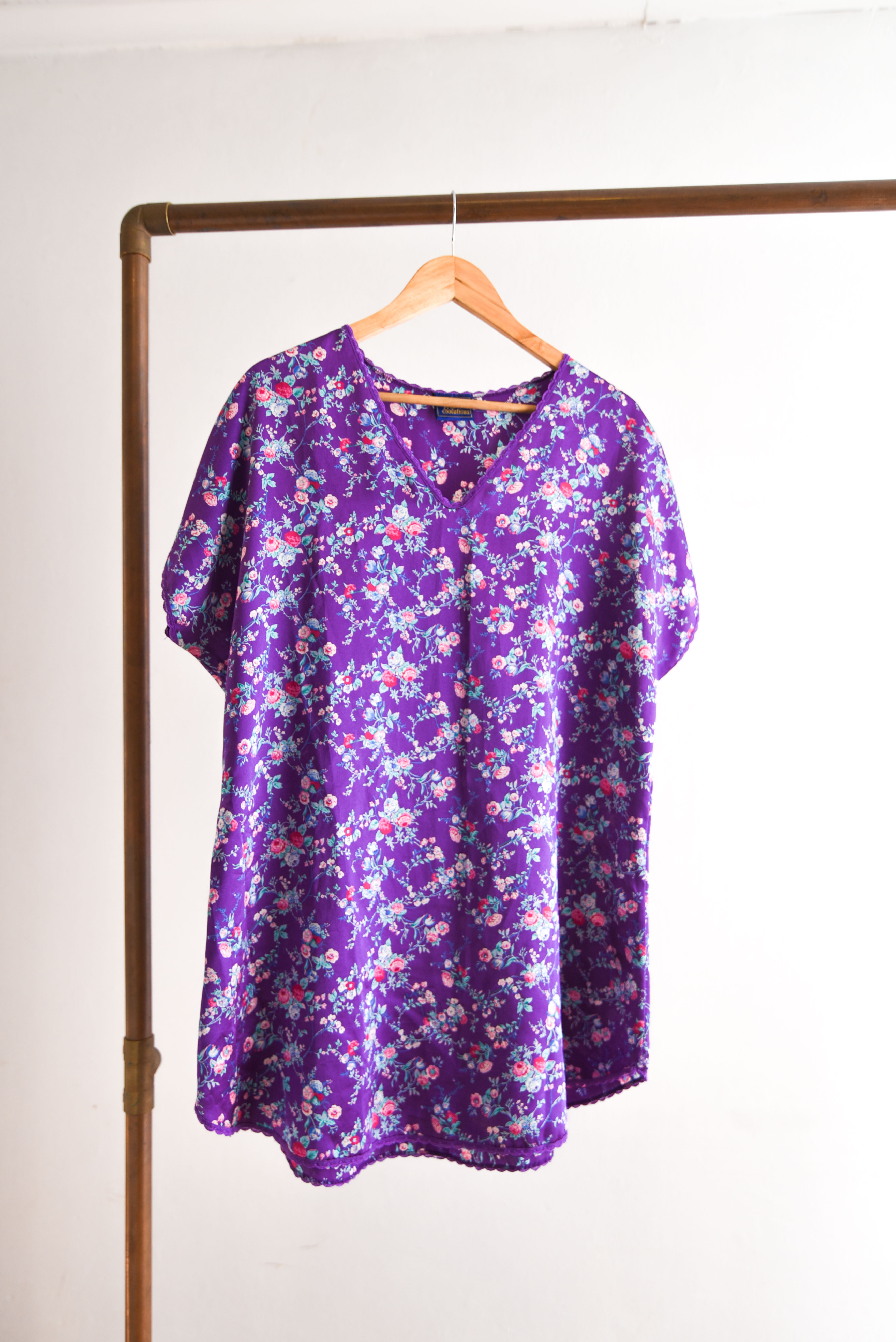 Hermosa camisola vintage en color morado, tiene diseño floral y manga corta.