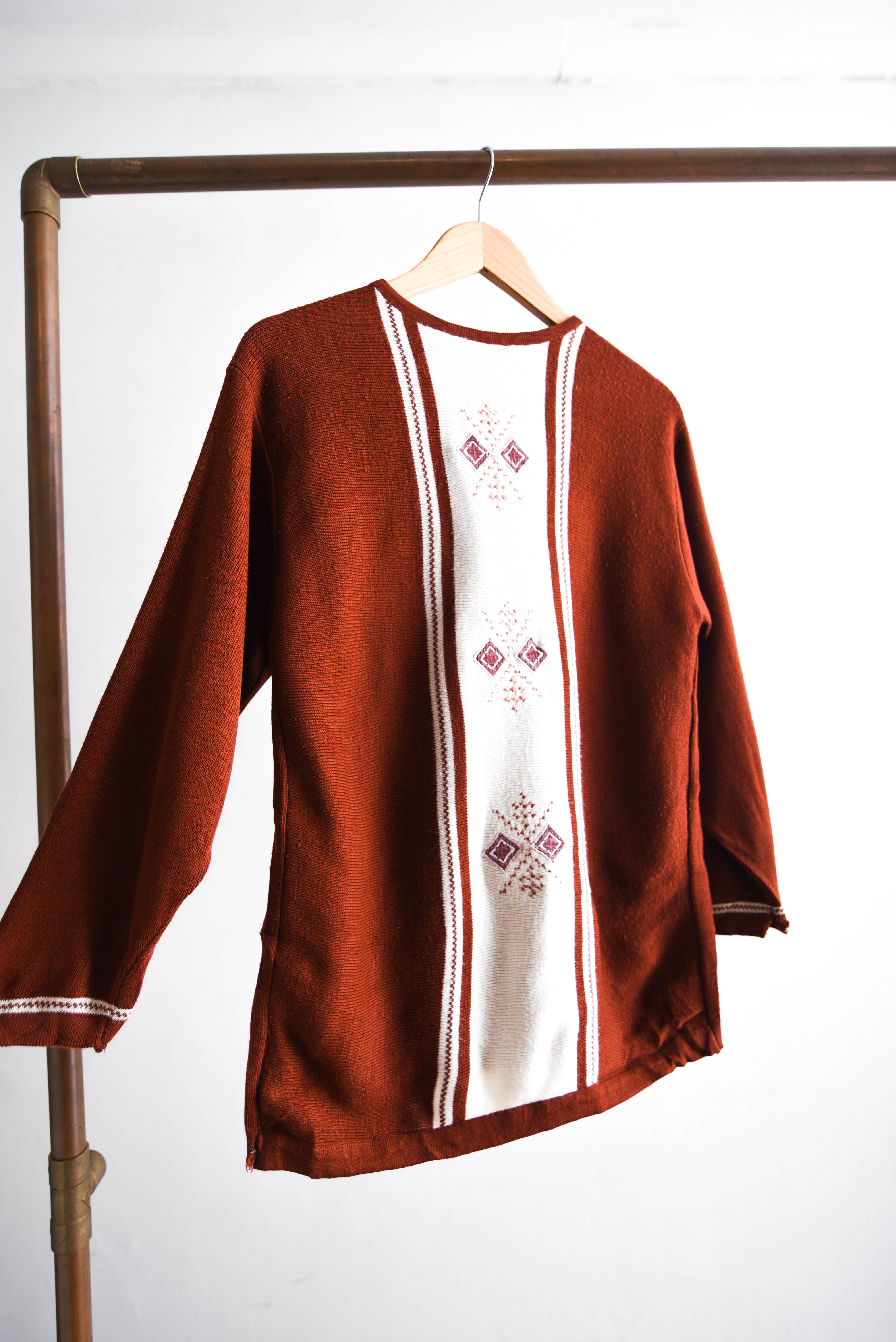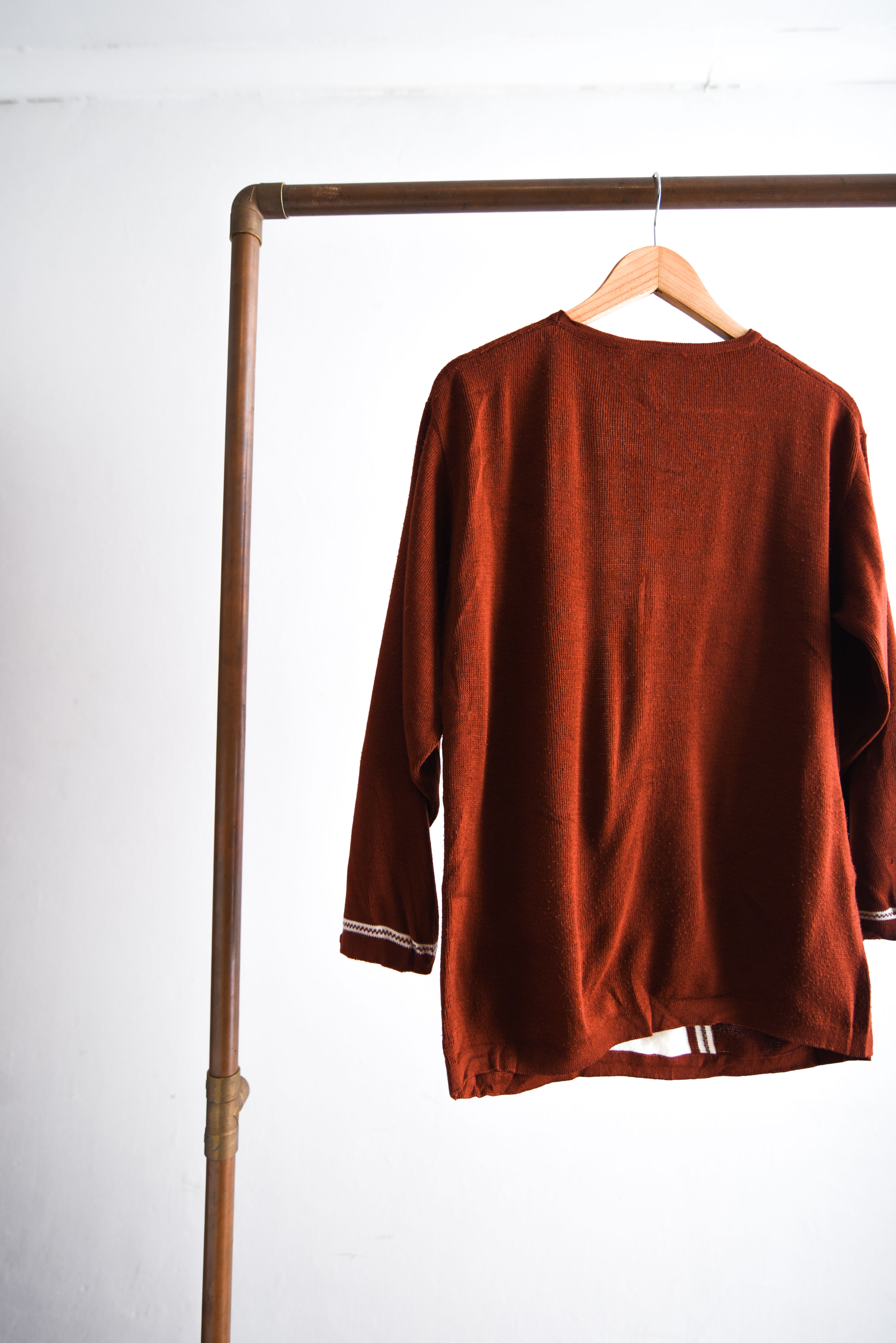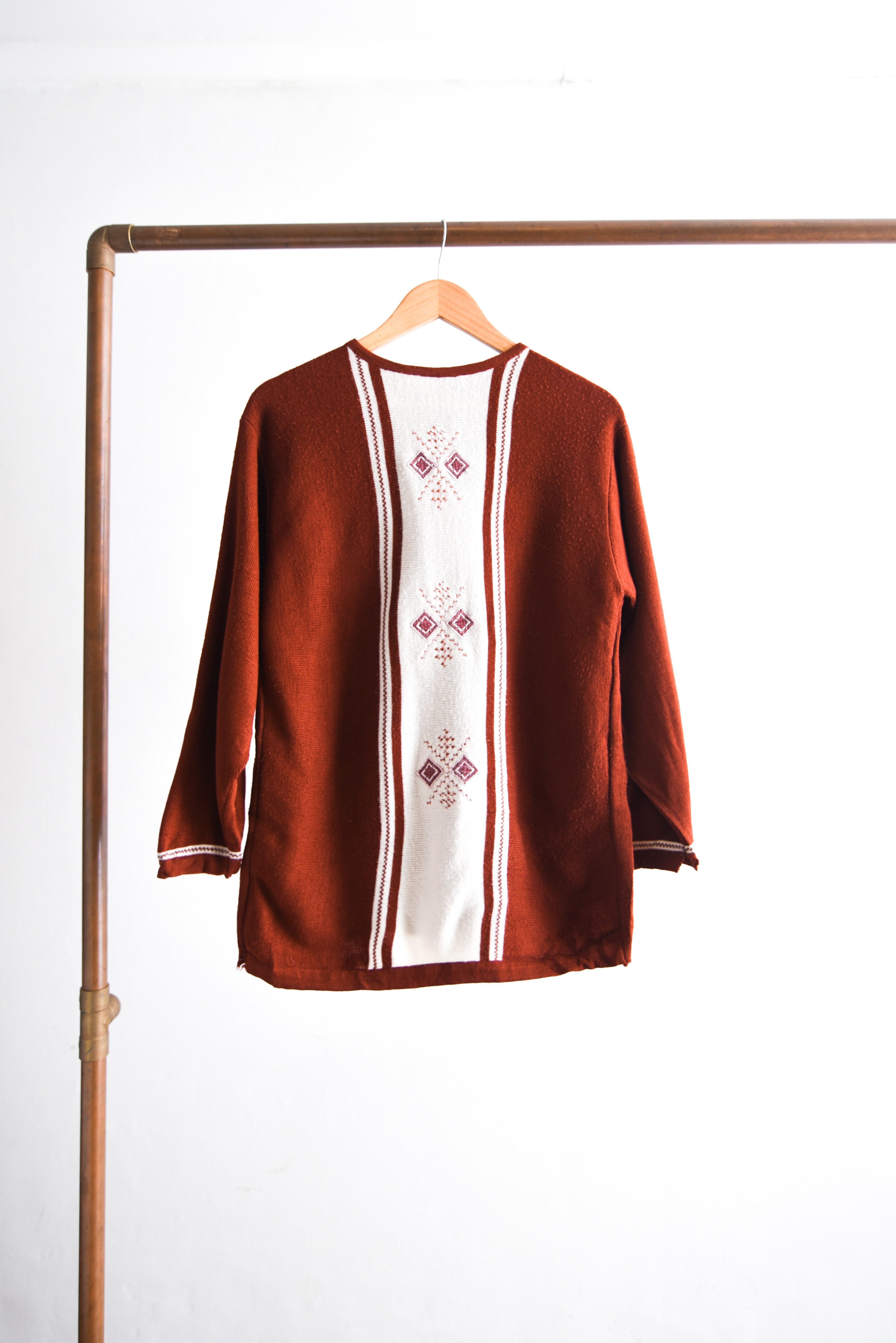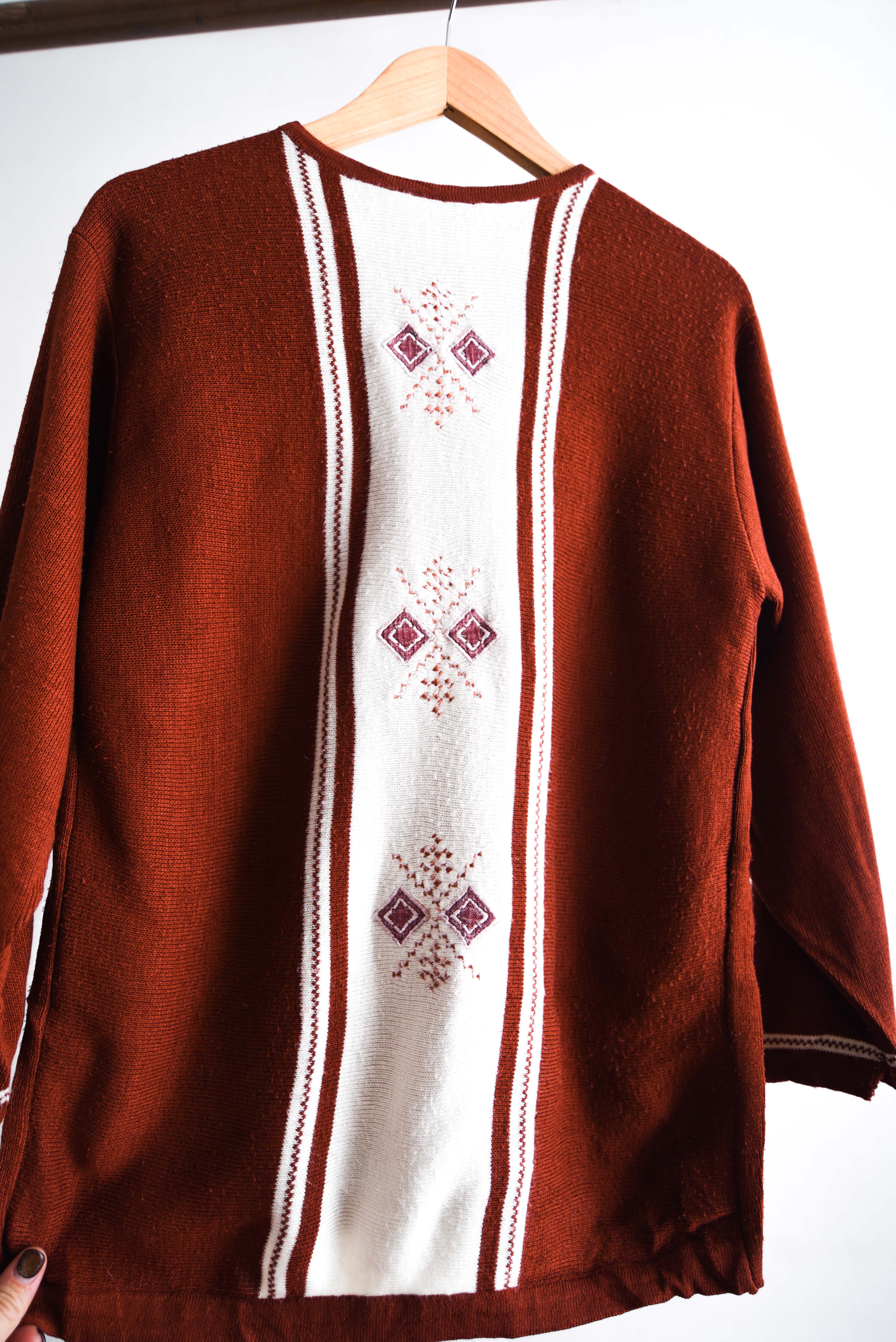Bello chaleco vintage en color granate, tiene franja blanca en el delantero y diseño bordado.