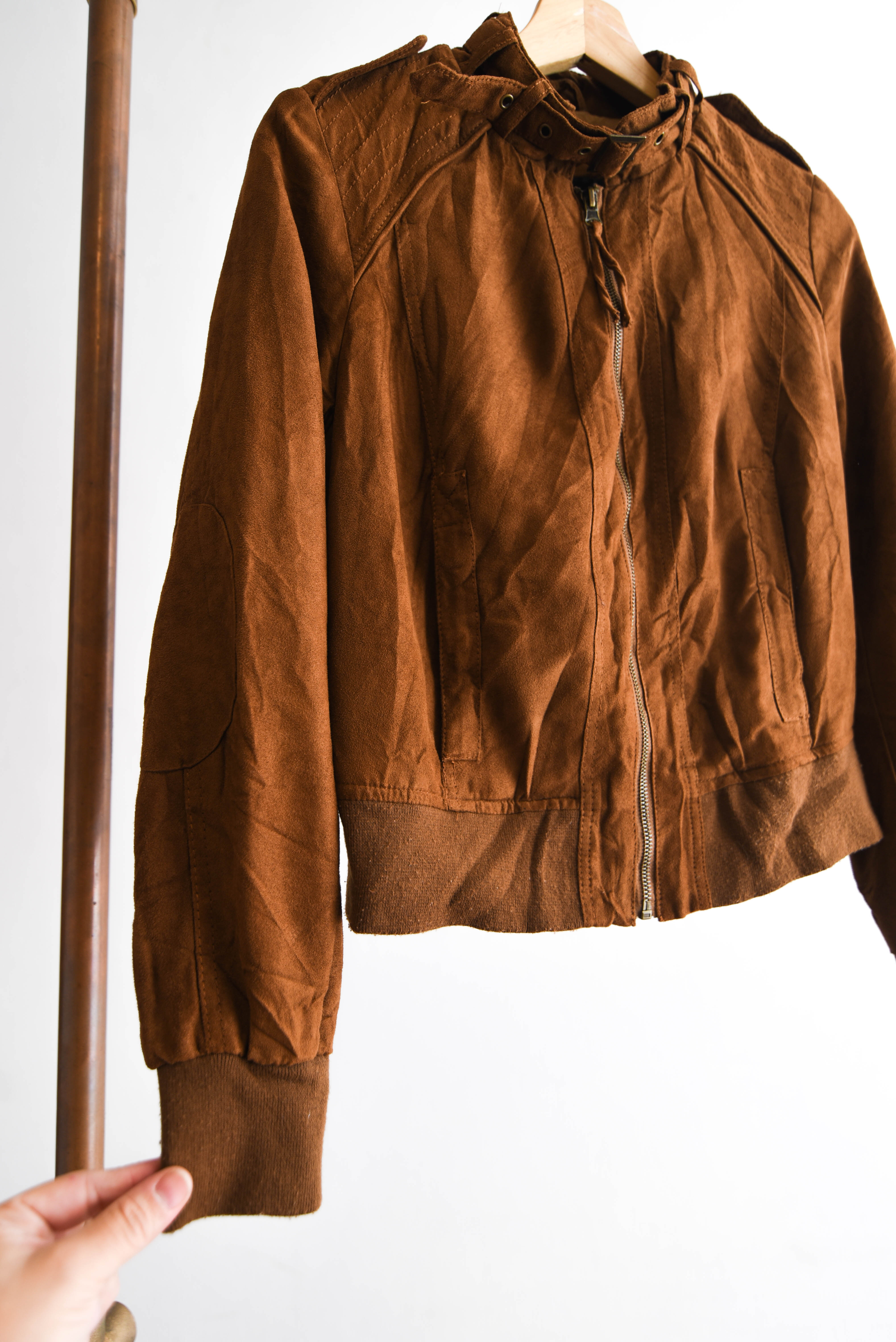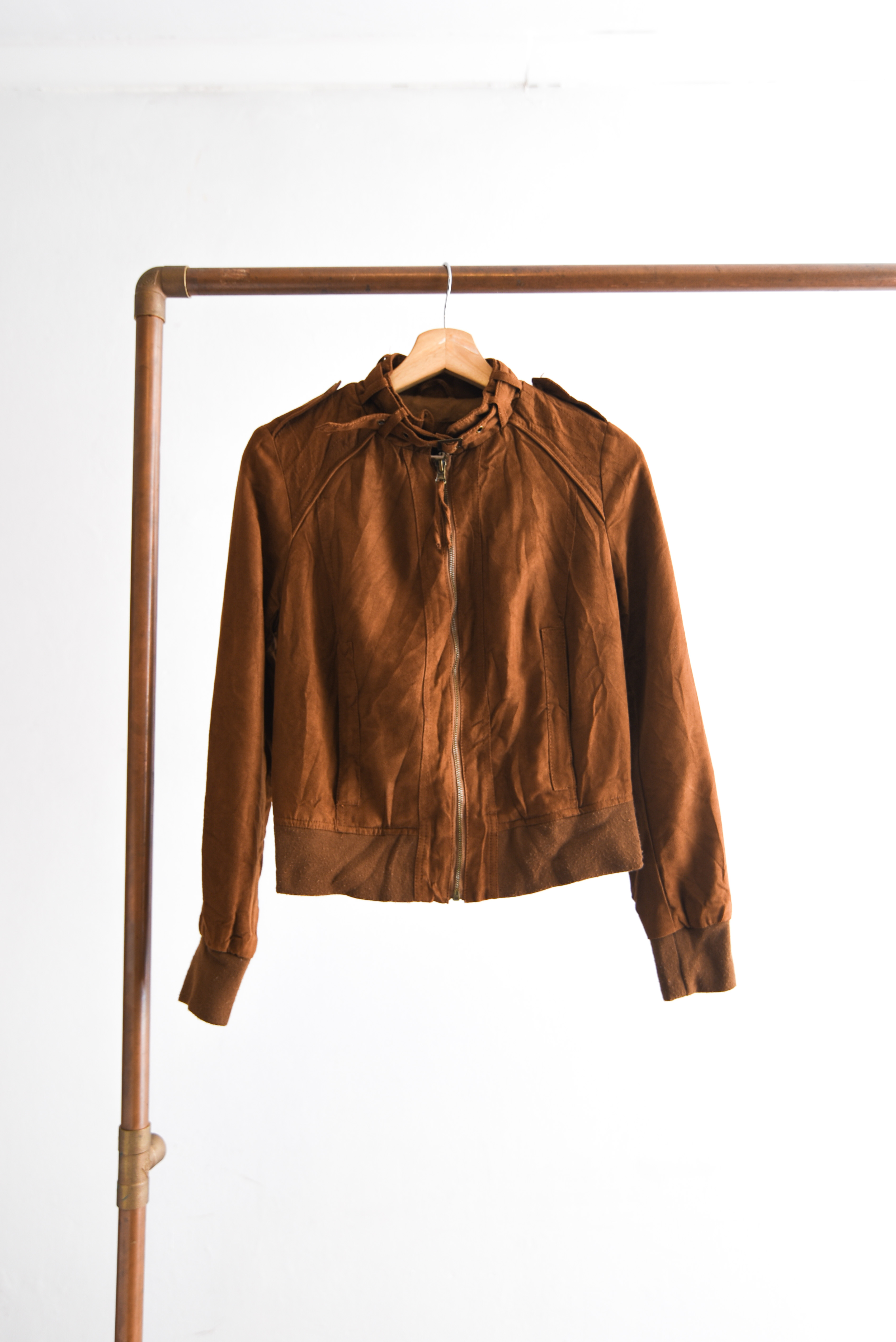 Bonita chaqueta estilo bomber jacket, color camel de tela simil gamuza, con cierre delantero y bolsillos.