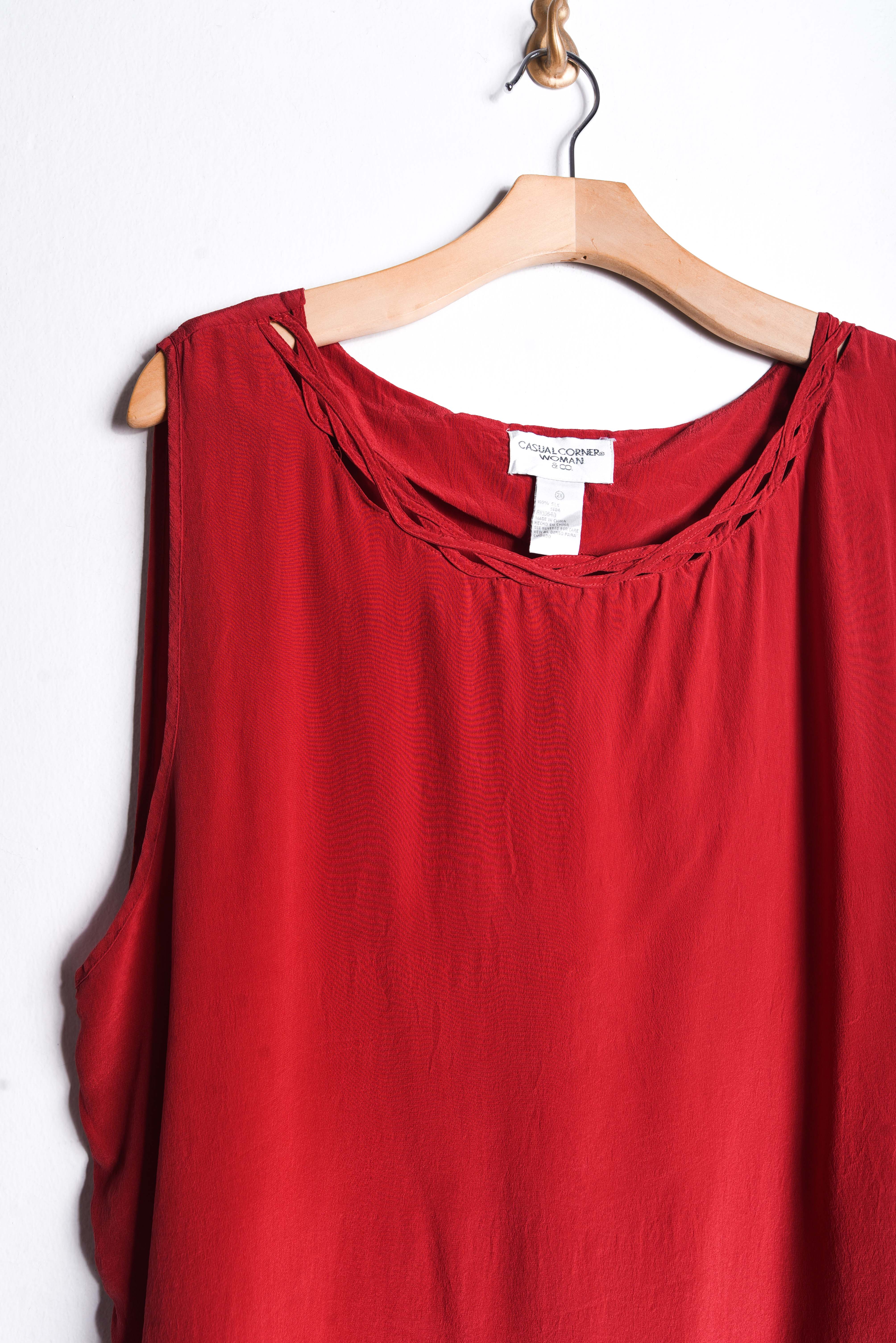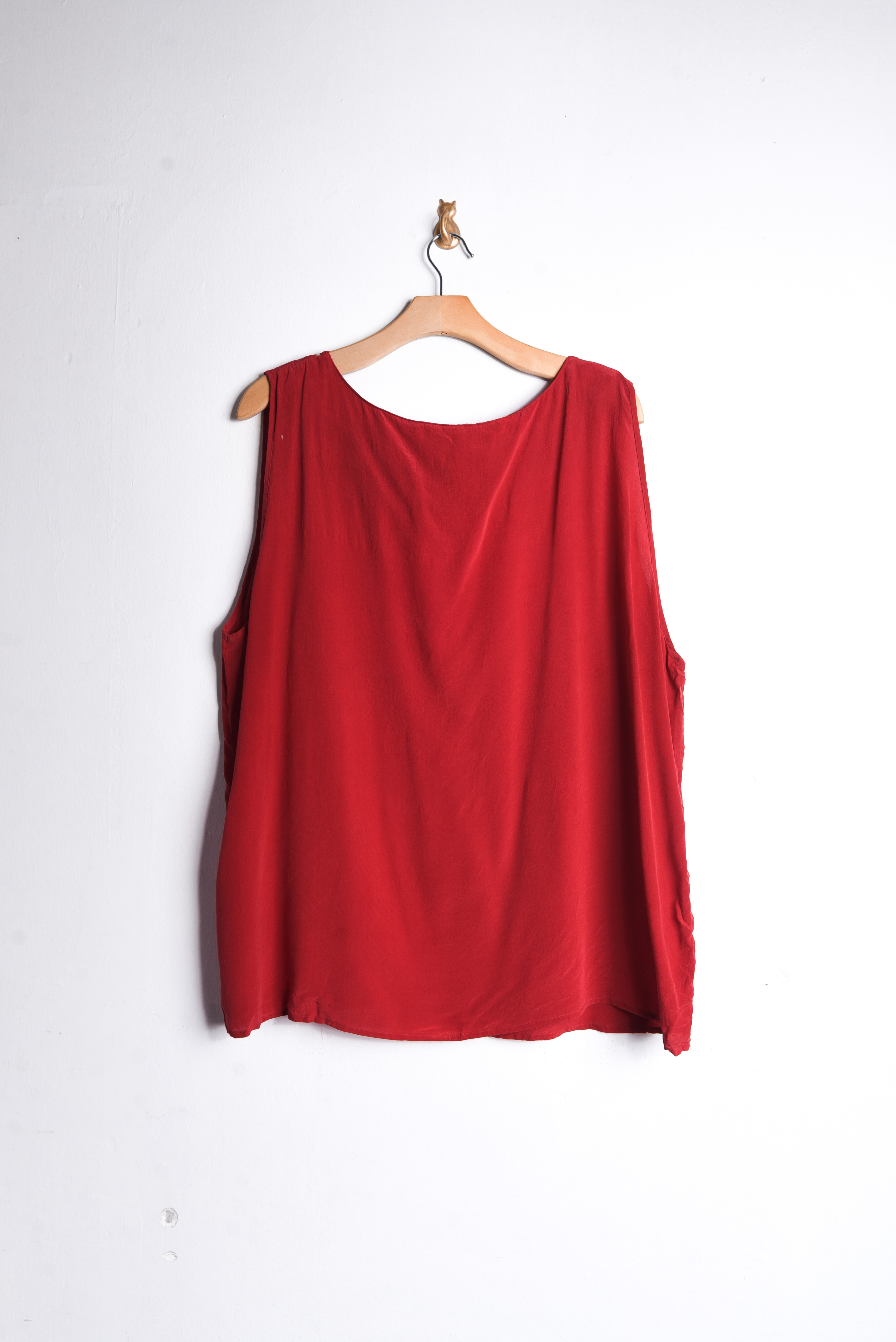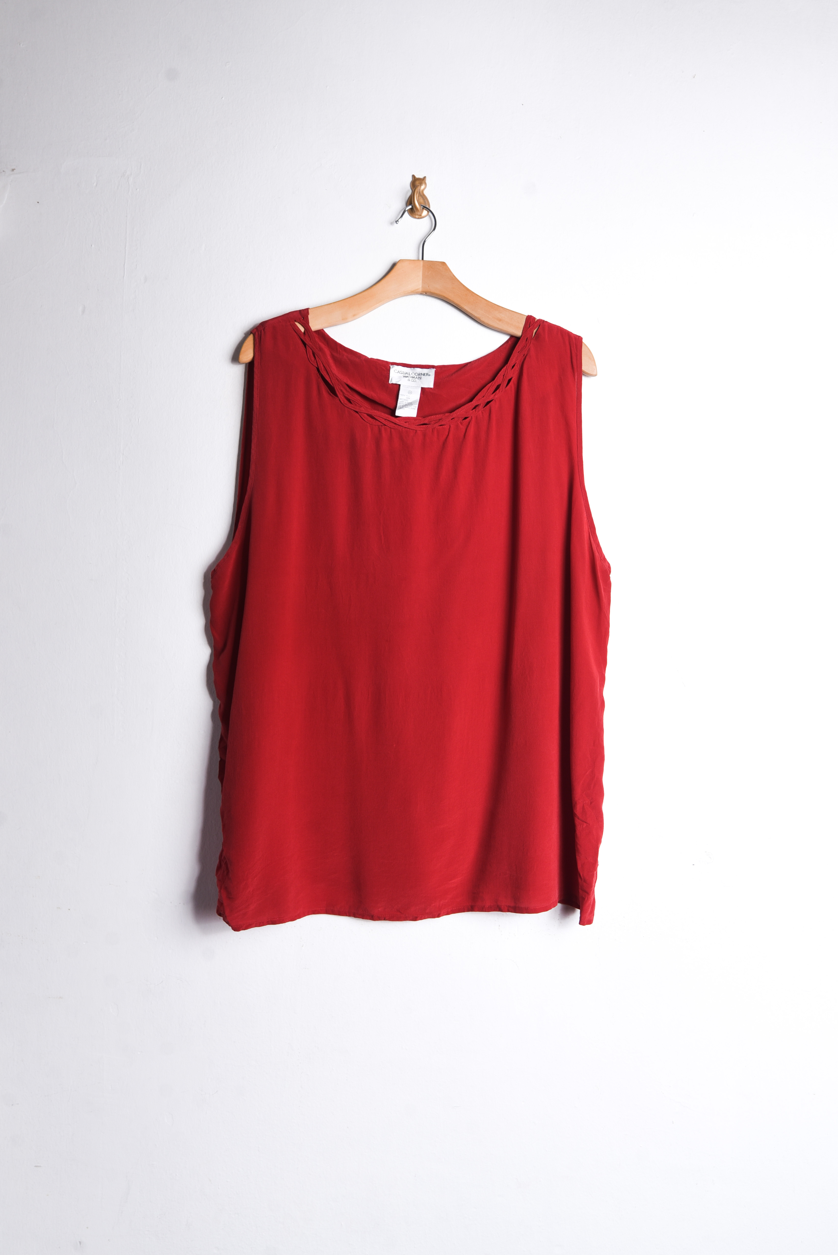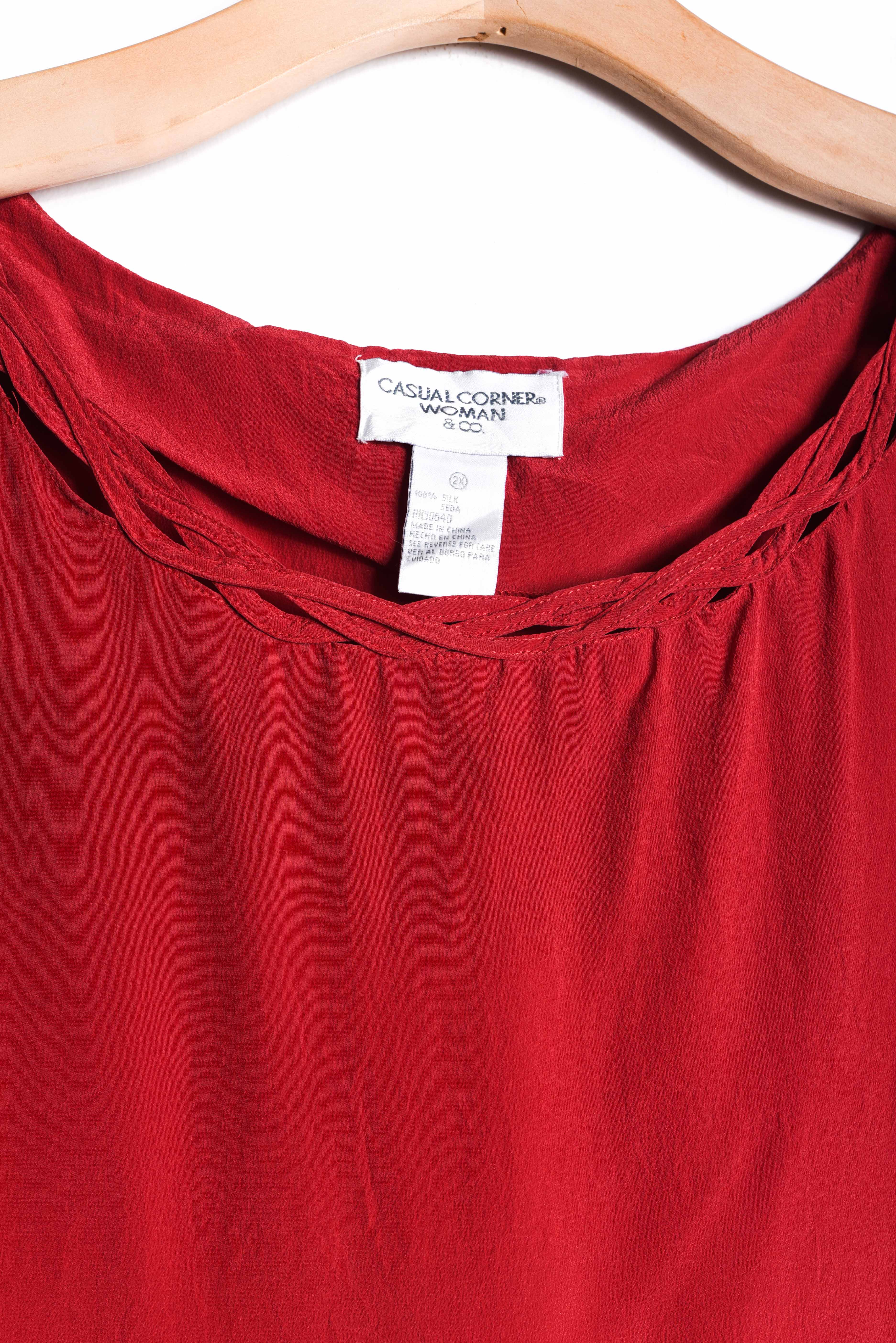 Hermosa blusa vintage sin mangas, color rojo con detalle trenzado en el escote y 100% seda.