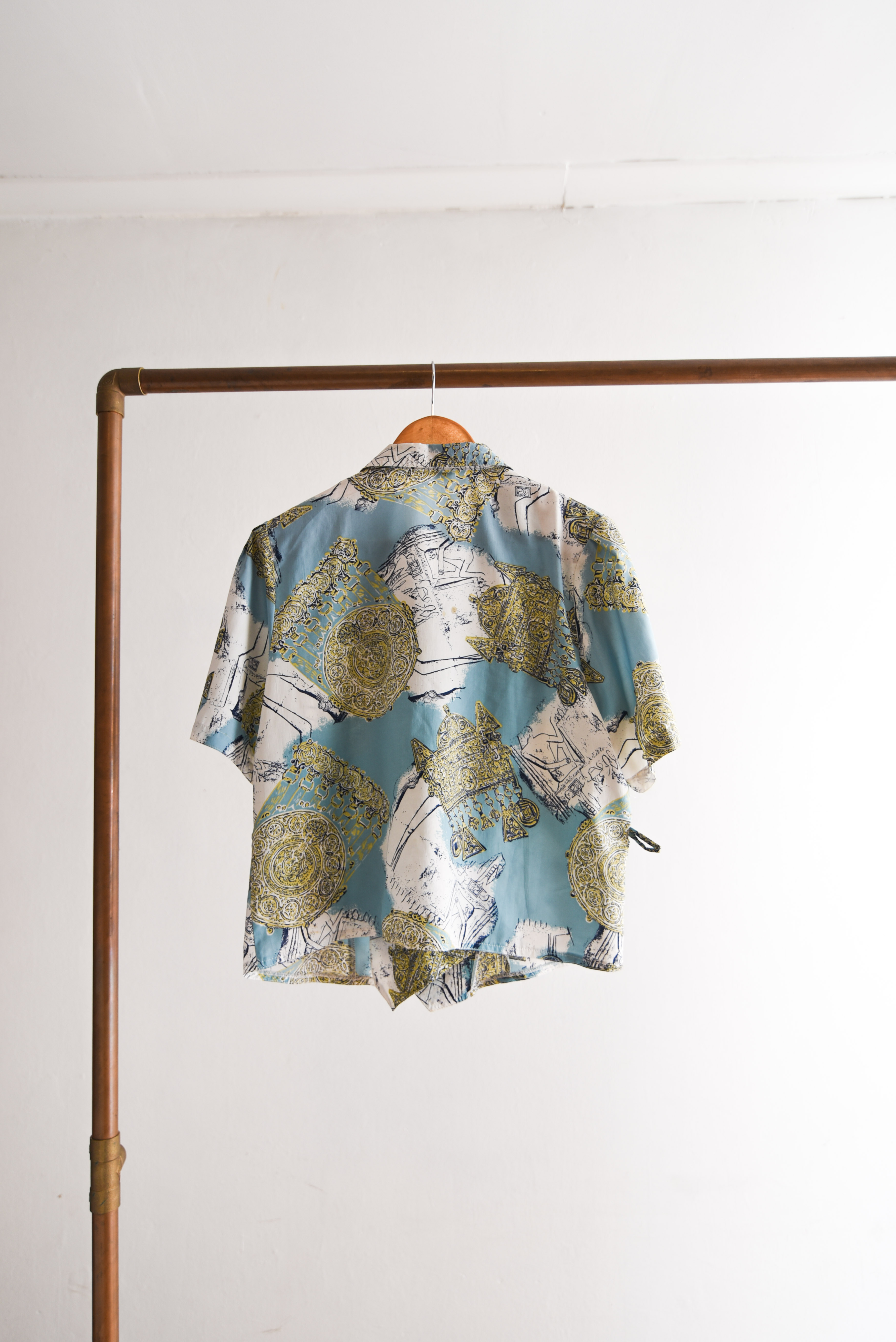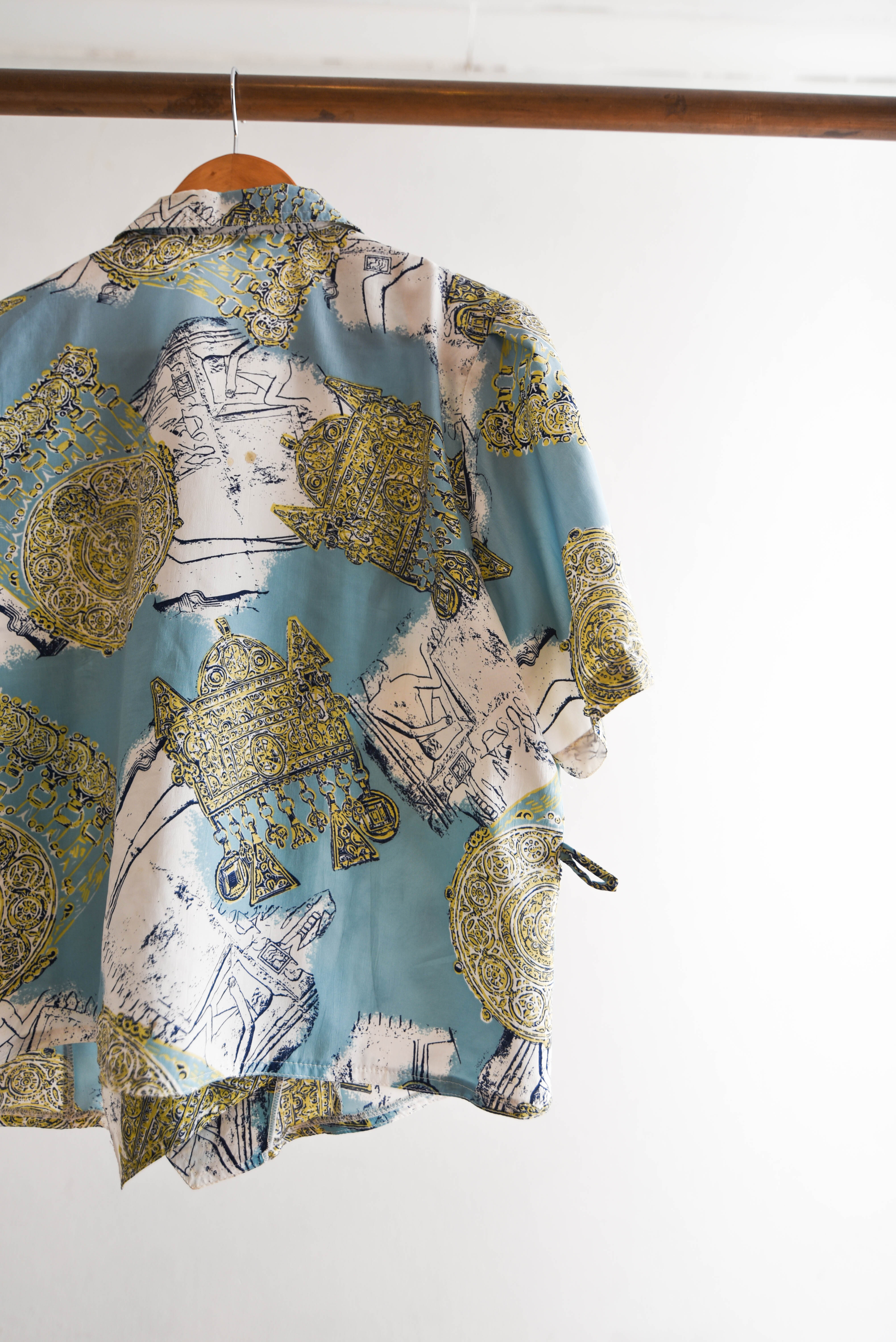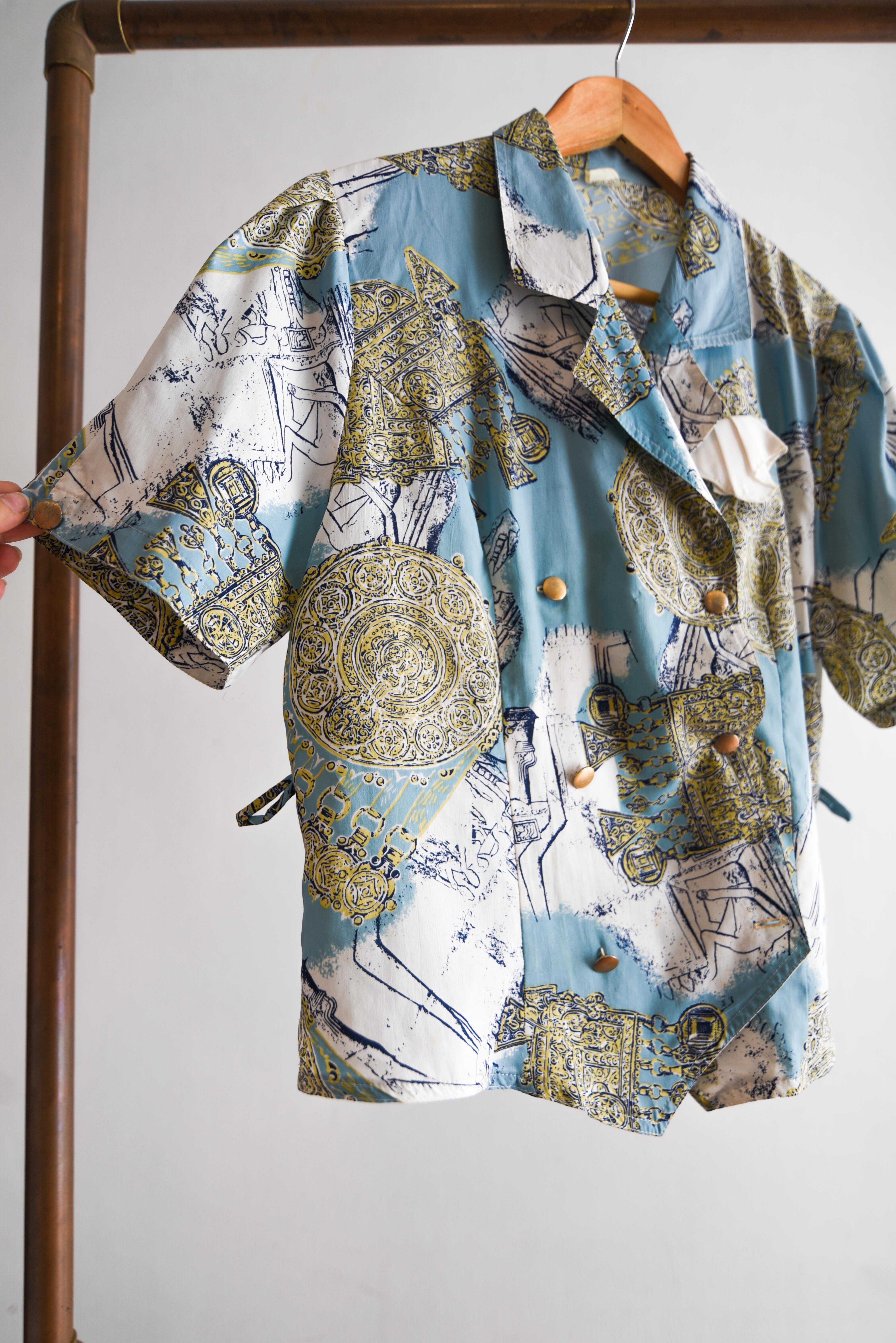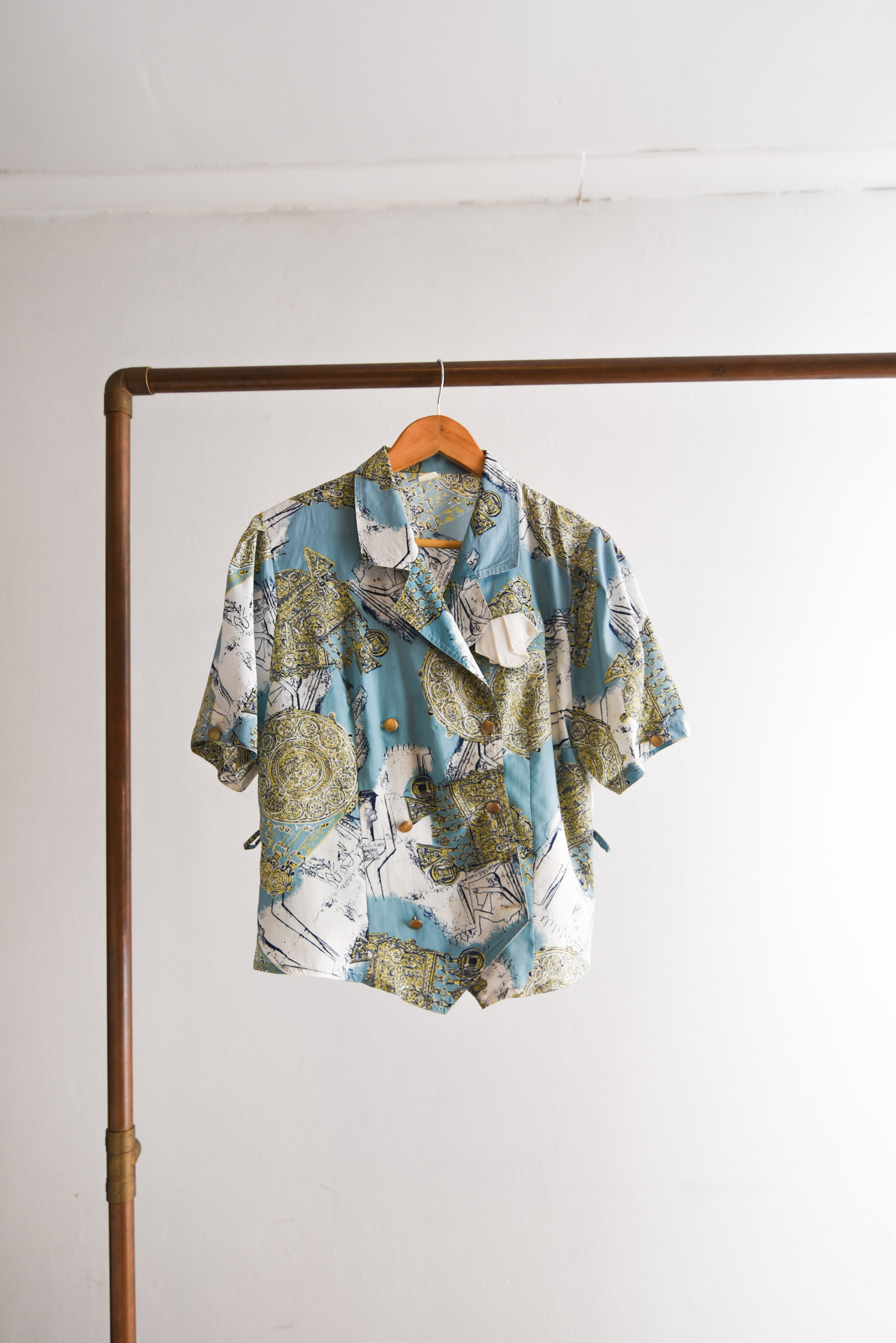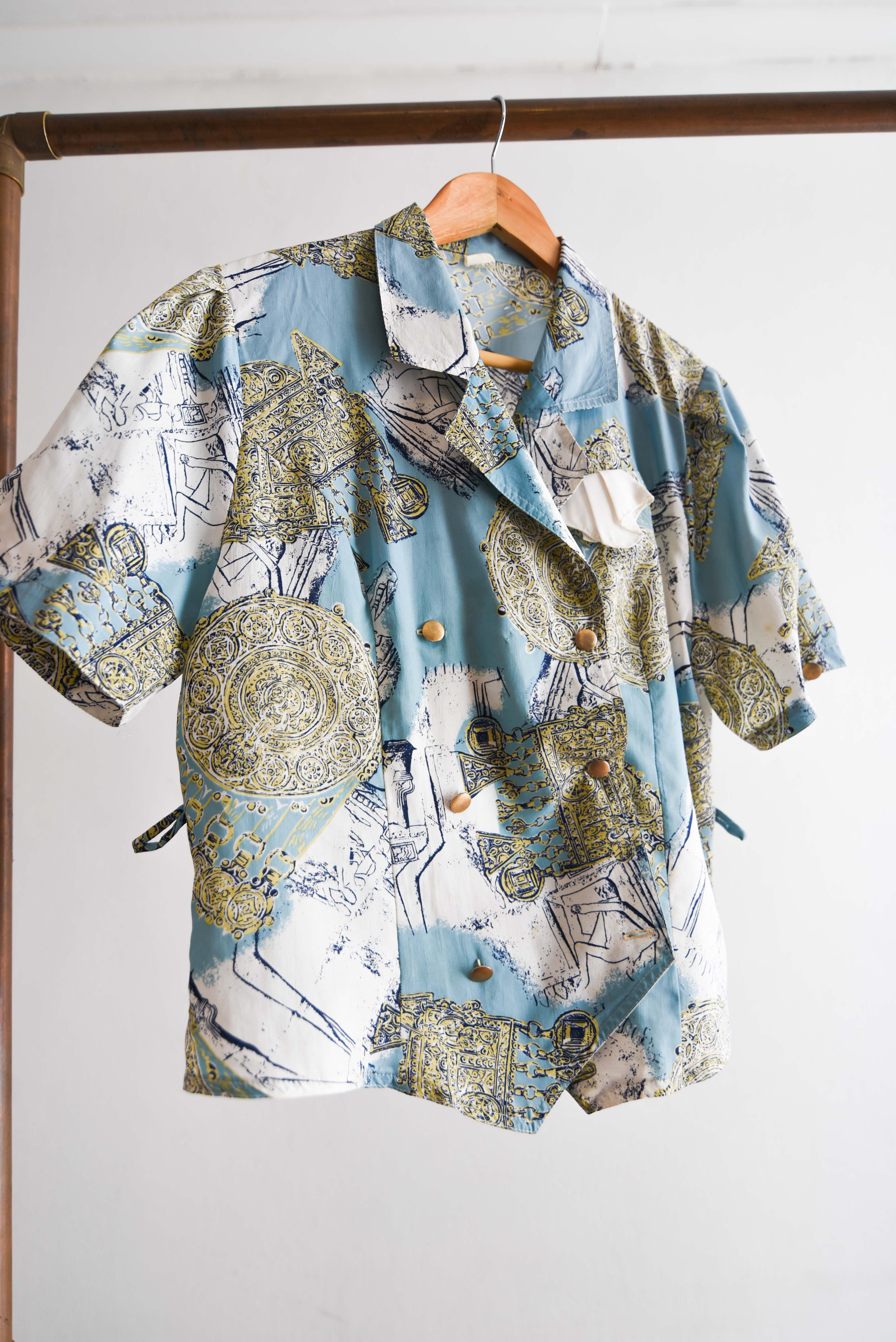 Bella blusa vintage en color celeste, tiene diseño barroco y escote cruzado. 100% poliéster