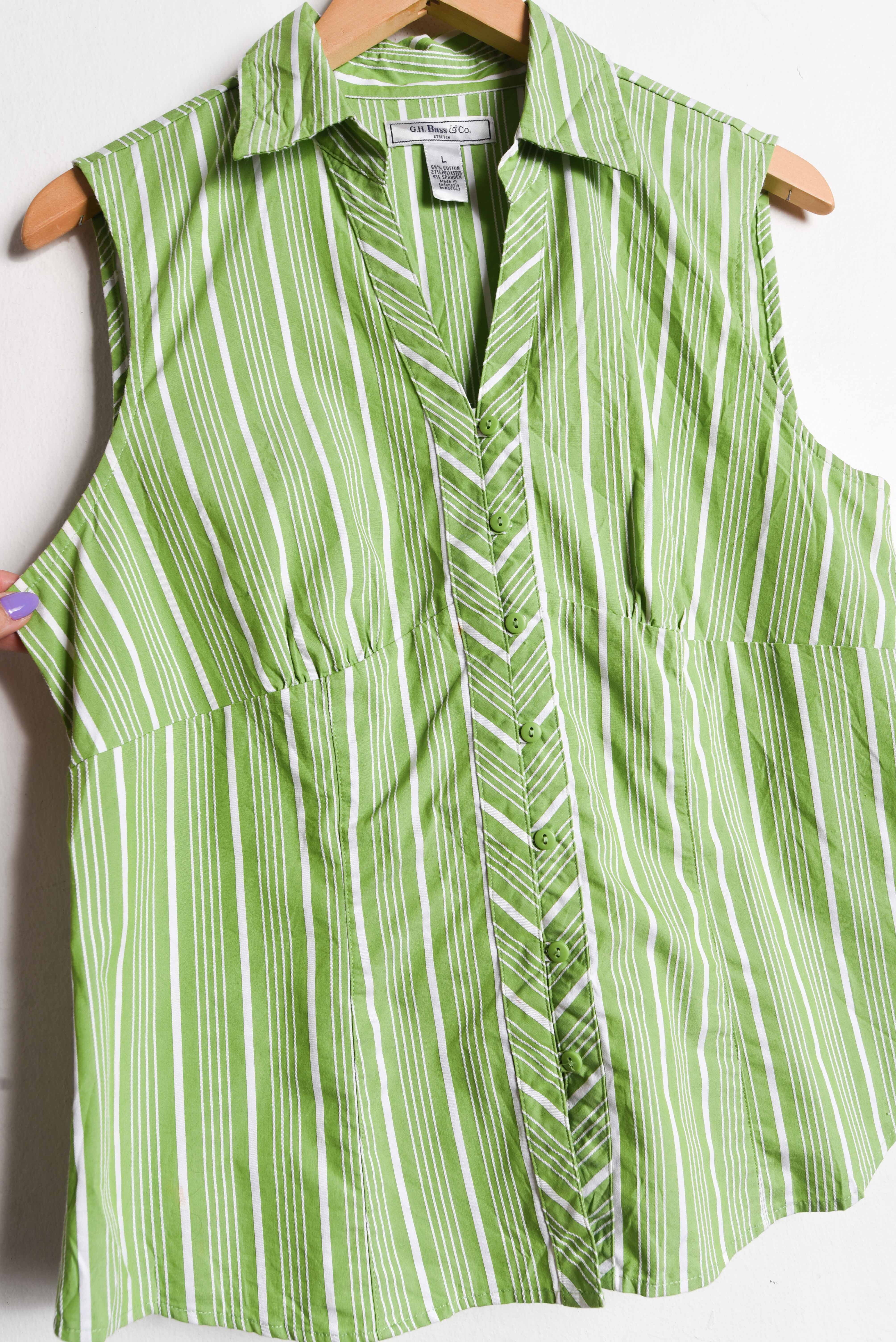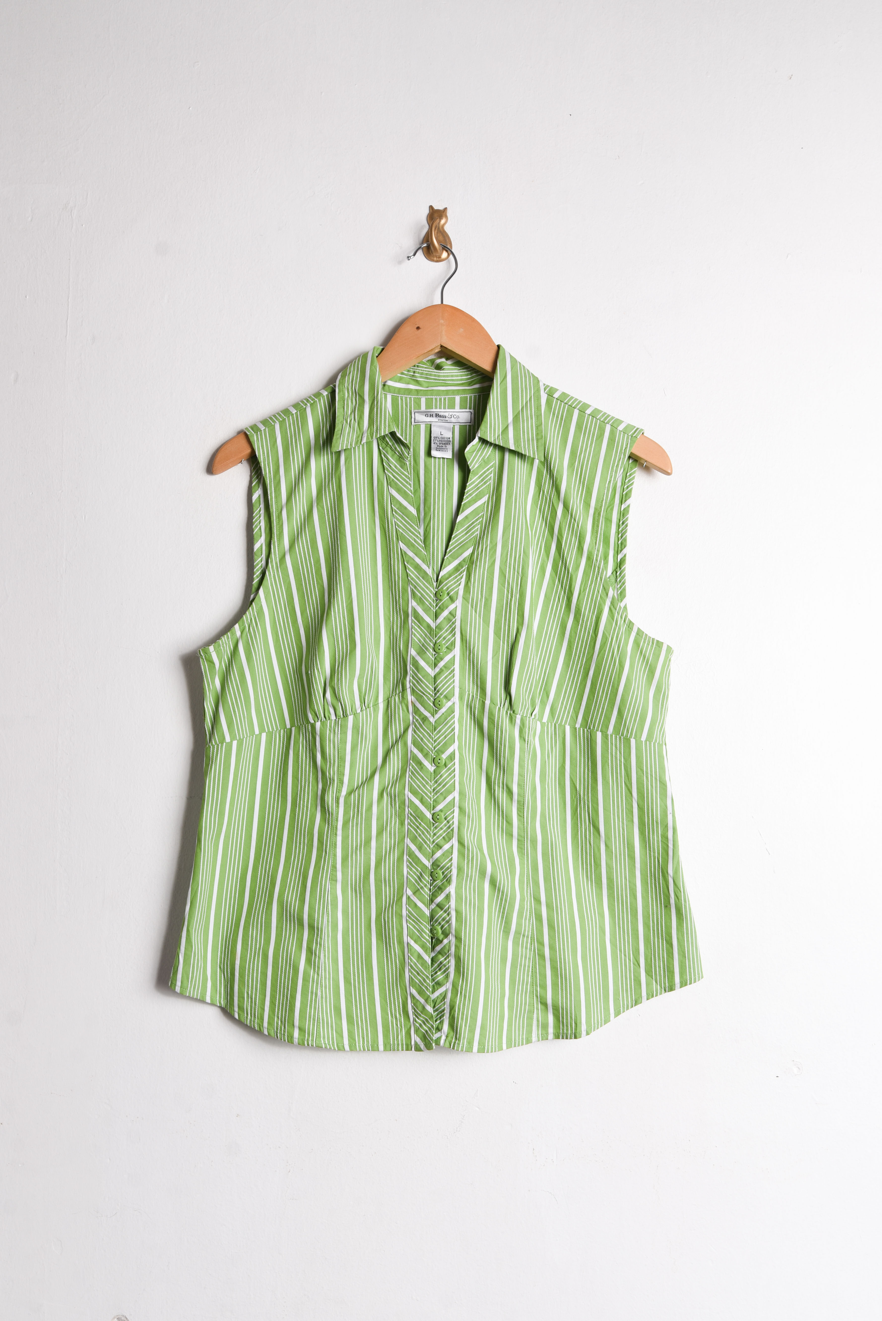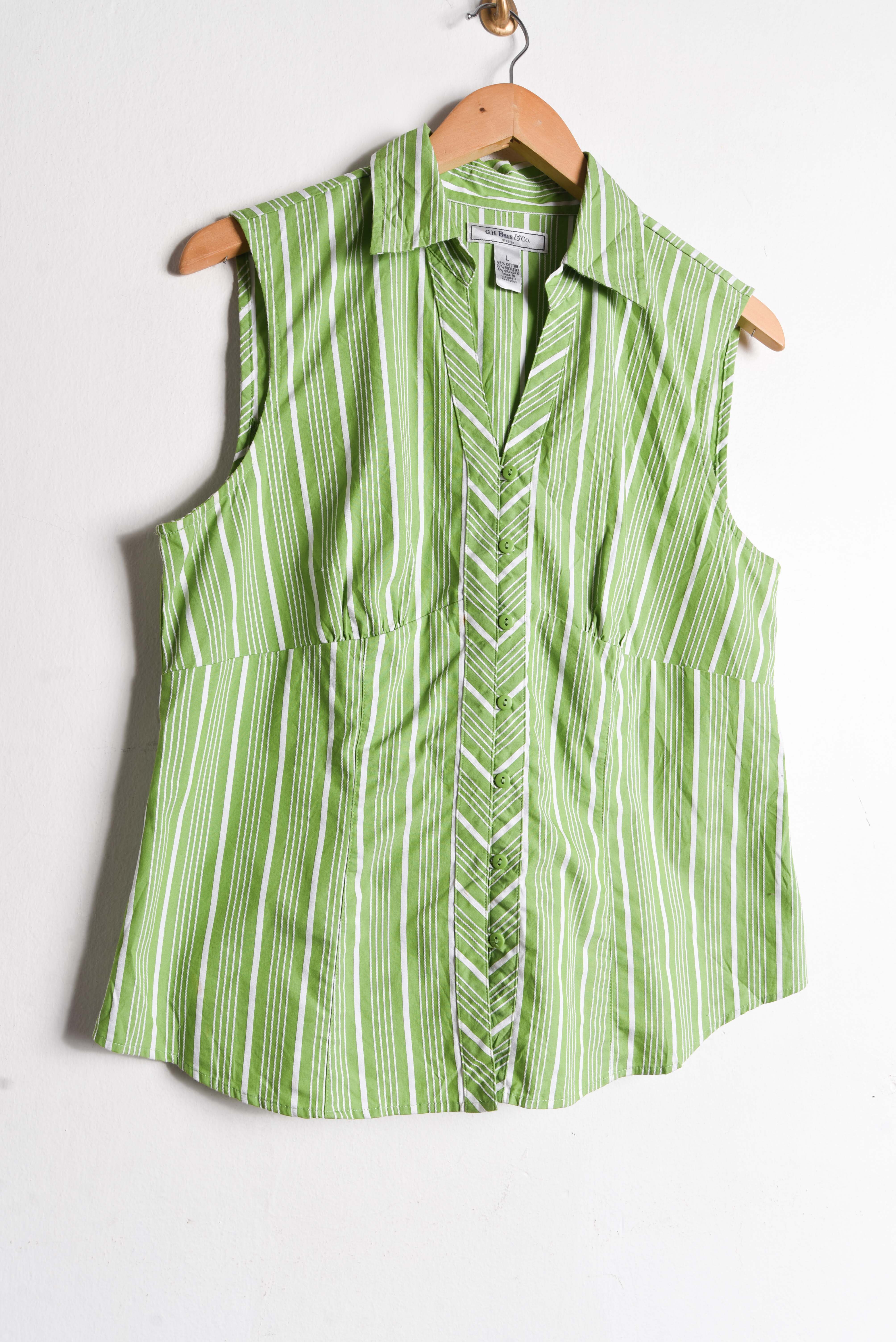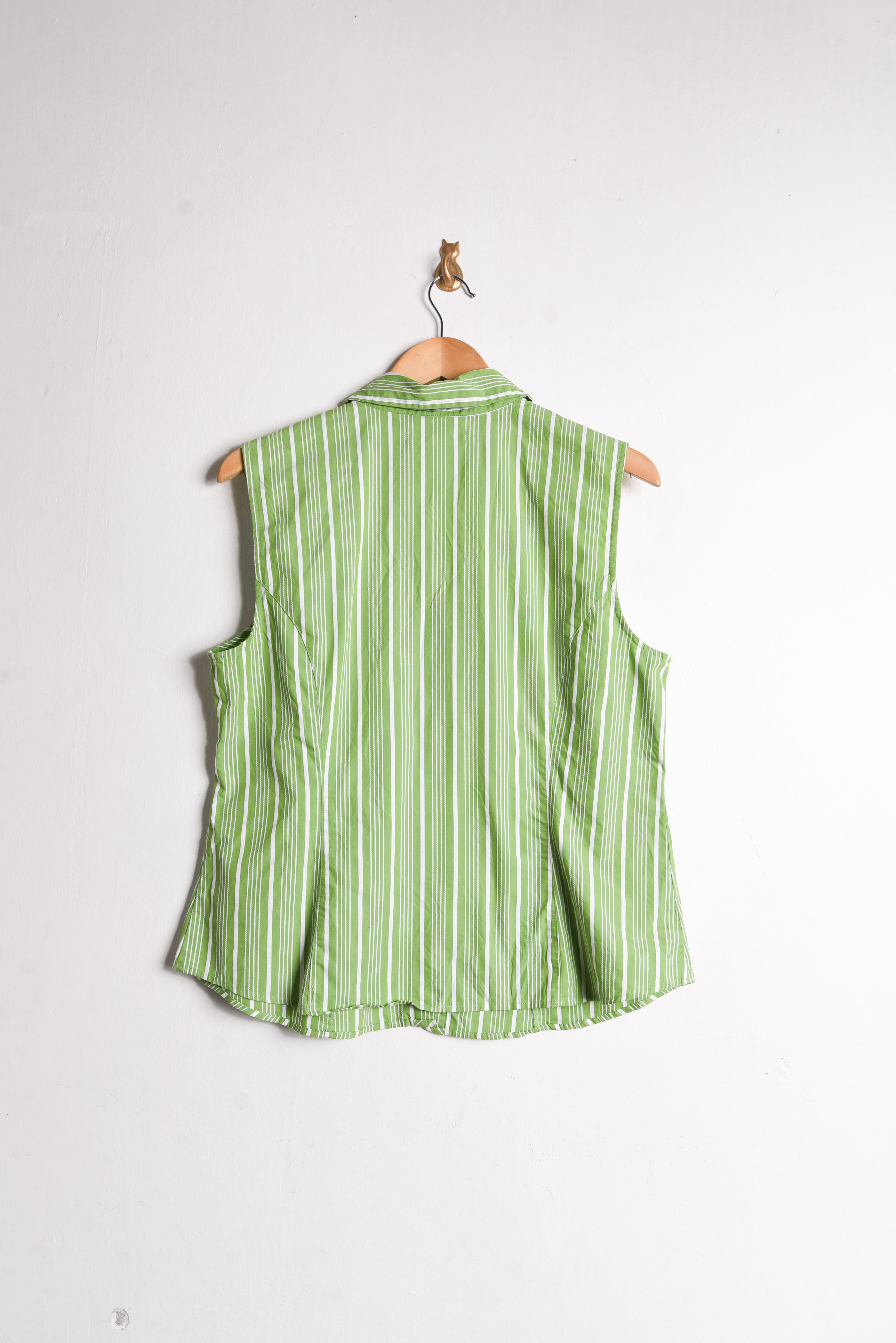 Hermosa blusa sin mangas, color verde con botones y diseño rayado. 69% algodón, 27% poliéster y 4% spandex.