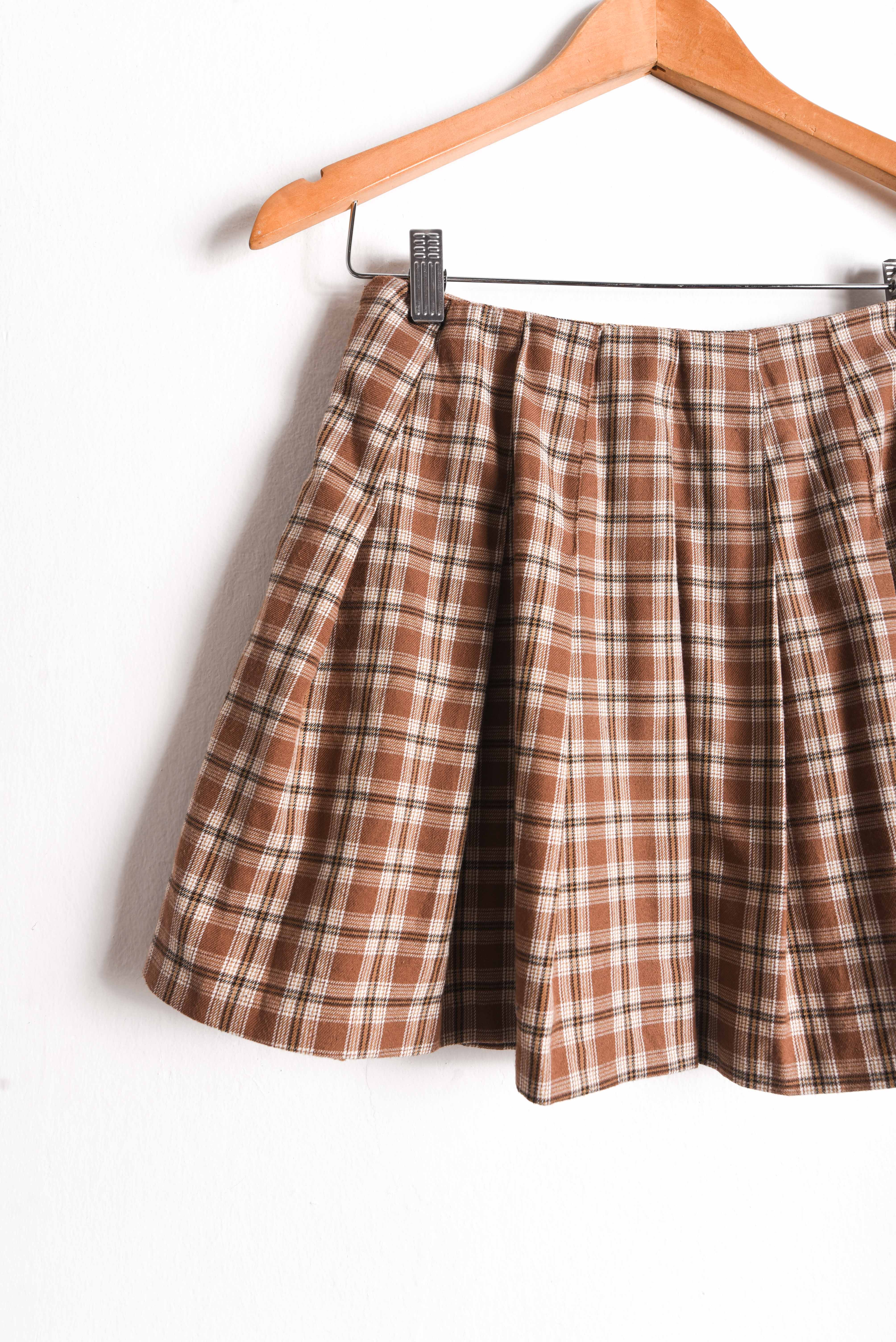 Hermosa falda a la cintura, color café con tablas y diseño tartán. 98% poliéster y 2% spandex.