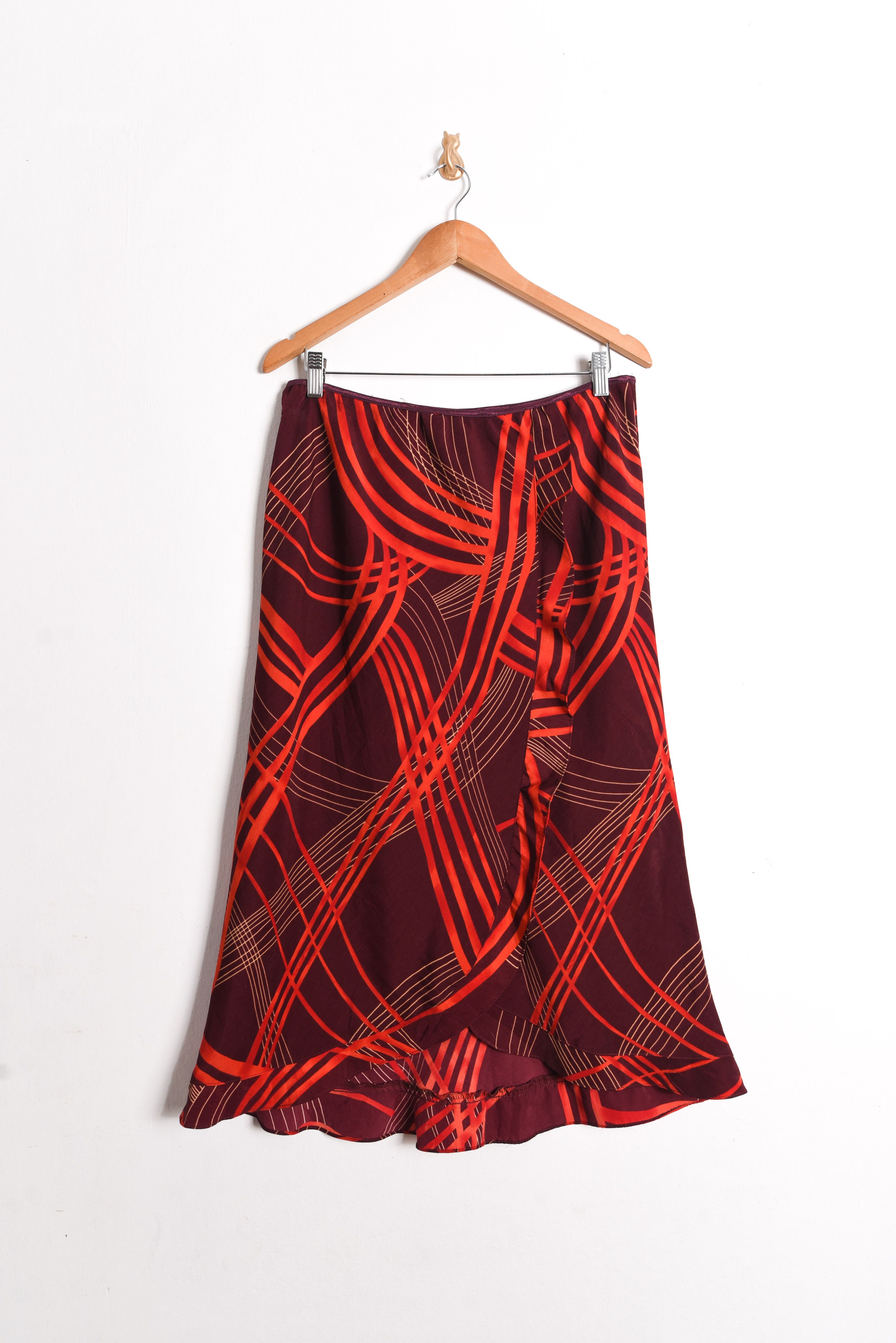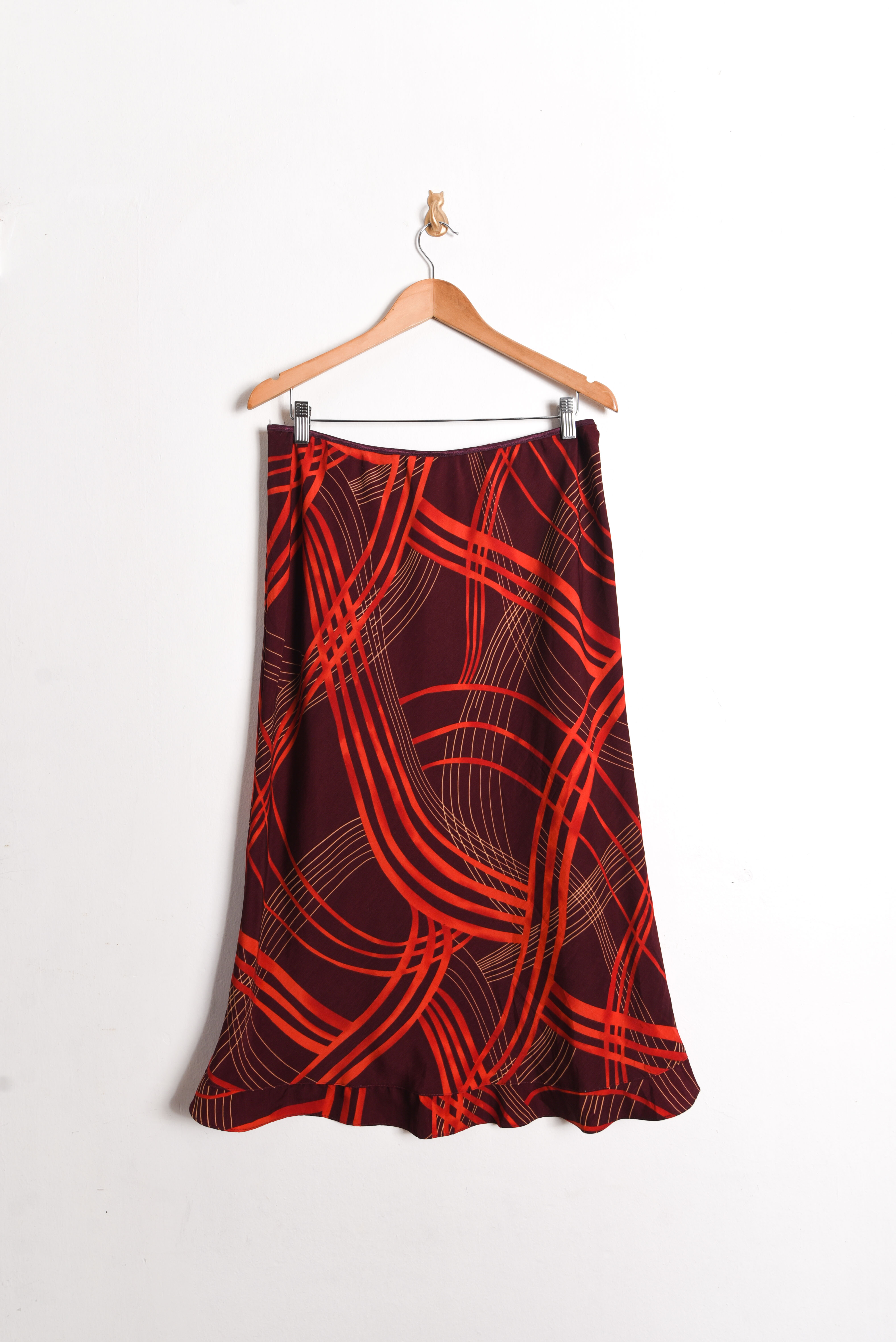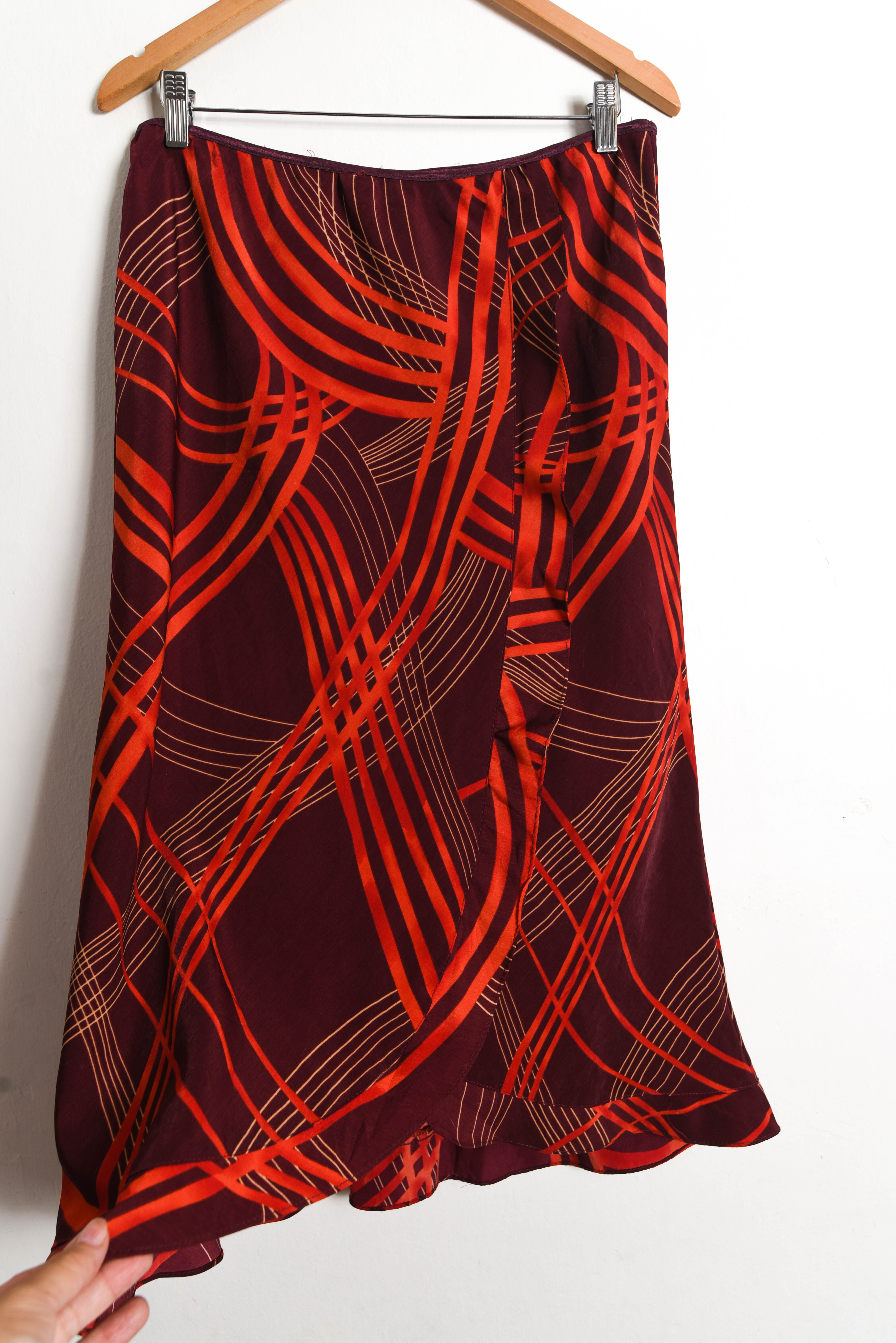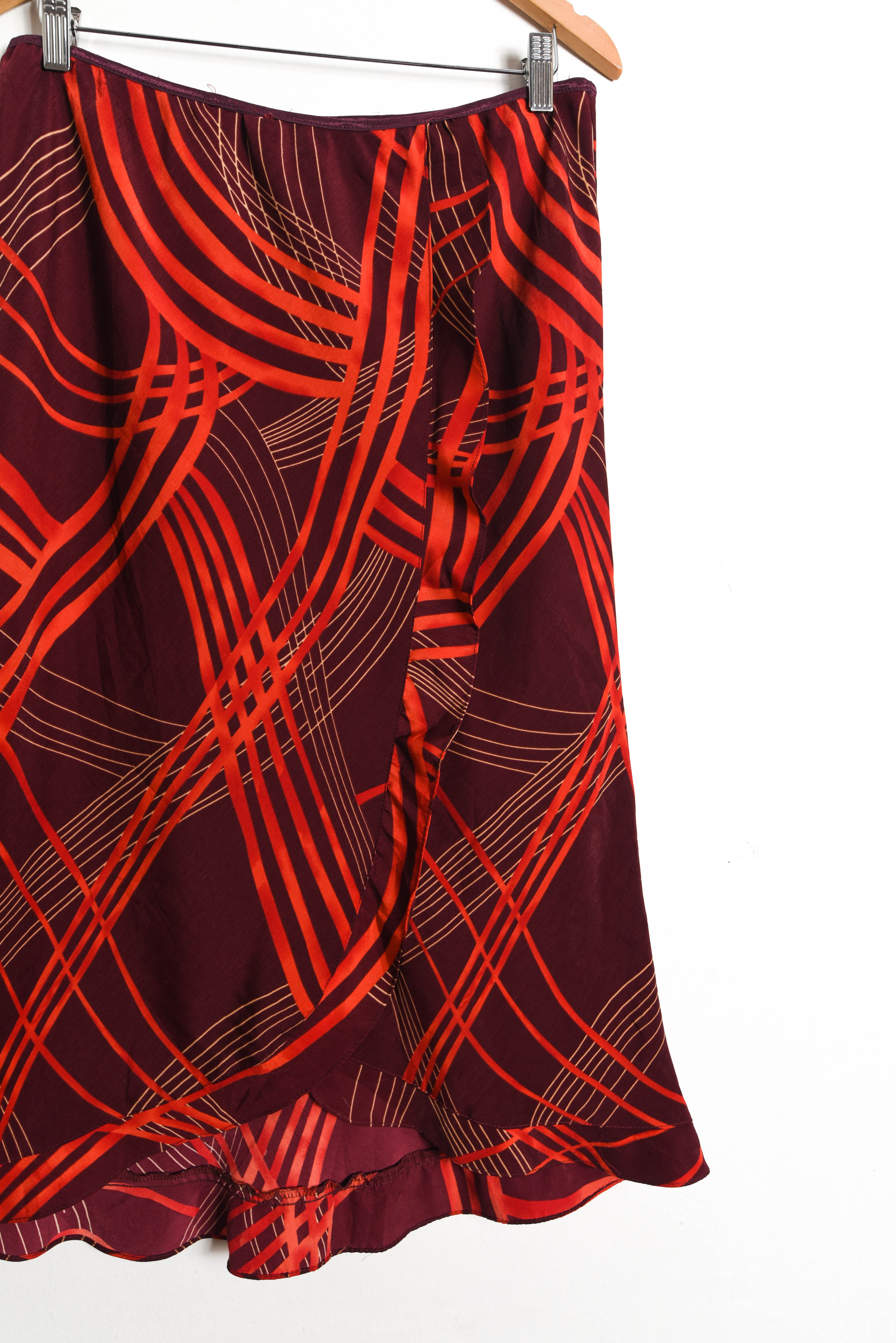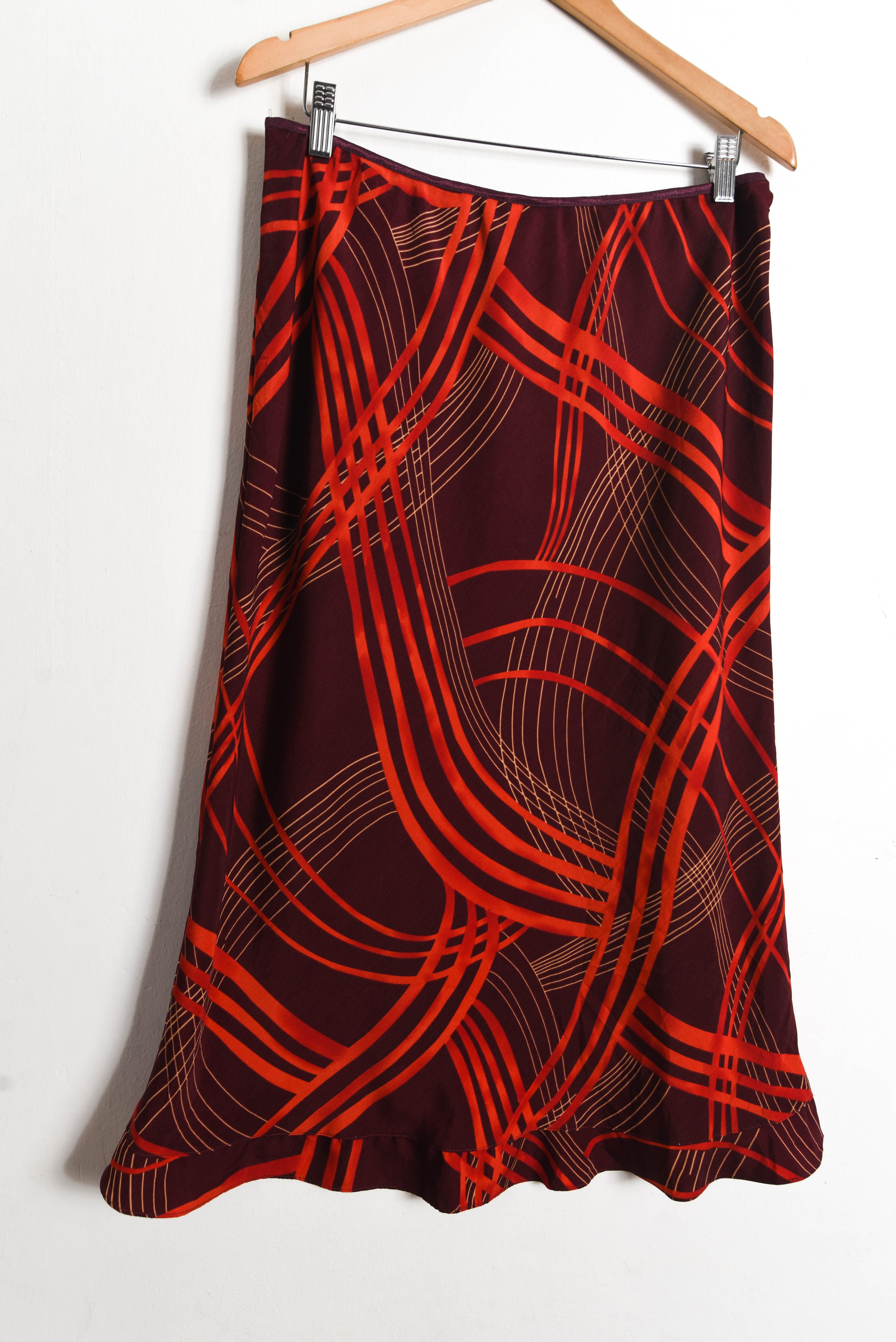 Bella maxi falda vintage con diseño de ondas en tonos rojos, pretina elasticada y vuelos. 100% poliéster.