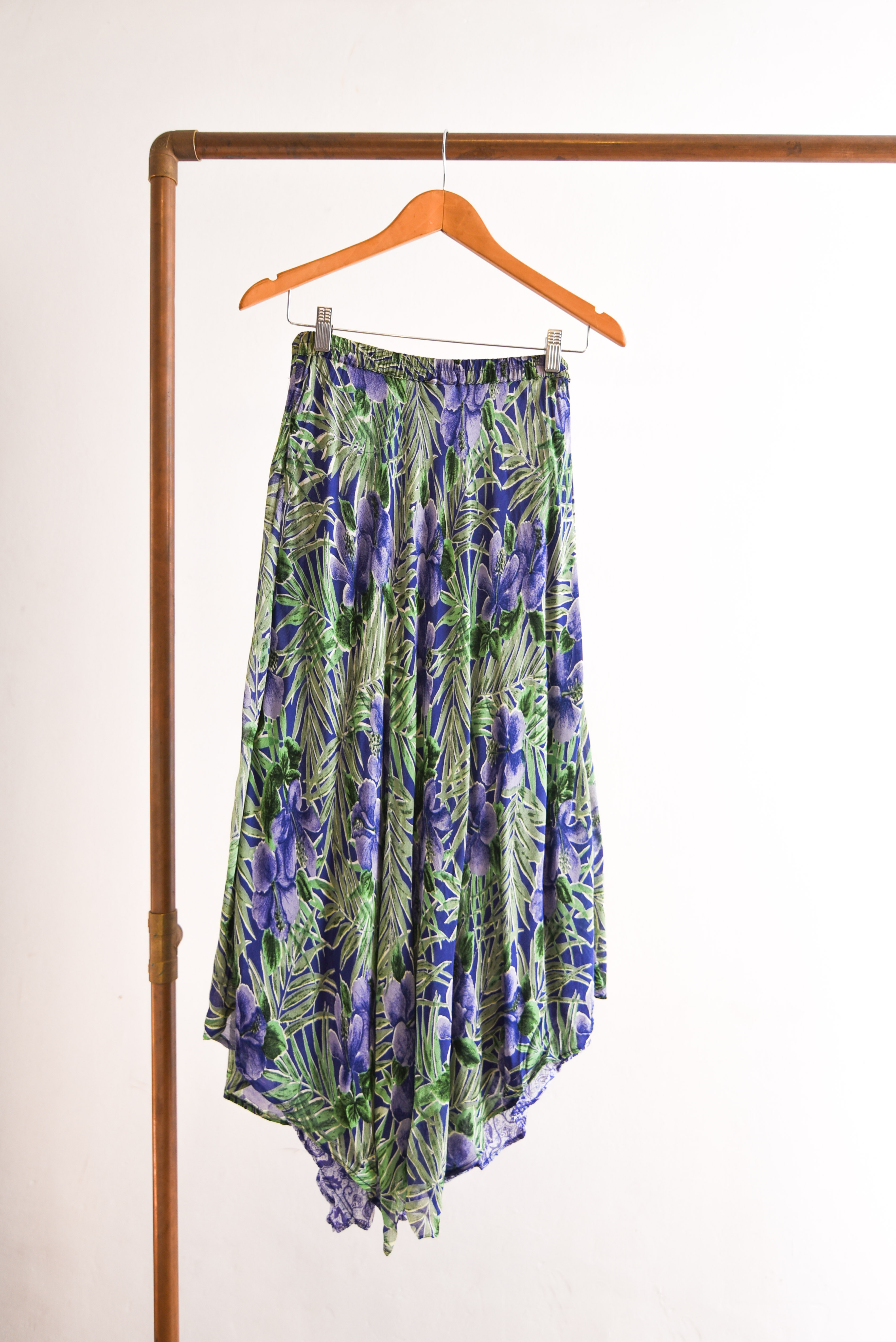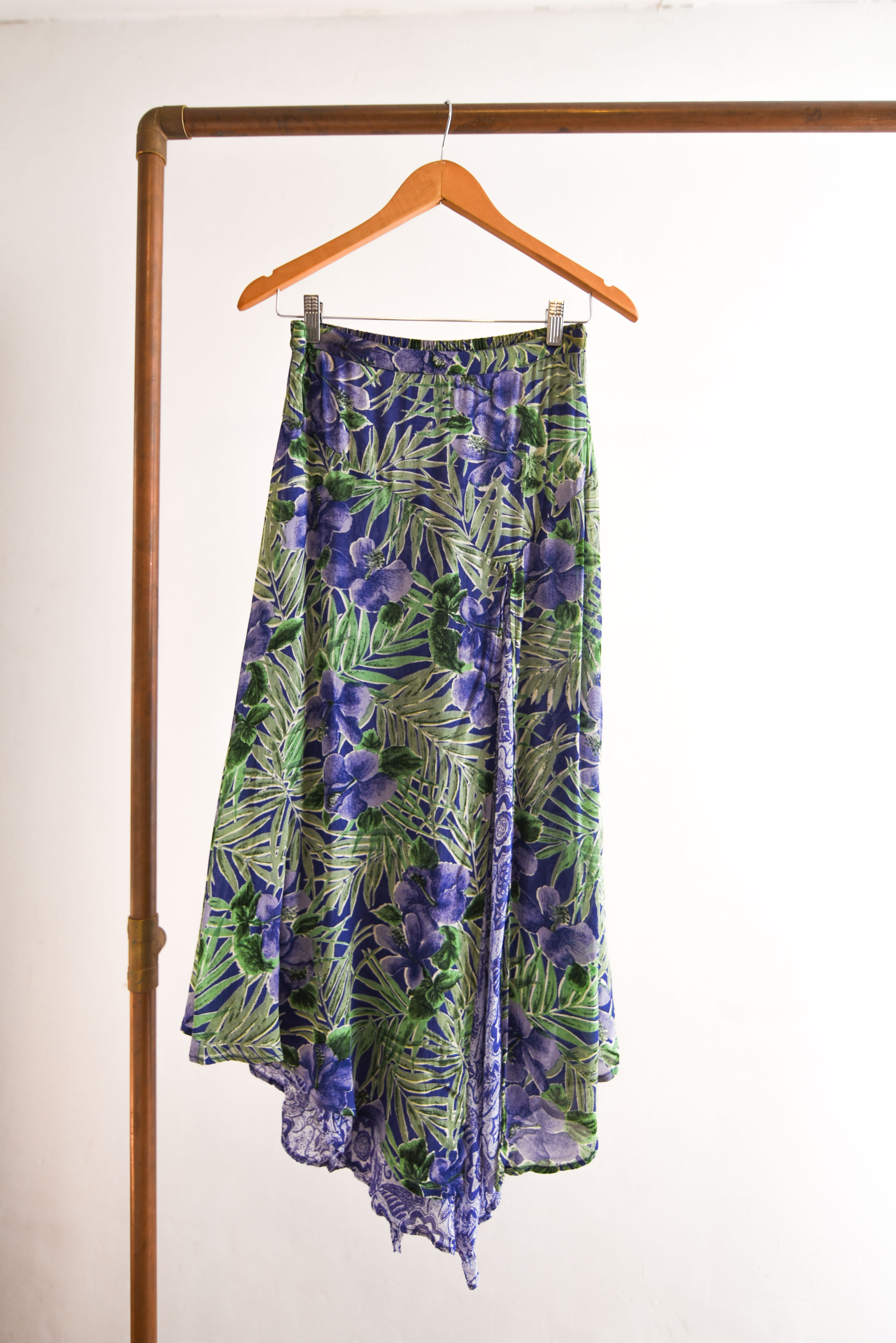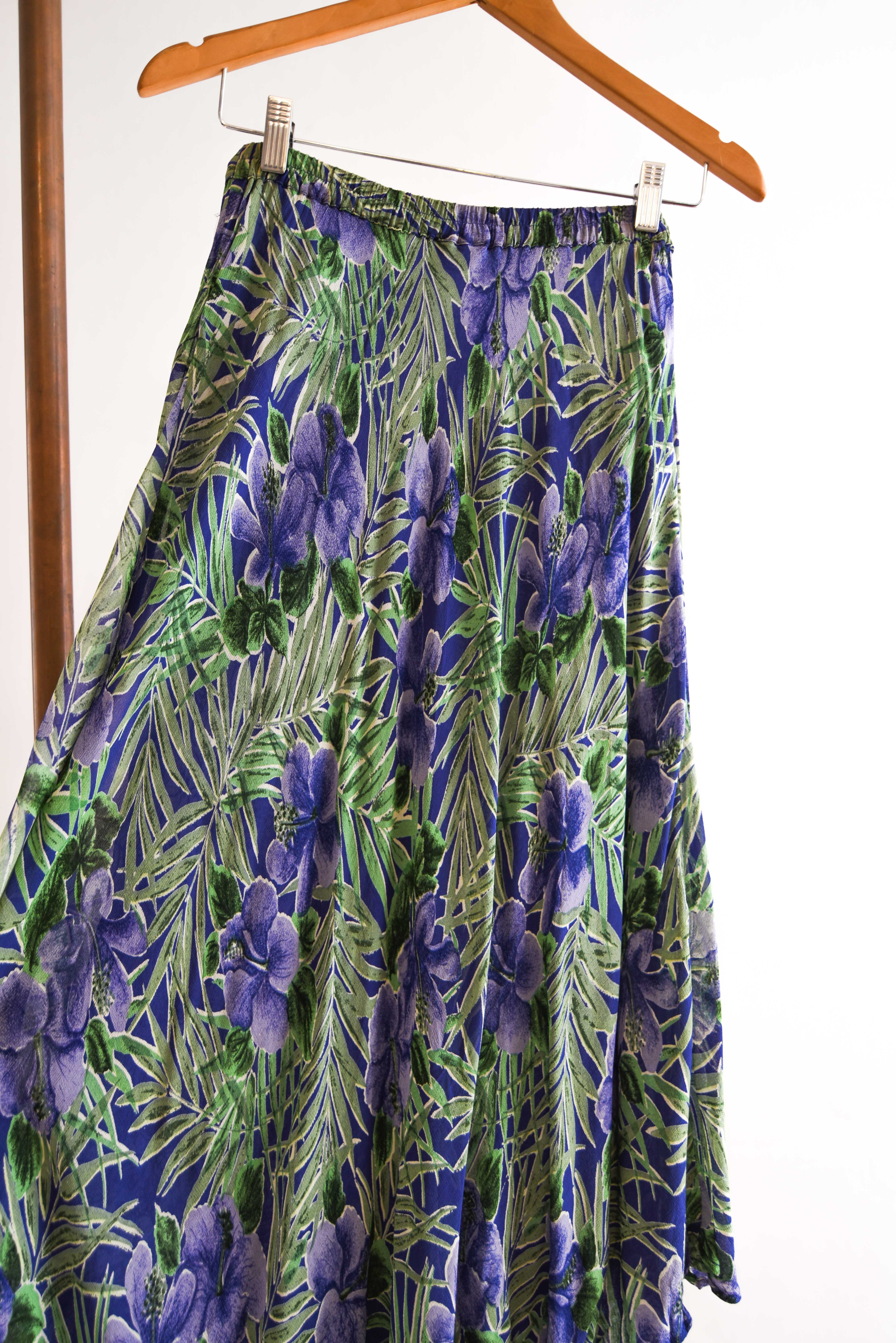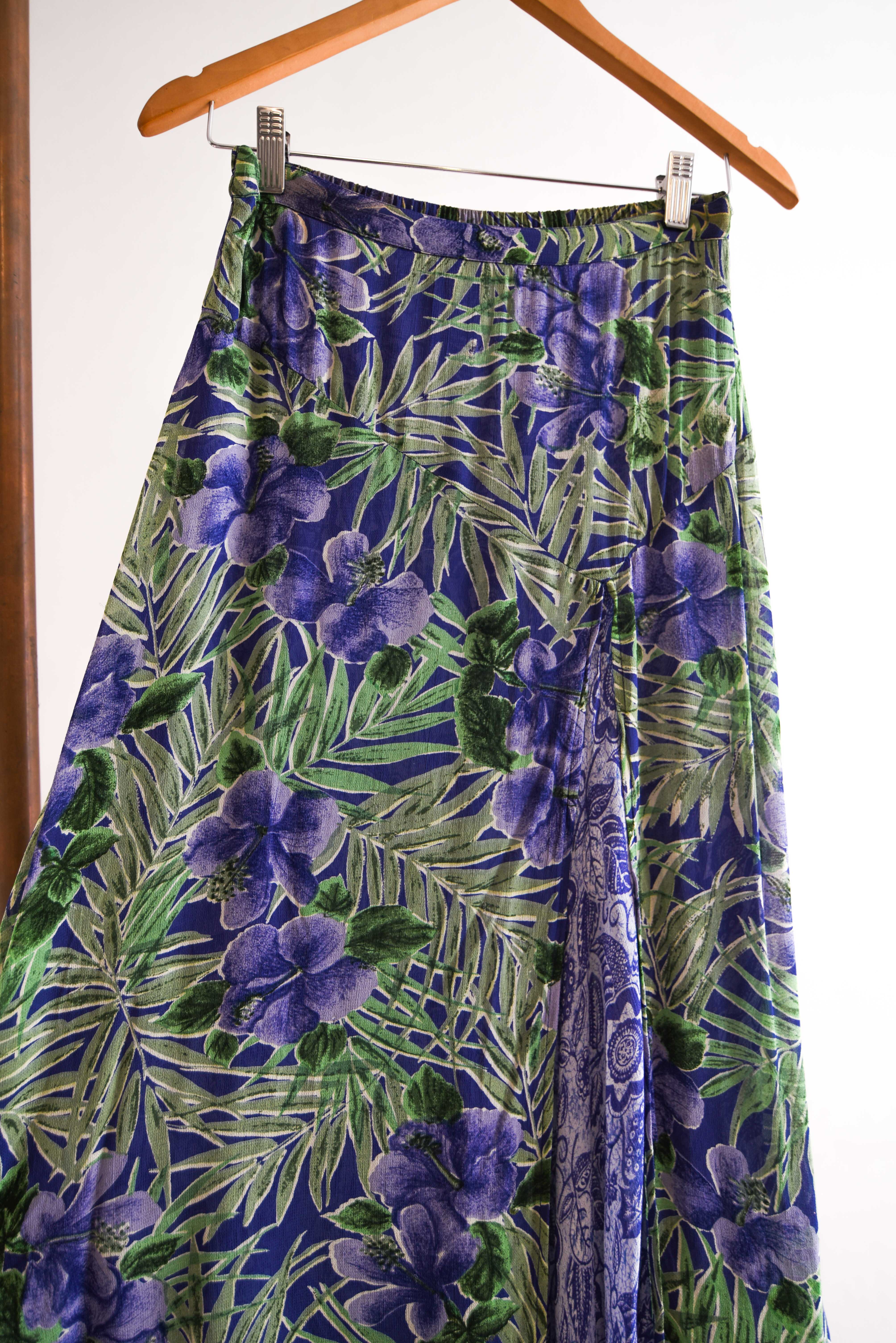 Bella maxi falda vintage de varias capas, color morado con diseño floral y tonalidades celestes. 100% rayón