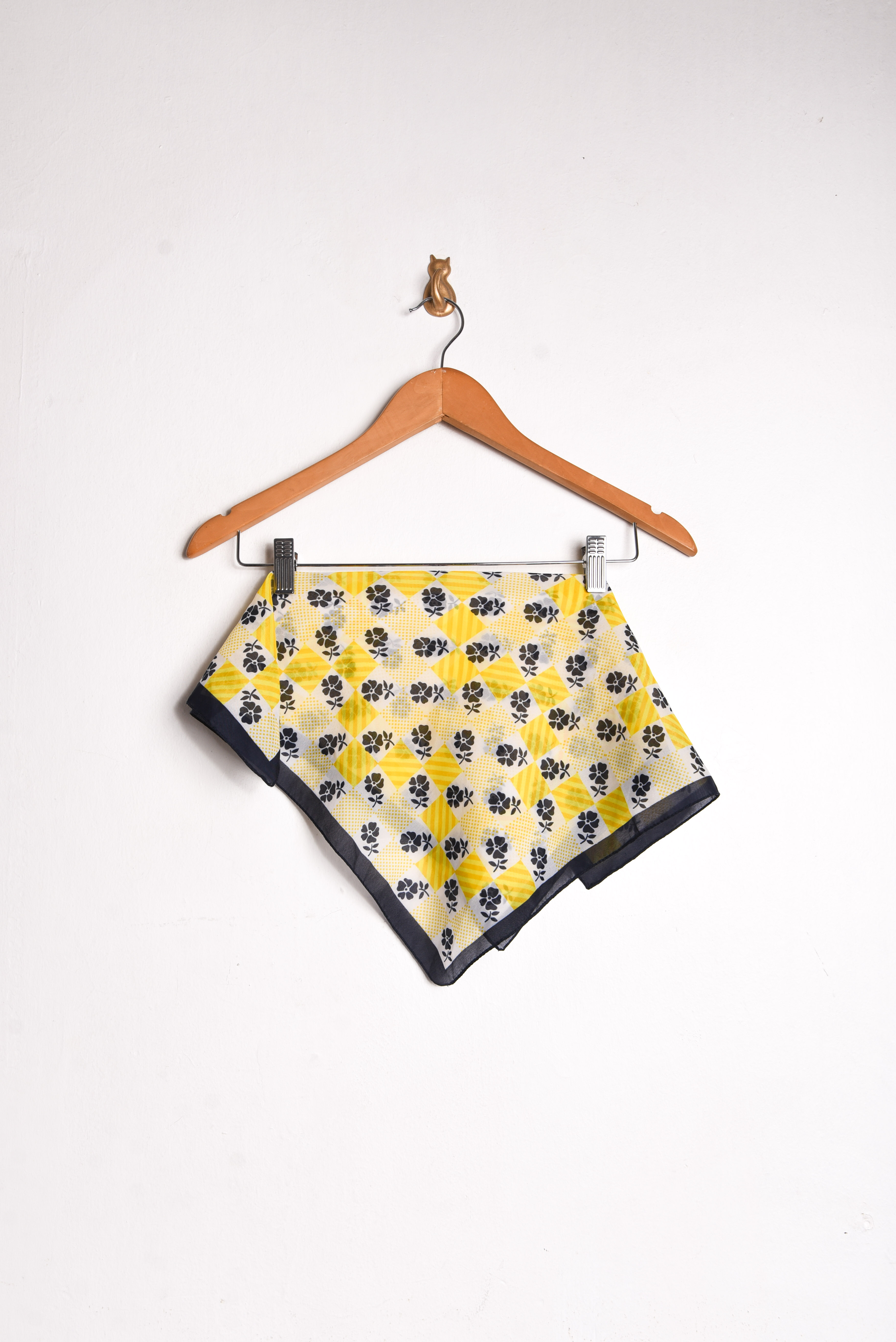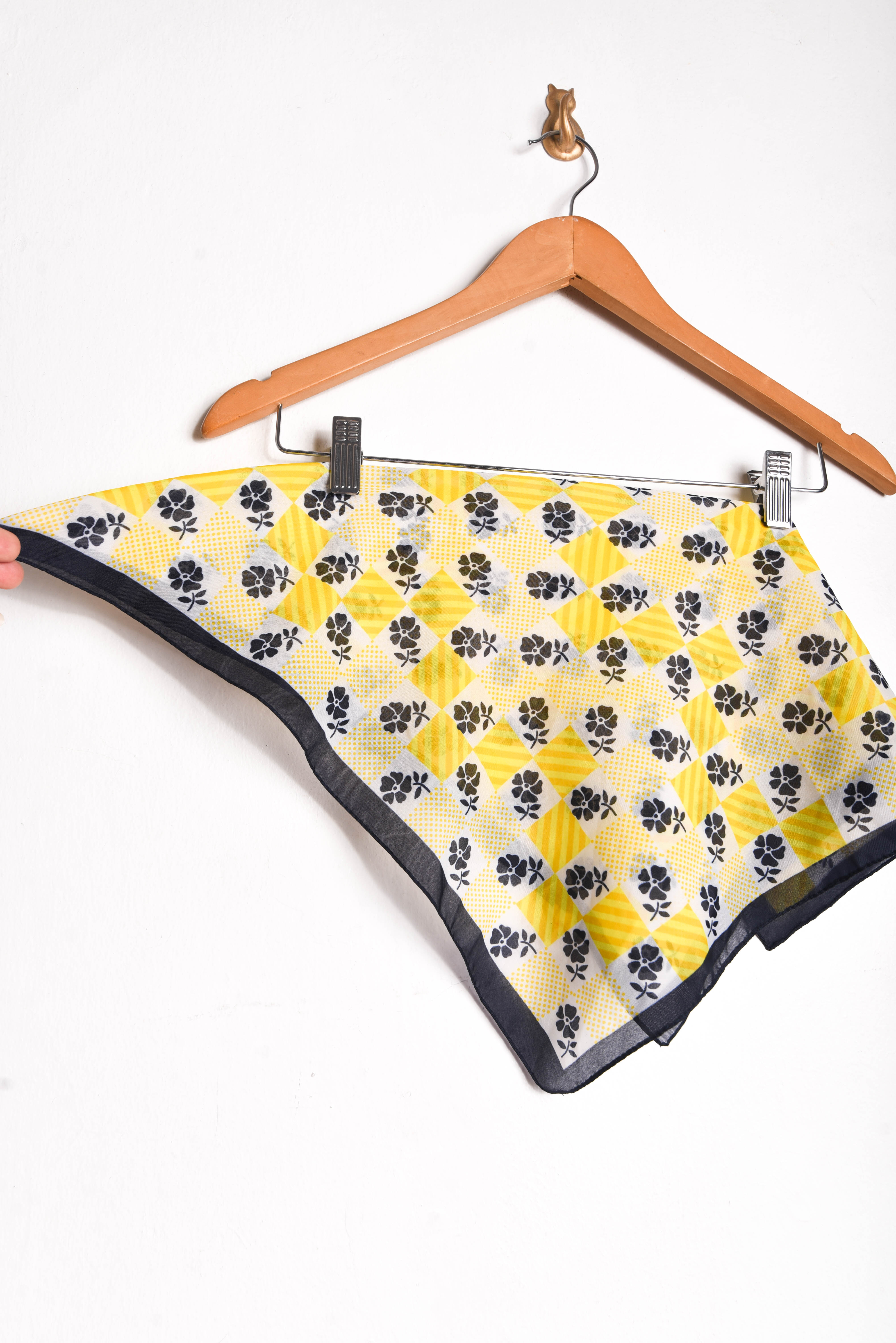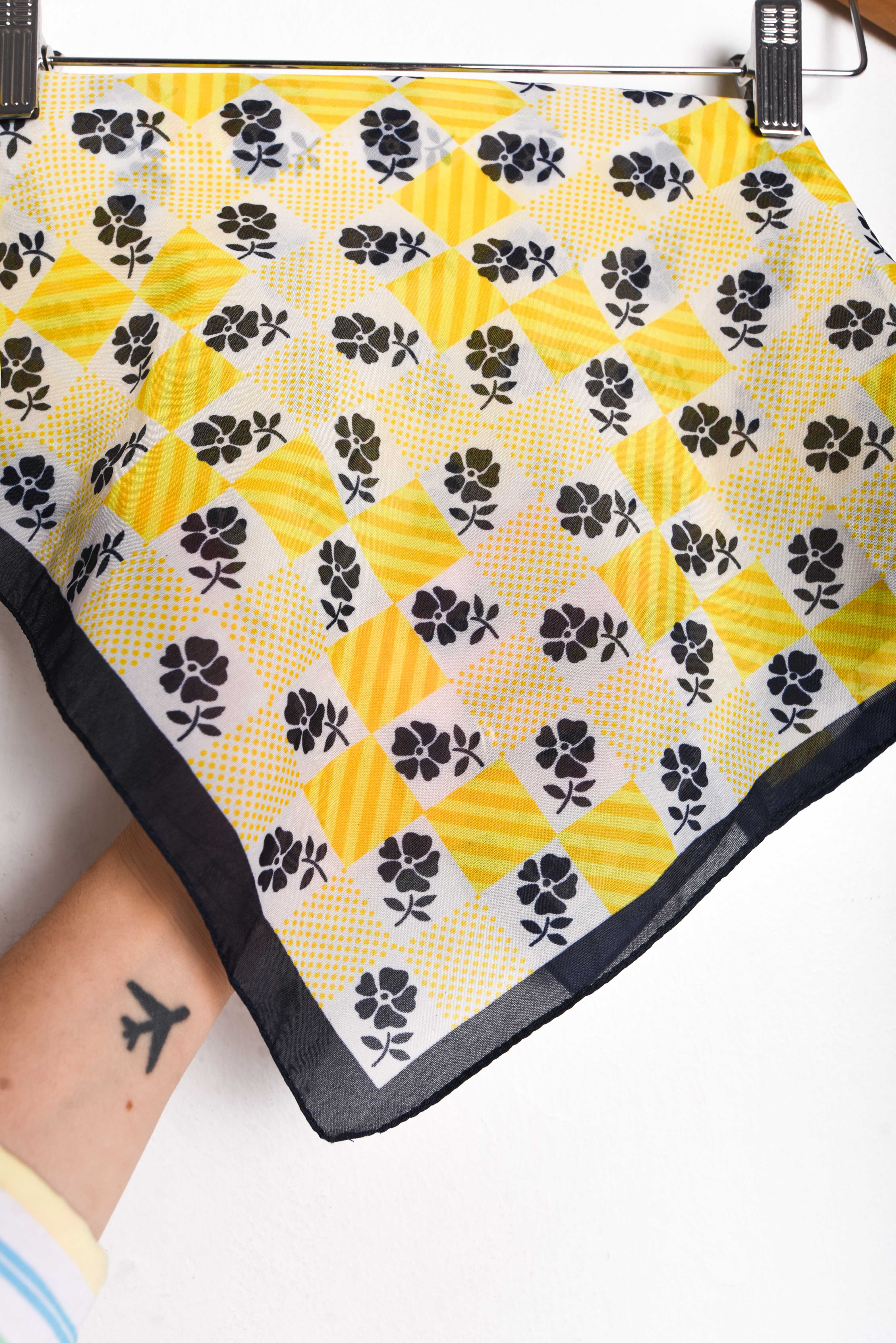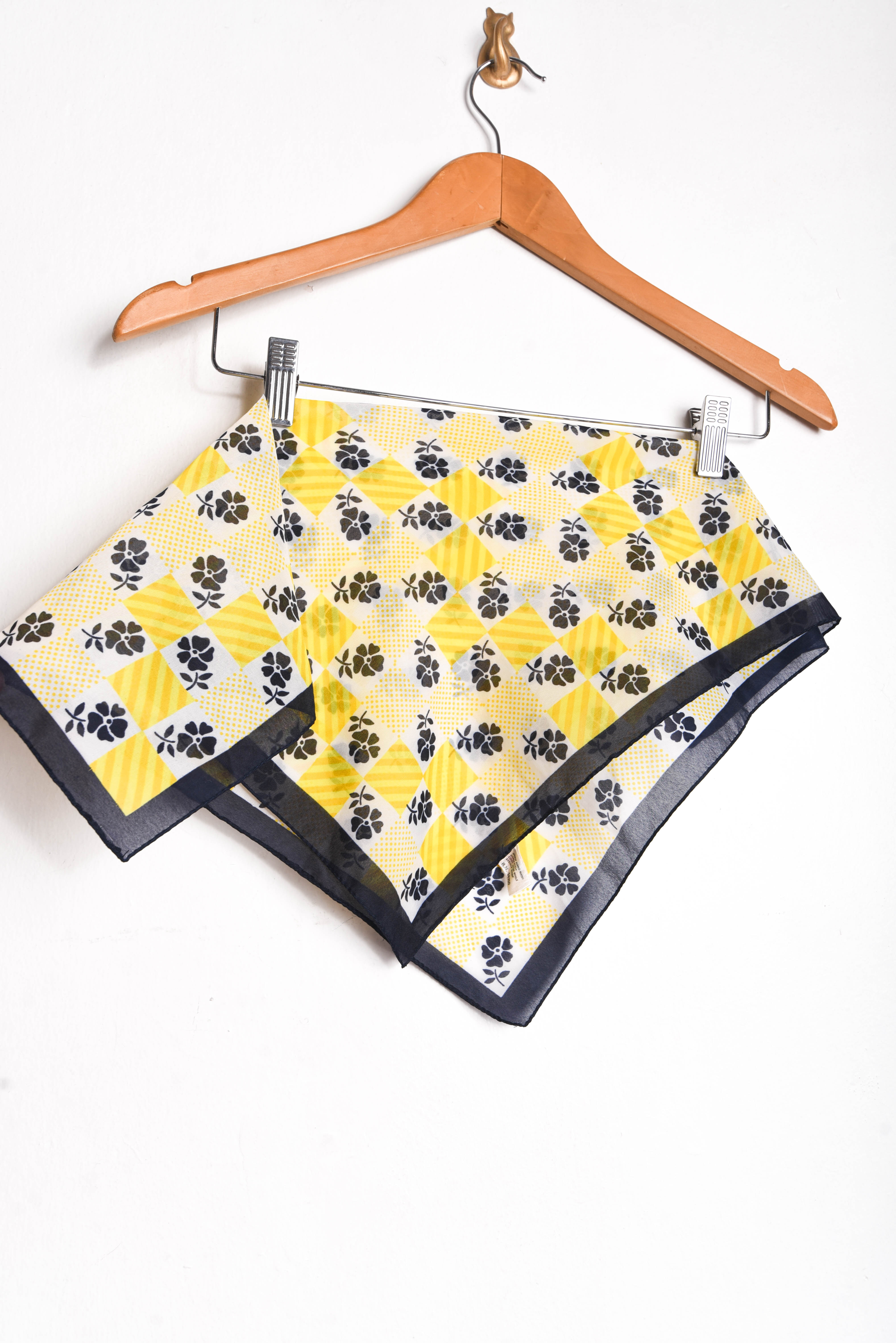 Bonito pañuelo vintage de forma cuadrada, color amarillo y azul con diseño de flores y cuadrados. Mide 49 x 50 cm
