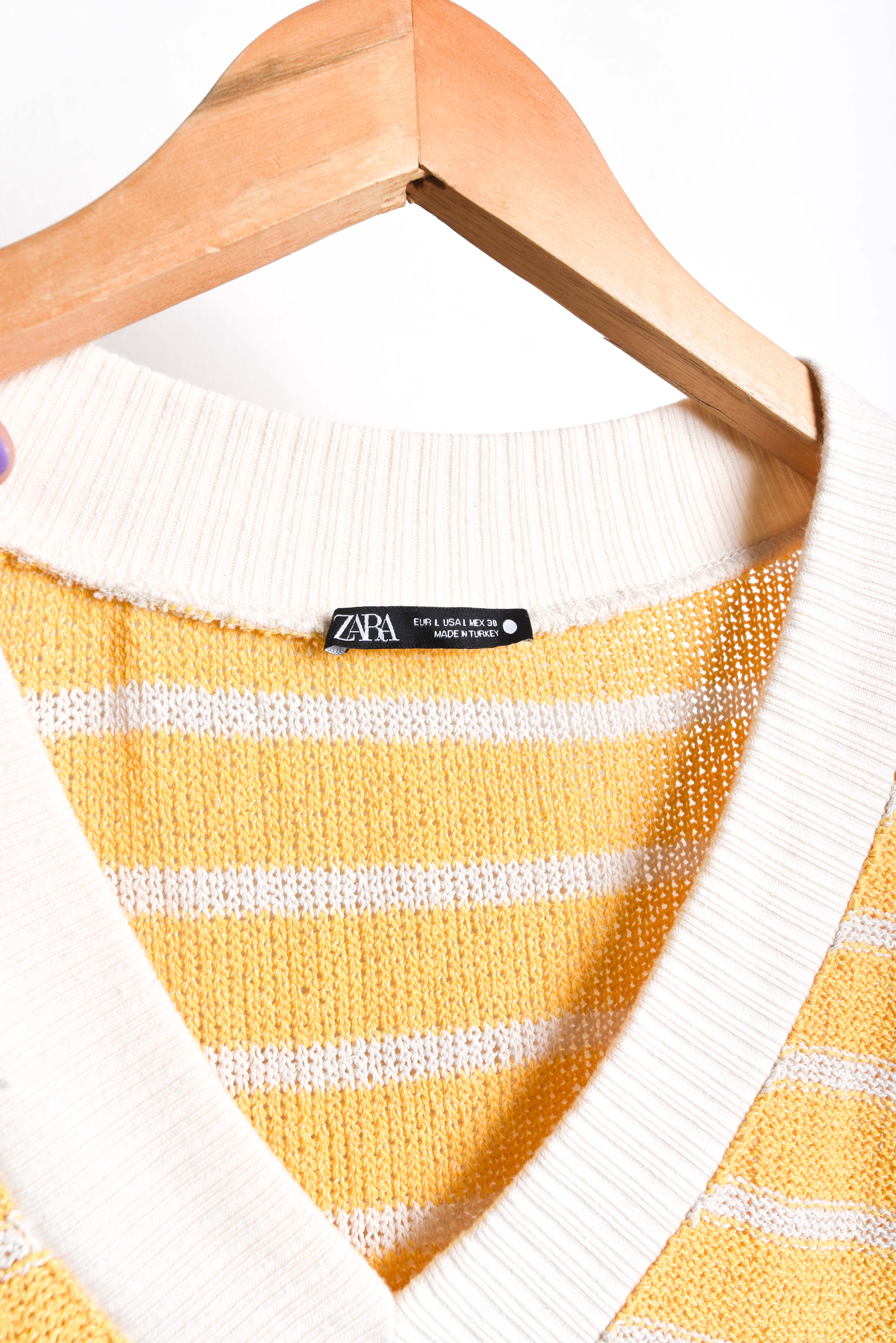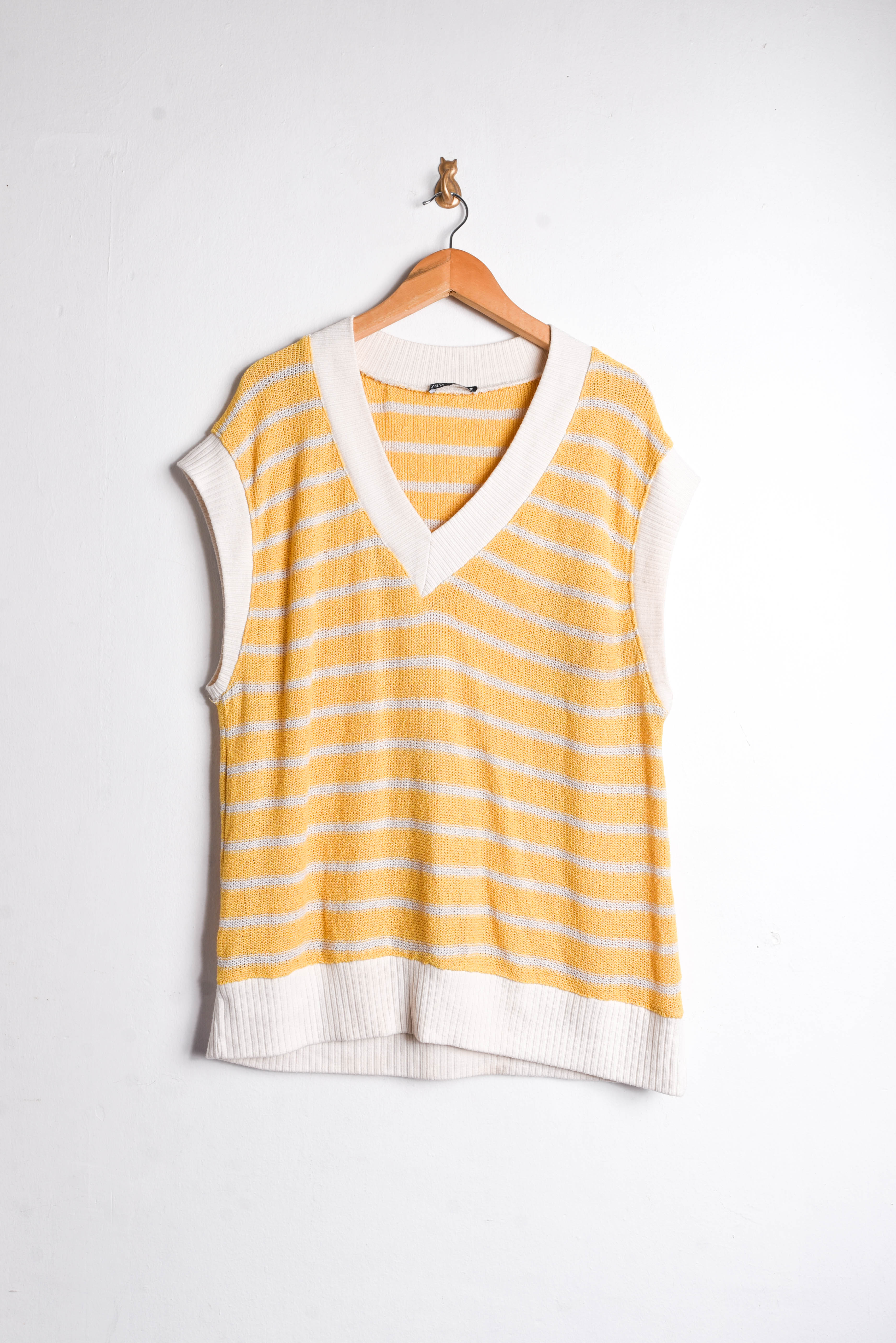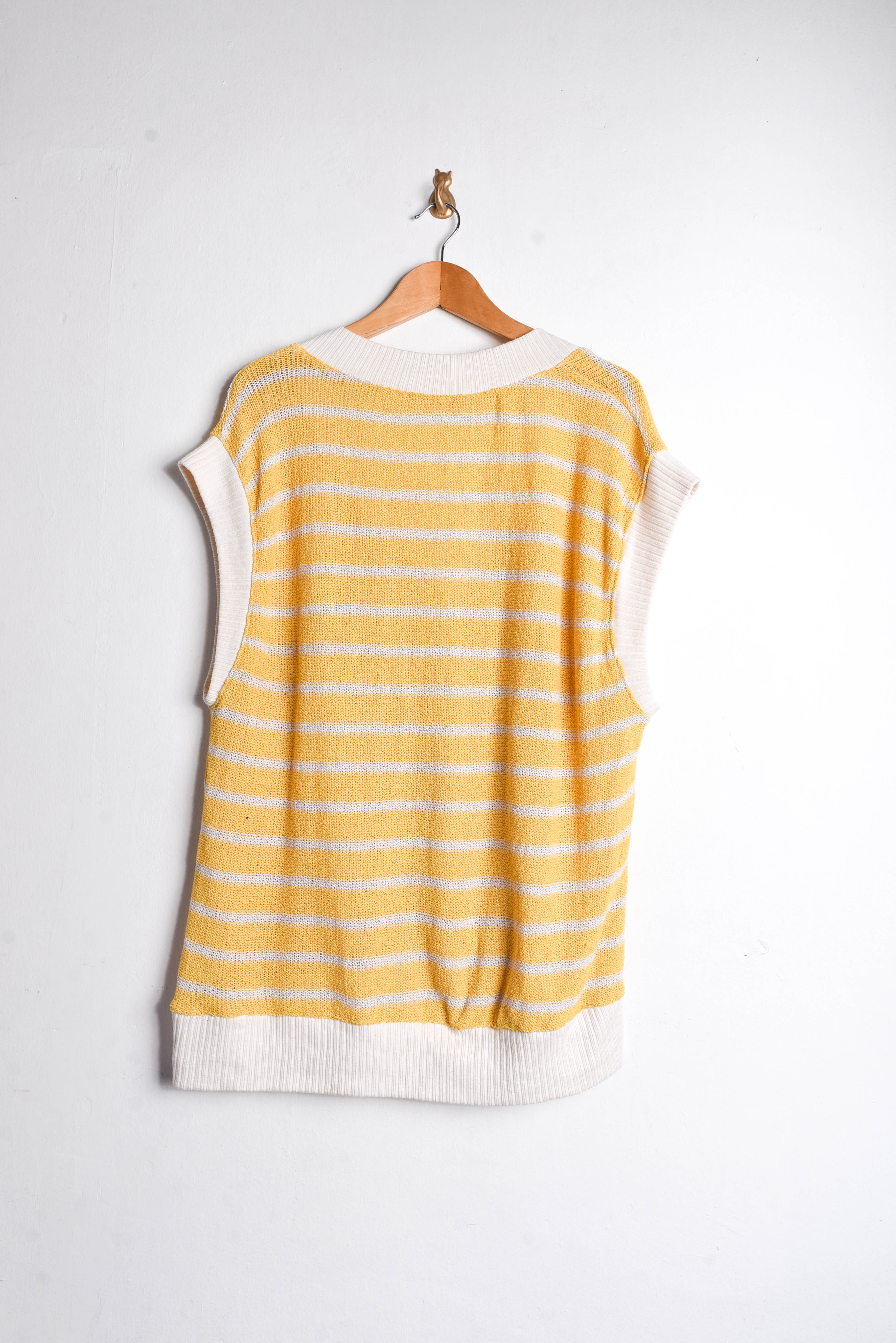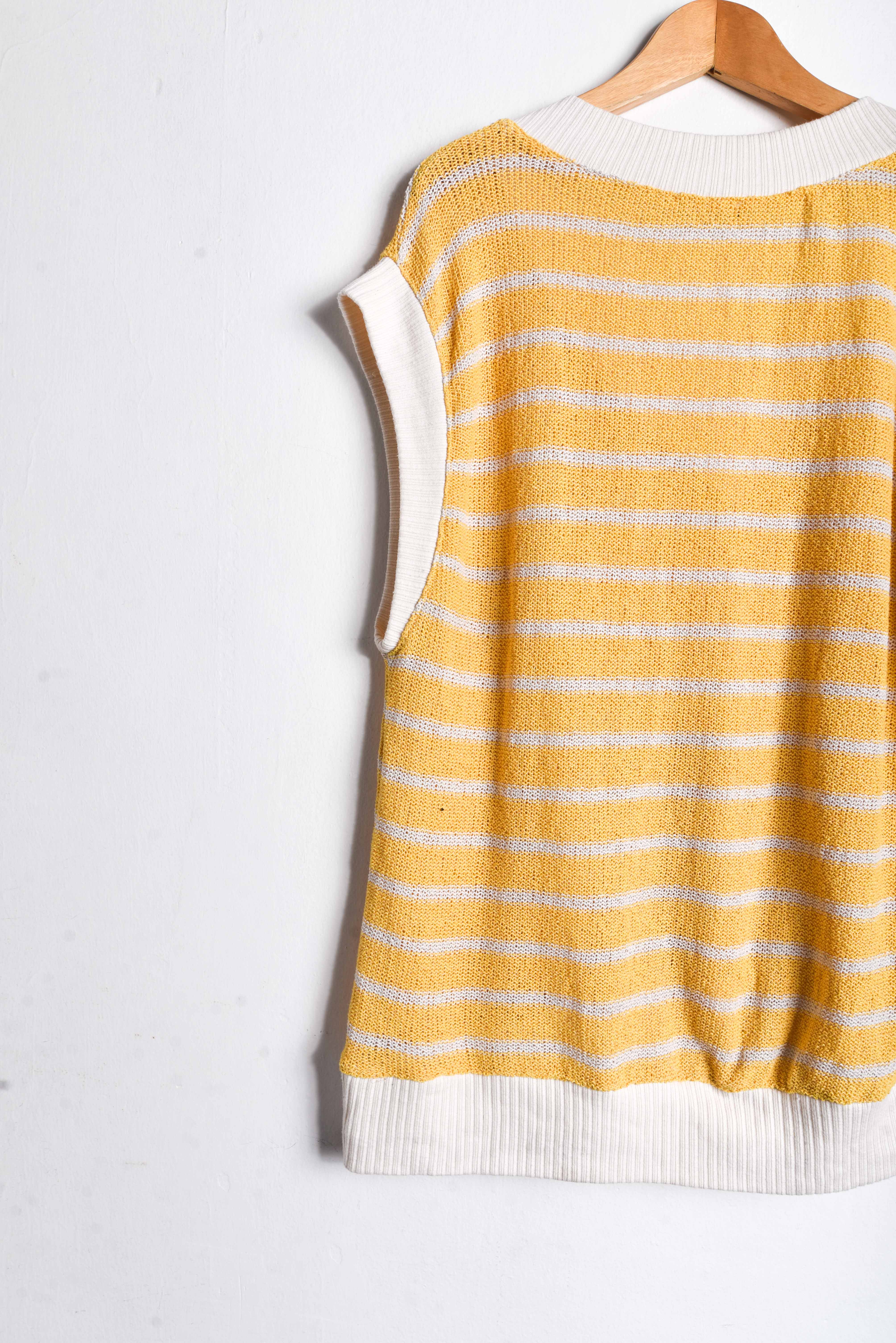Hermoso sweater vest en amarillo y marfil, escote en V y diseño rayado.