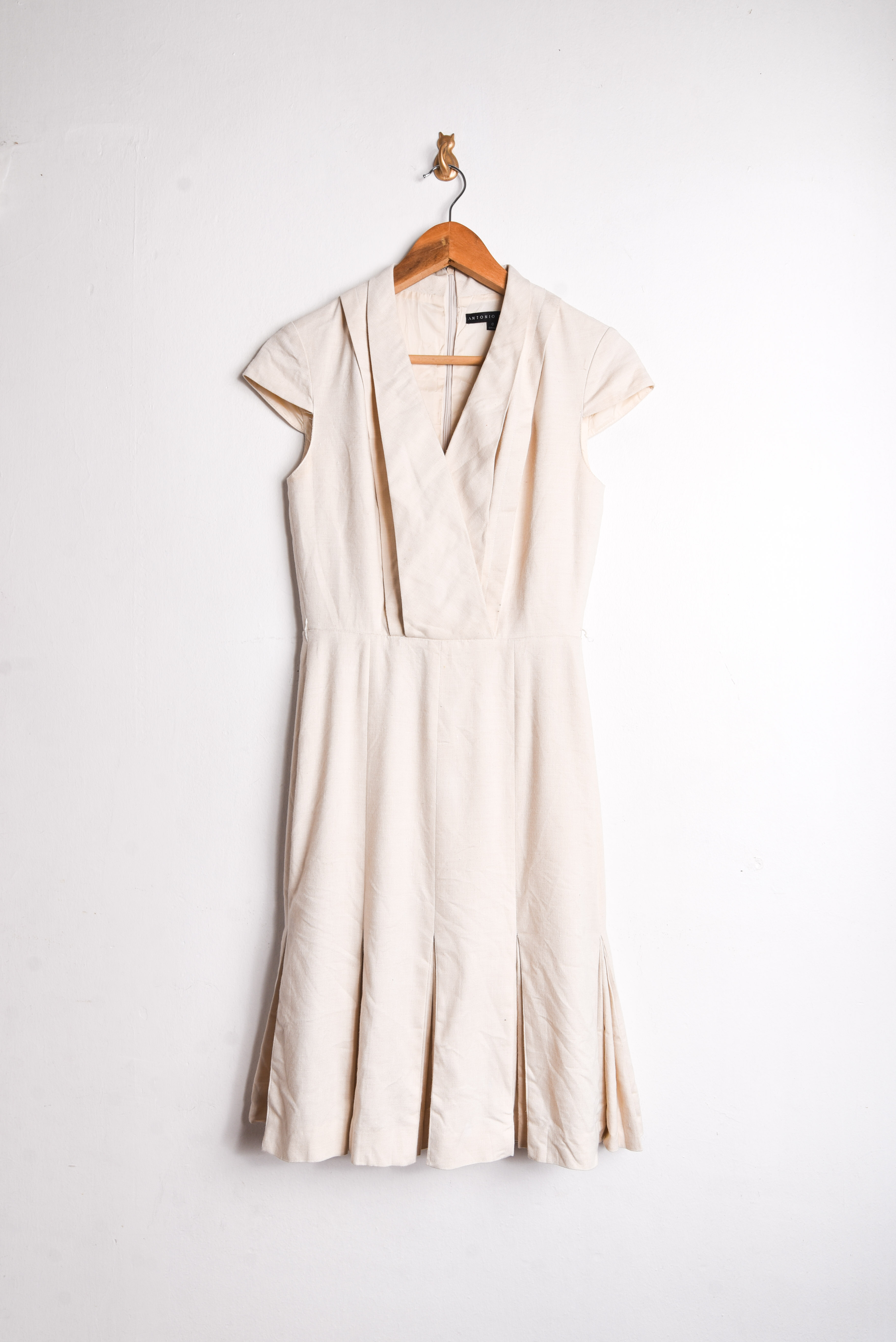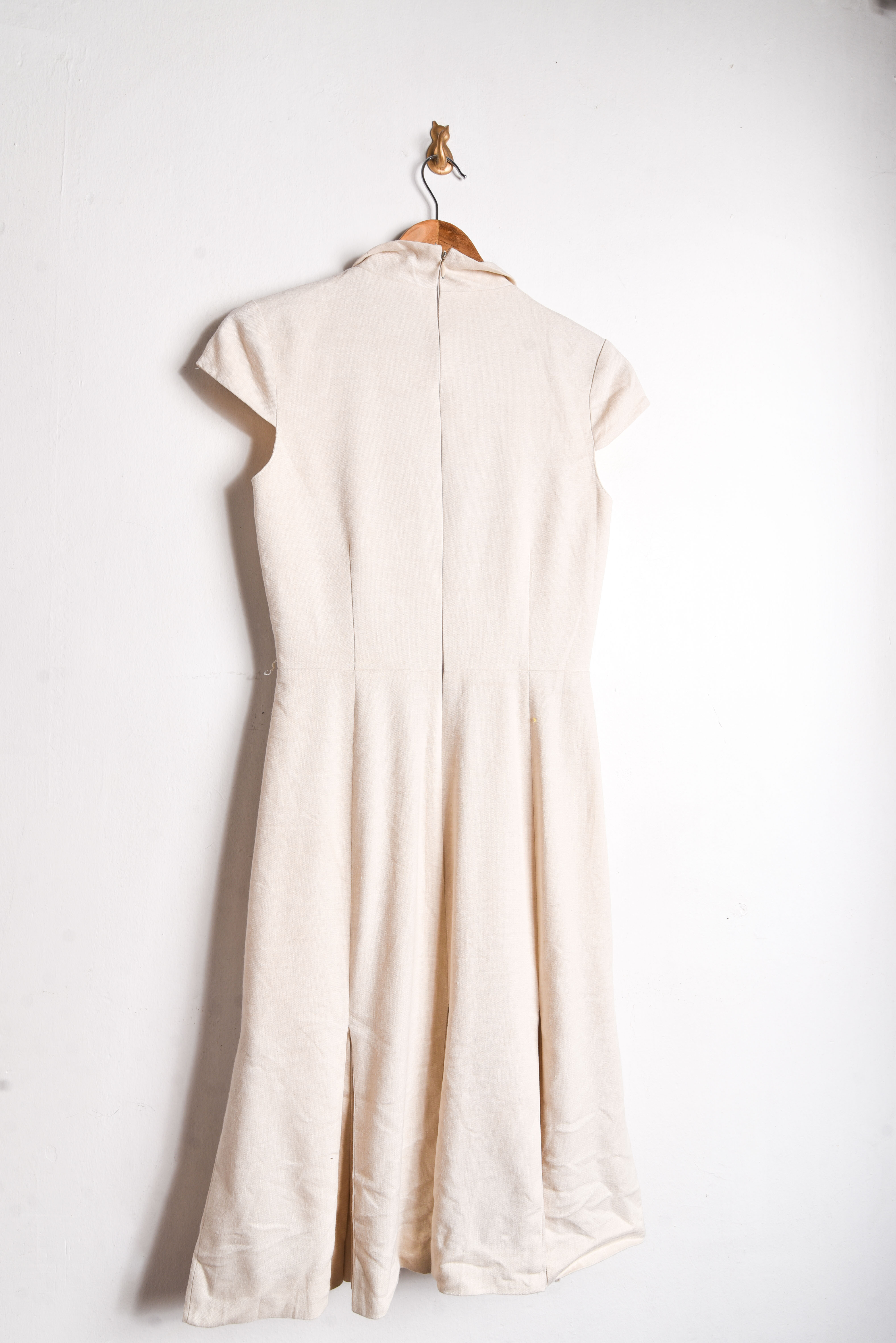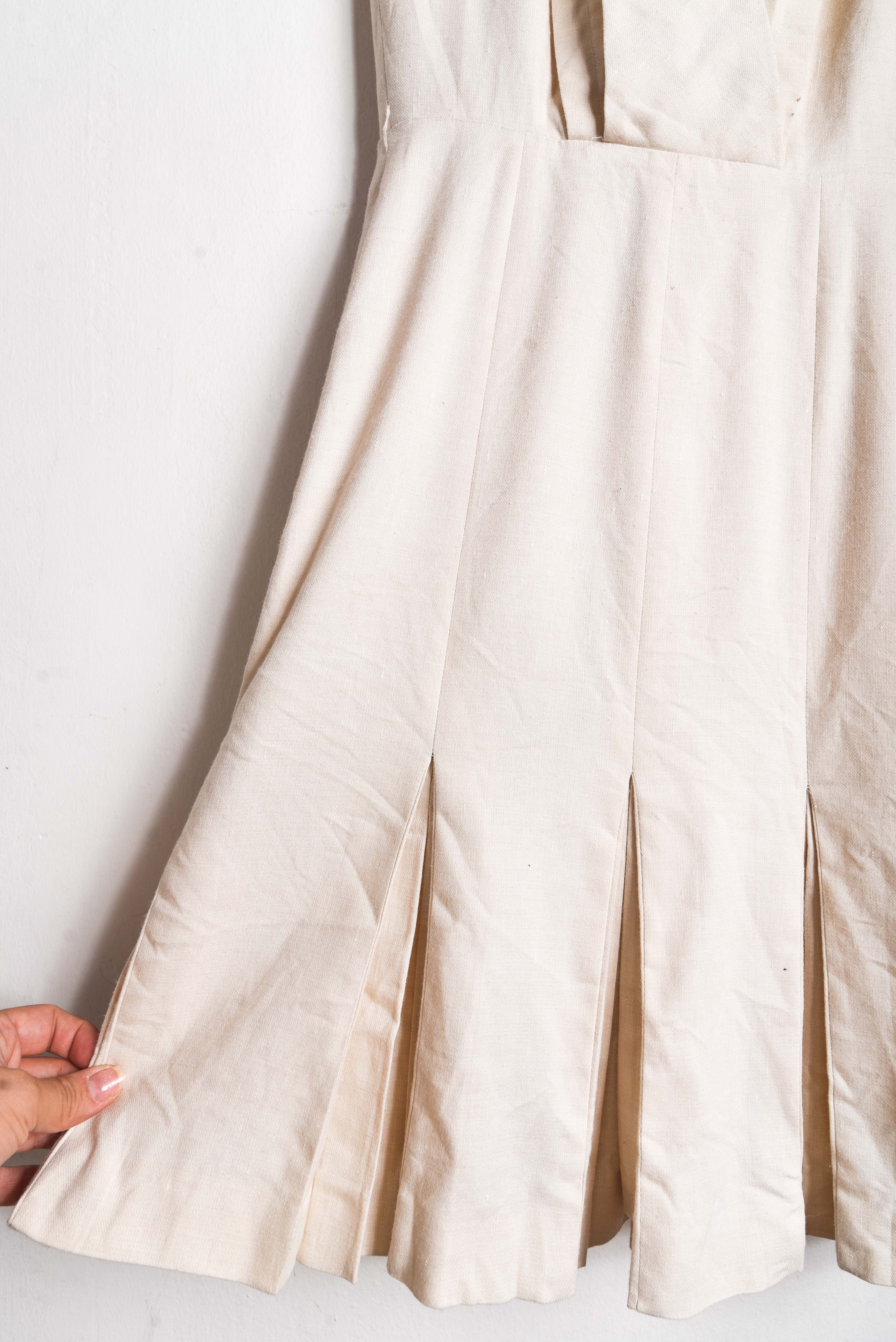 Hermoso vestido estilo sastrero, color marfil con cierre en la espalda y tablas en la parte inferior.