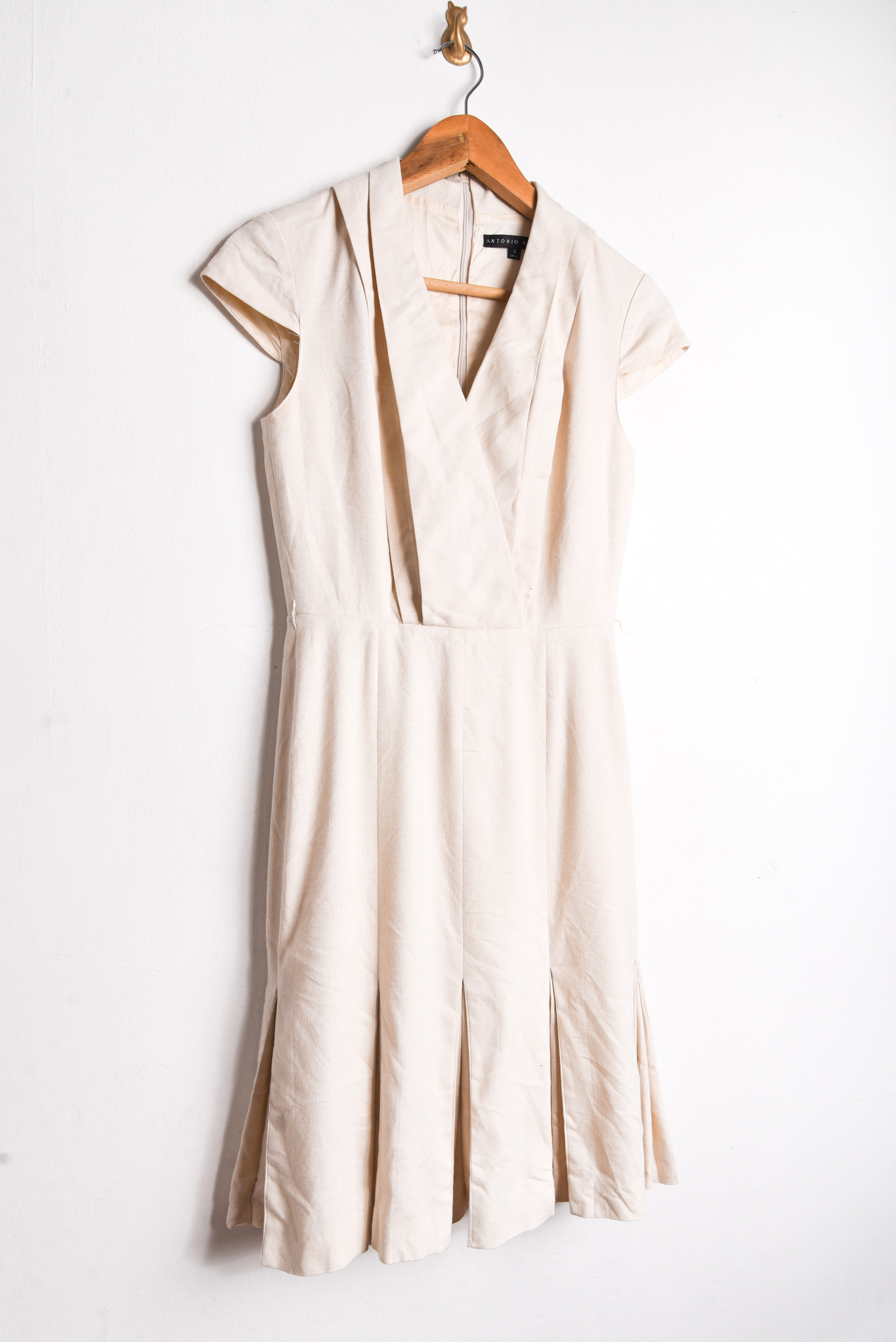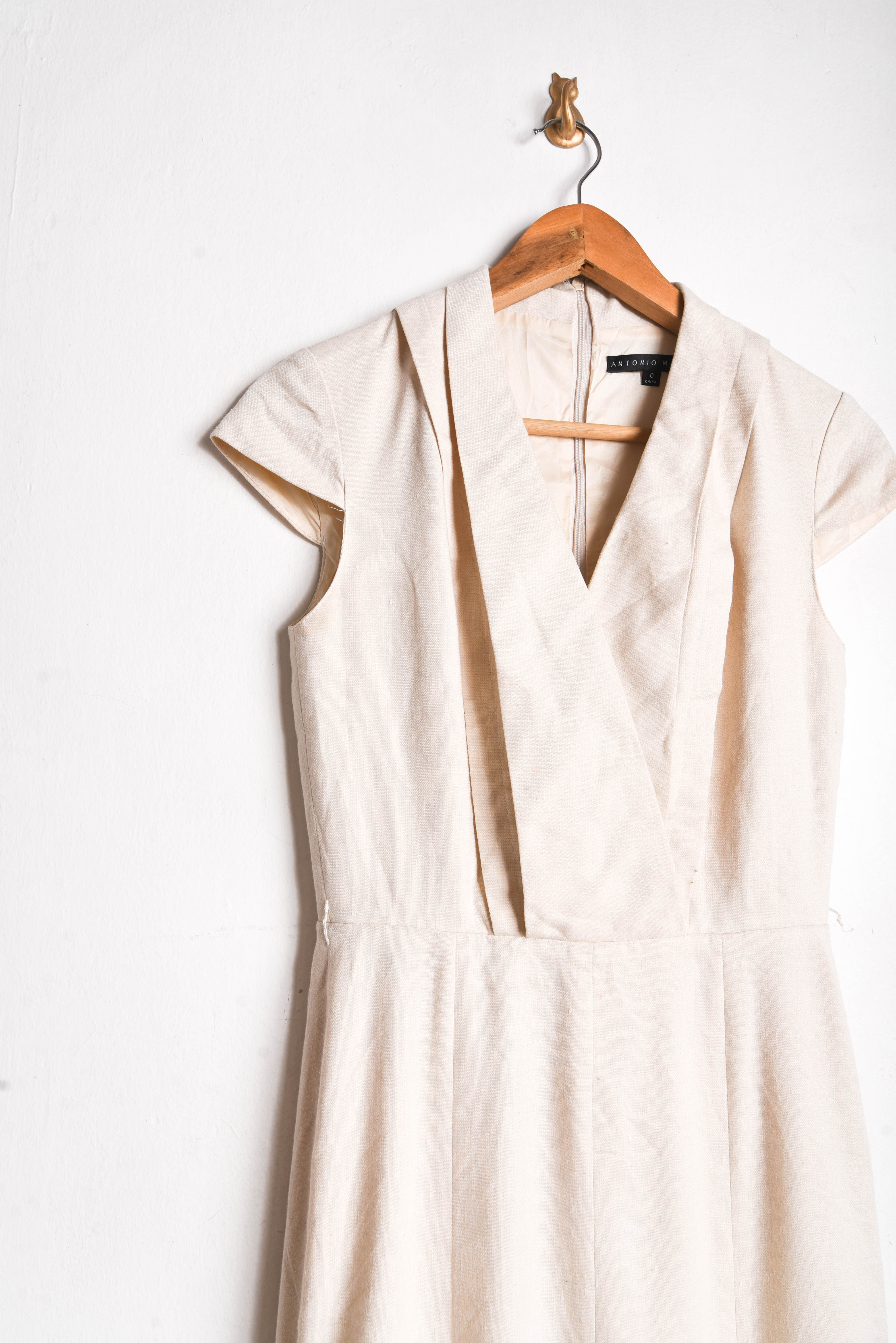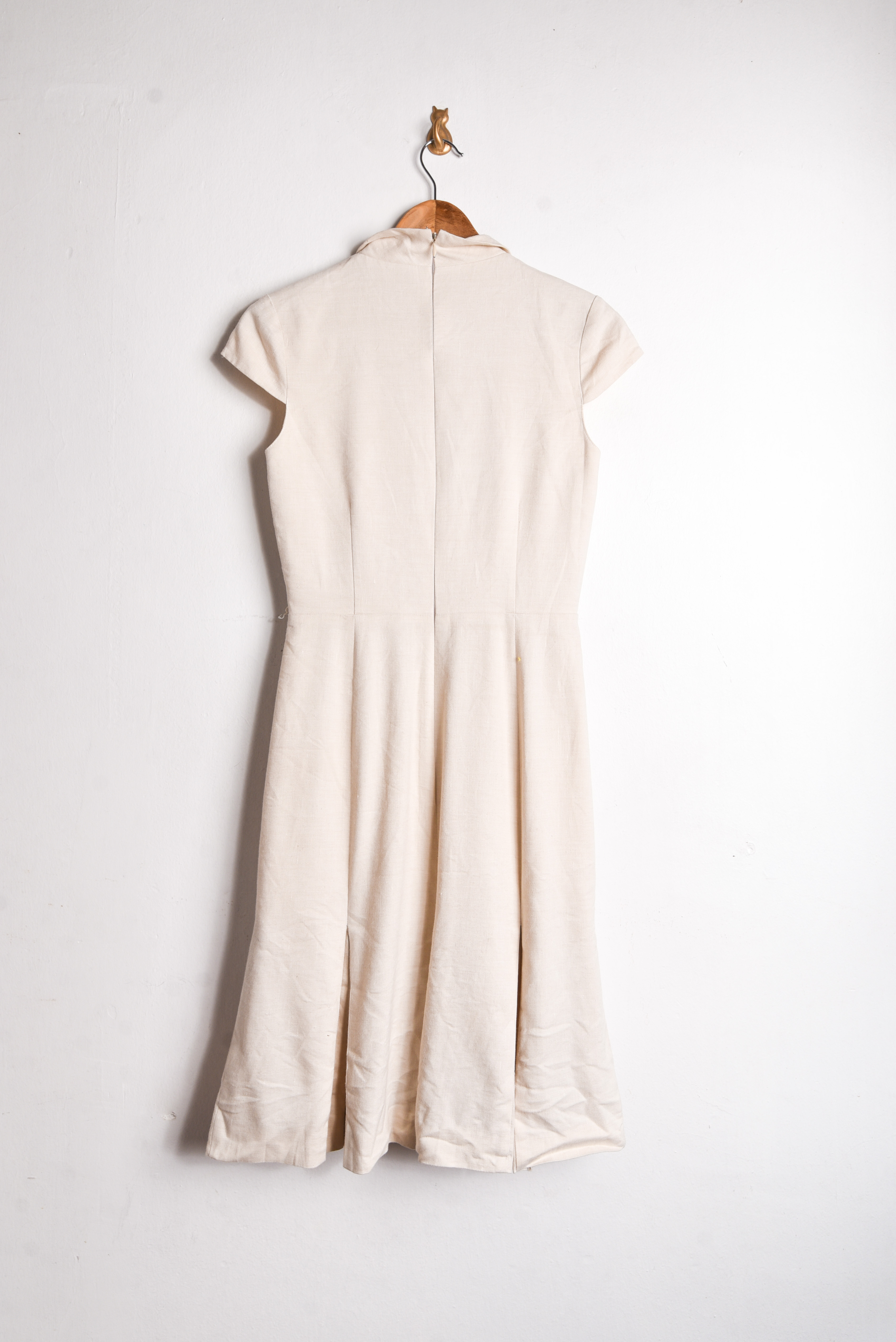 Hermoso vestido estilo sastrero, color marfil con cierre en la espalda y tablas en la parte inferior.