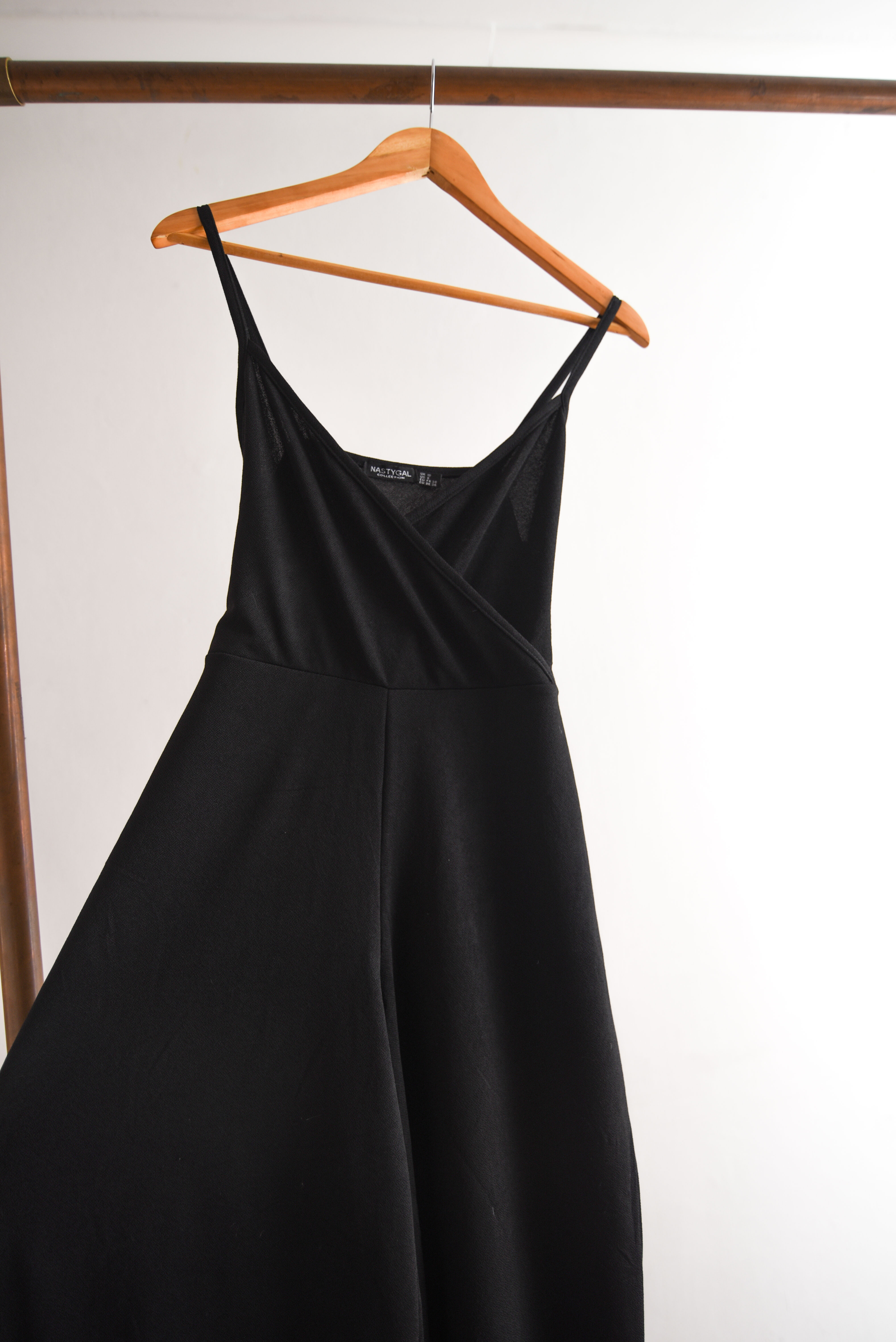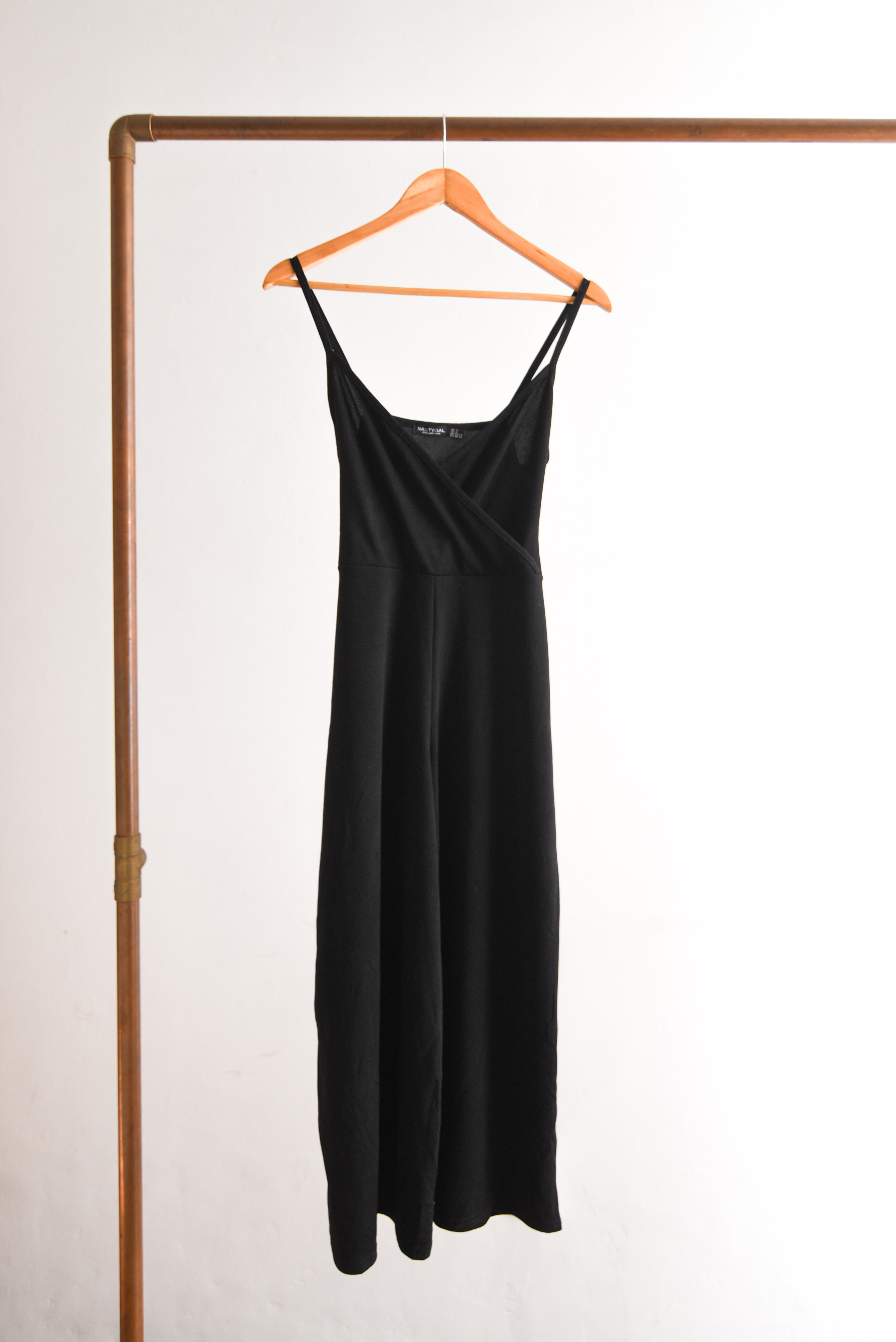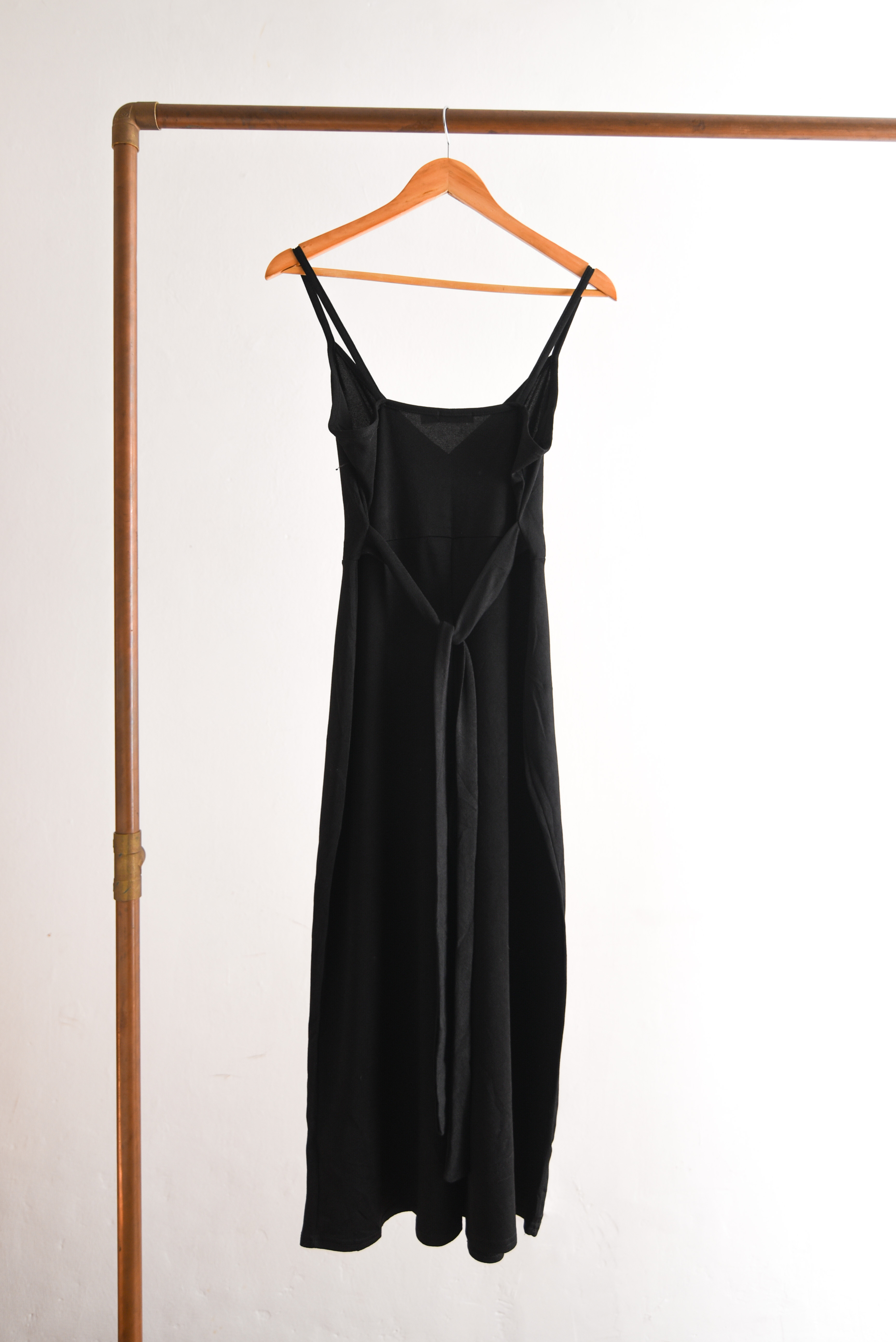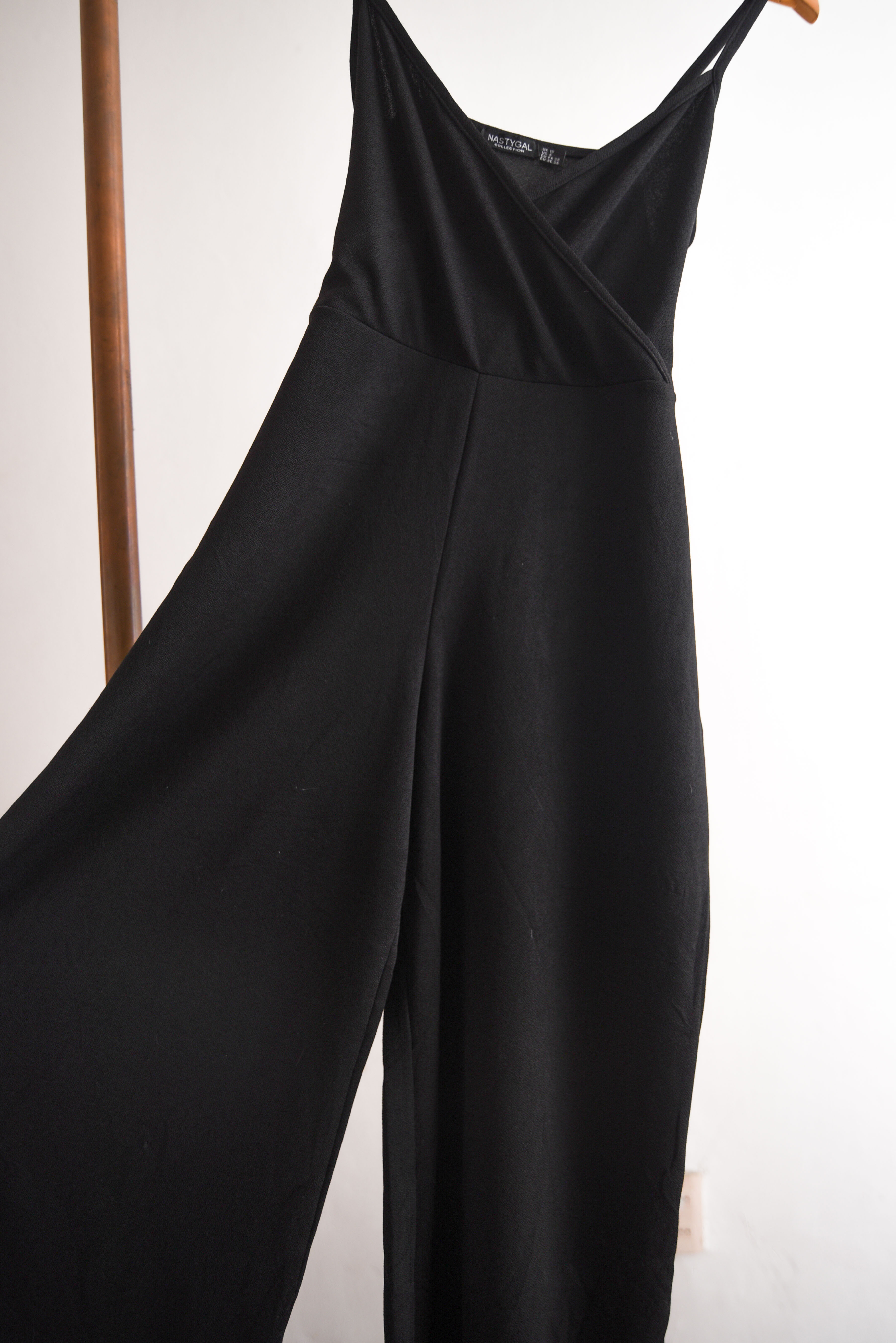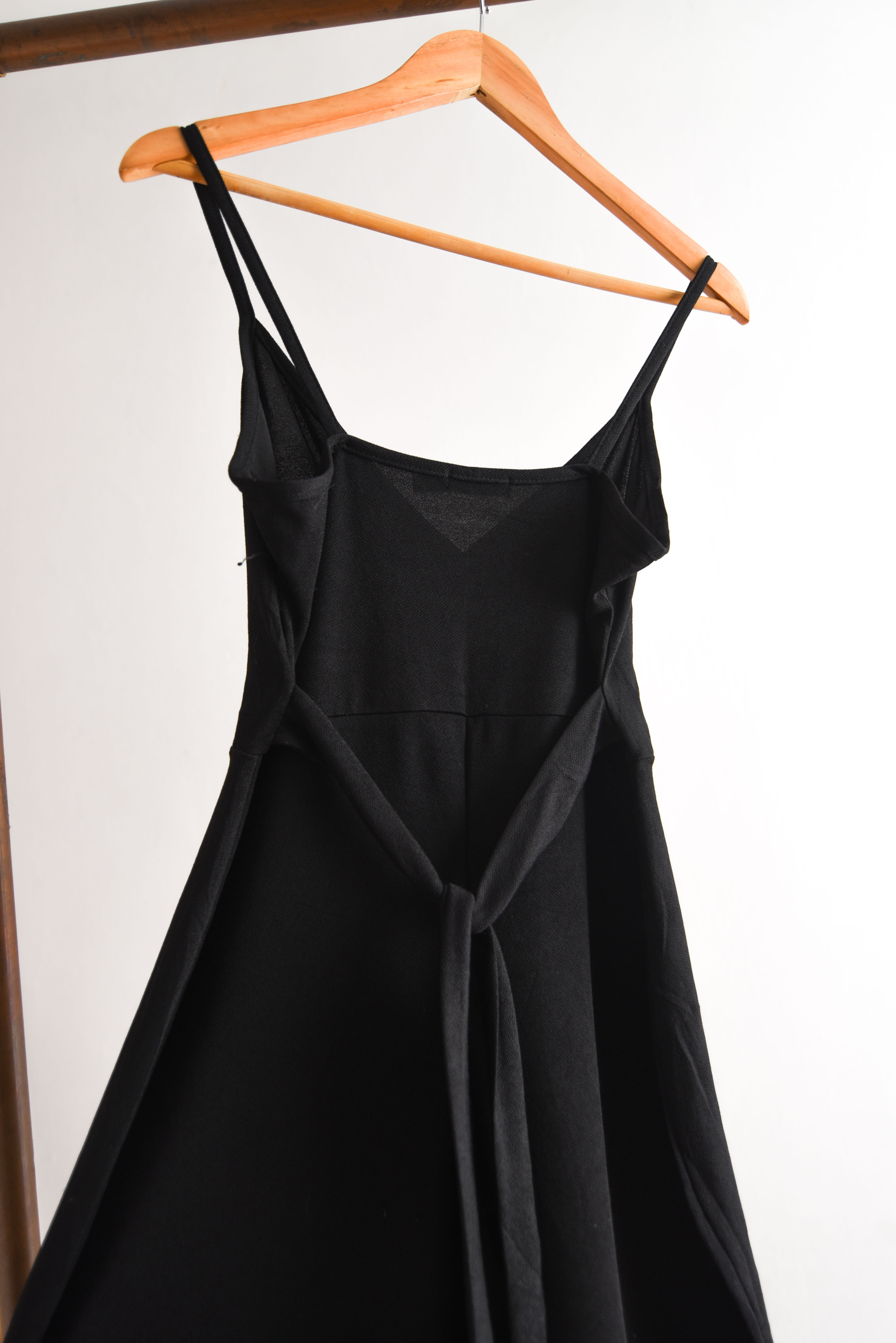 Bonito enterito negro de tela elasticada, tiene escote cruzado, pabilos y lazito en la cintura. 95% poliéster y 5% elastano.