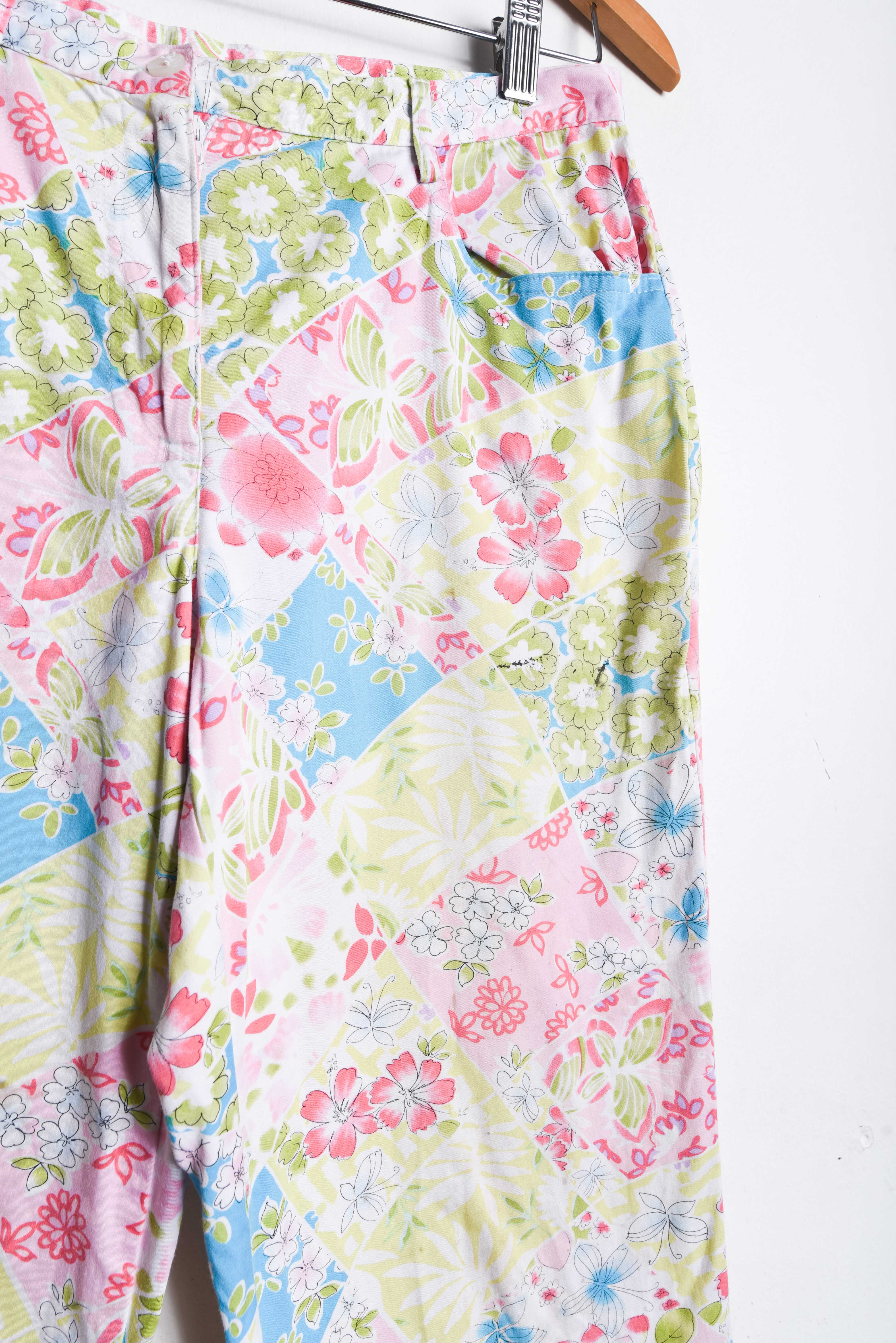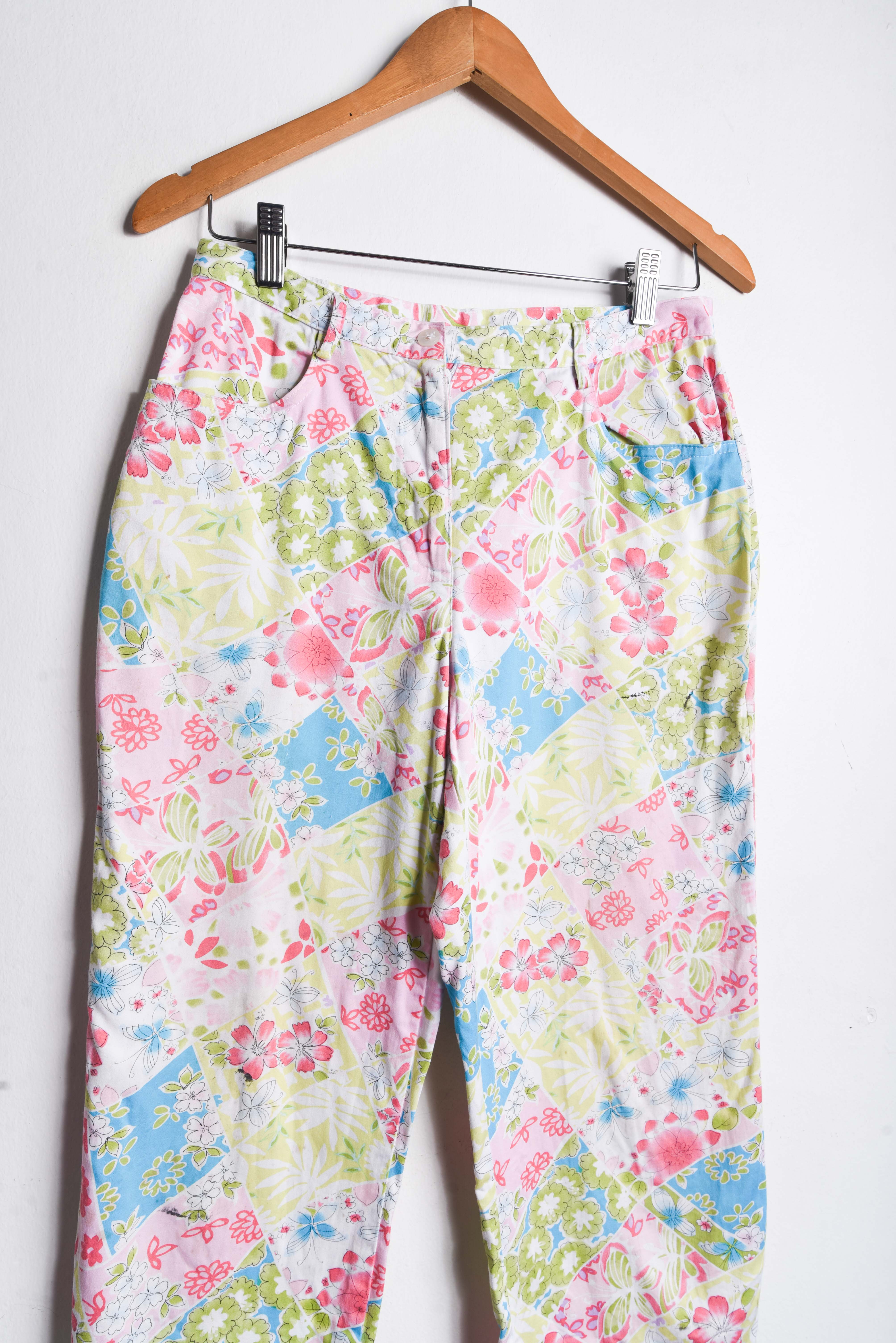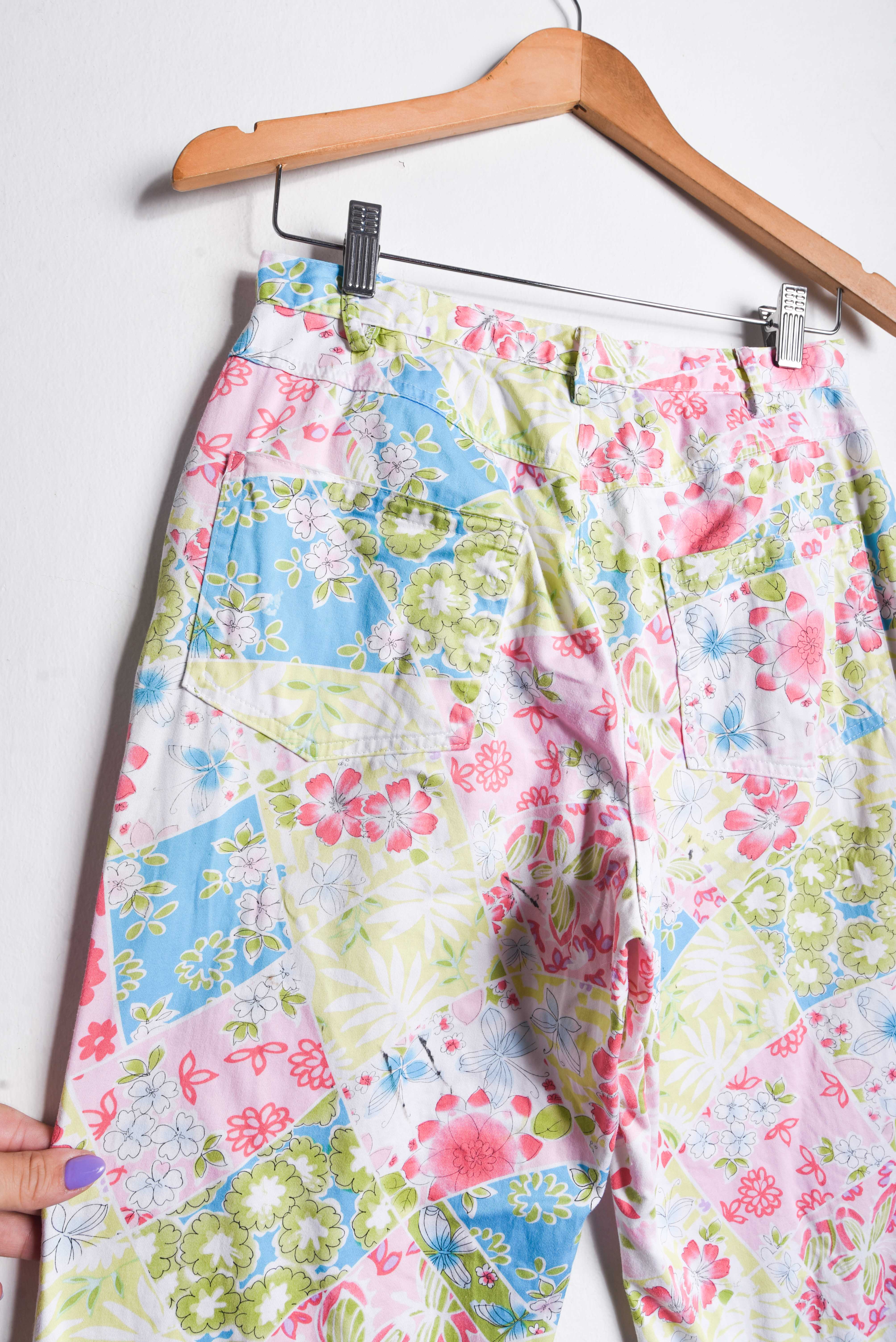 Hermoso pantalón vintage de tiro alto, color blanco con diseño floral multicolor, cierre delantero y bolsillos. 97% algodón y 3% spandex