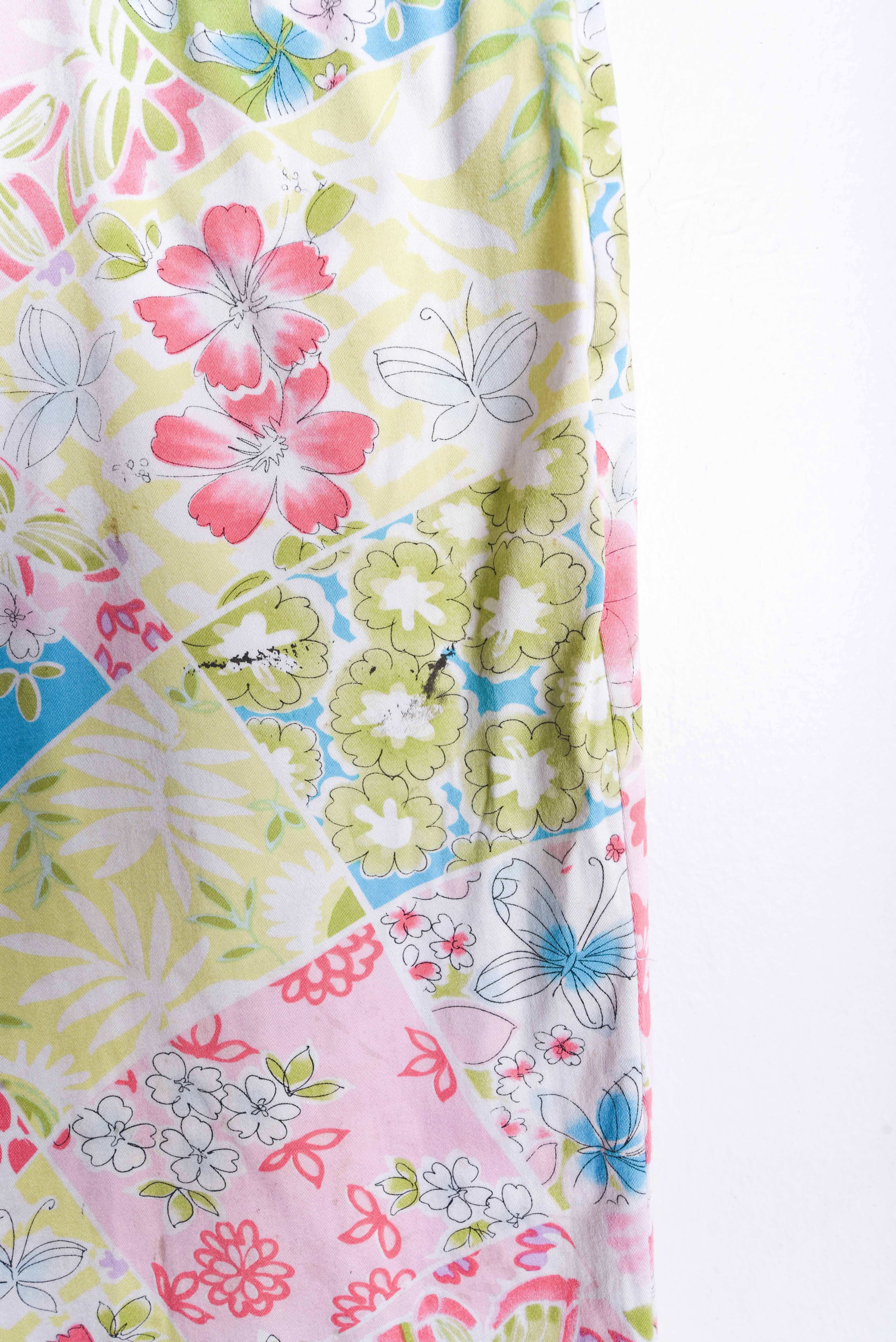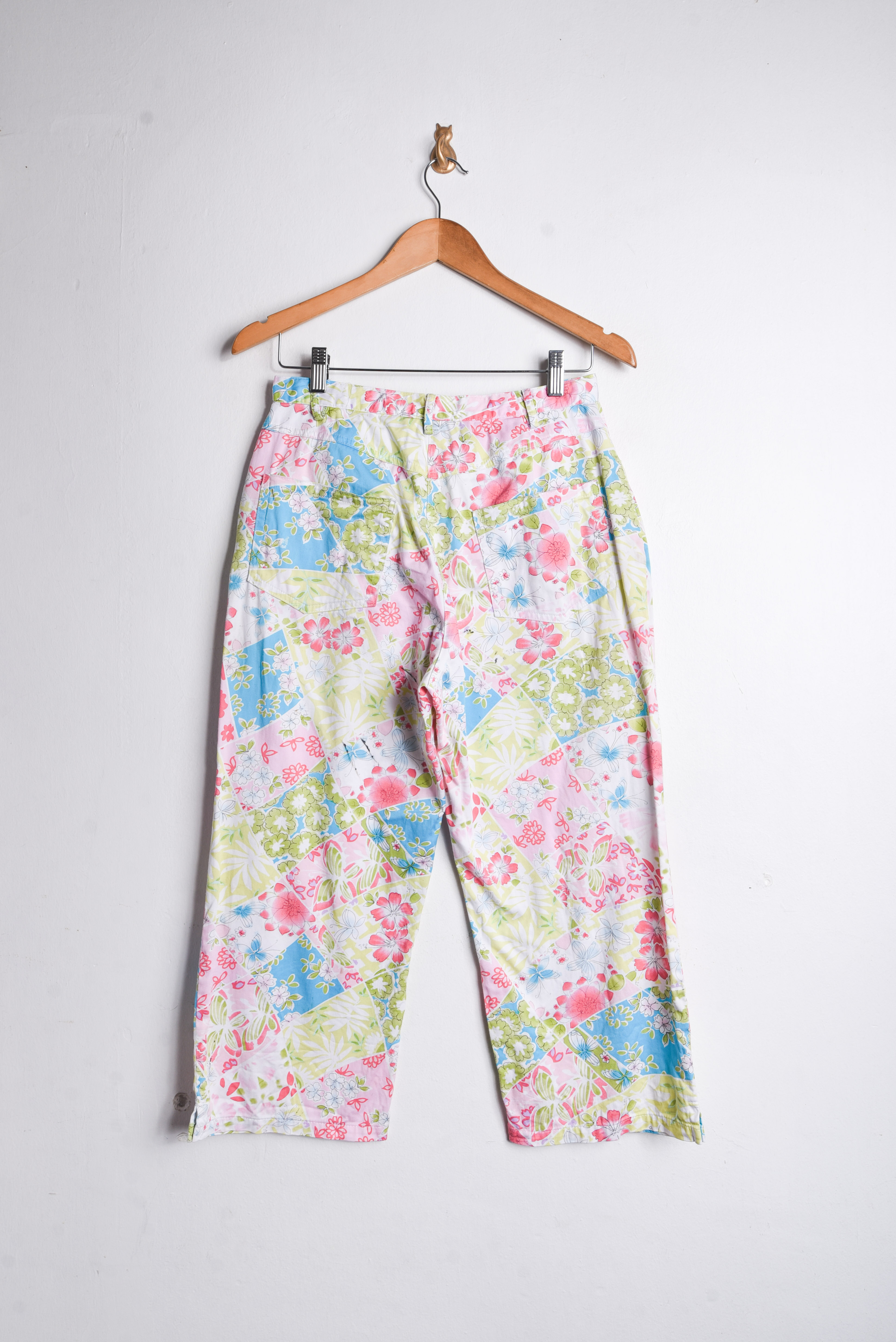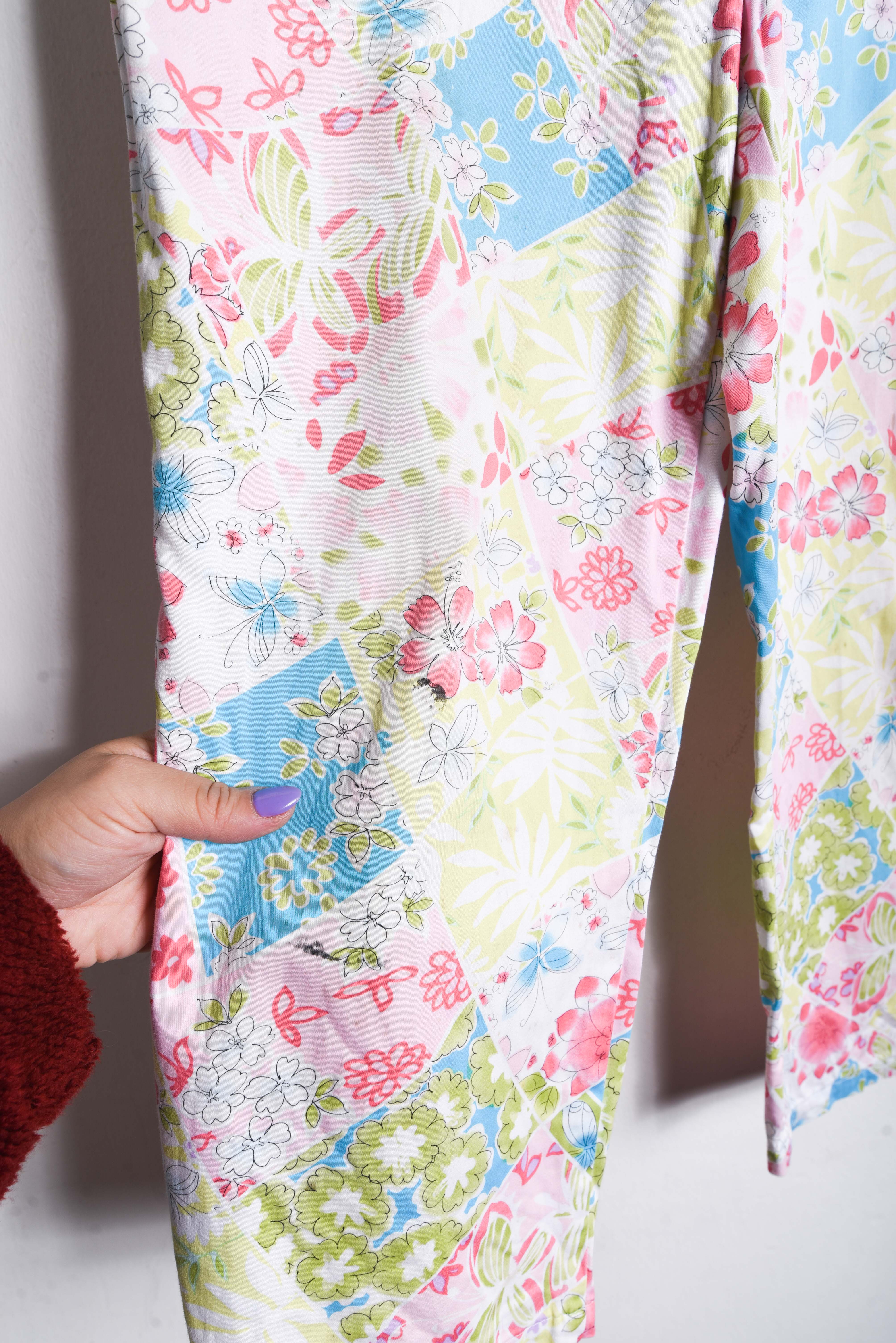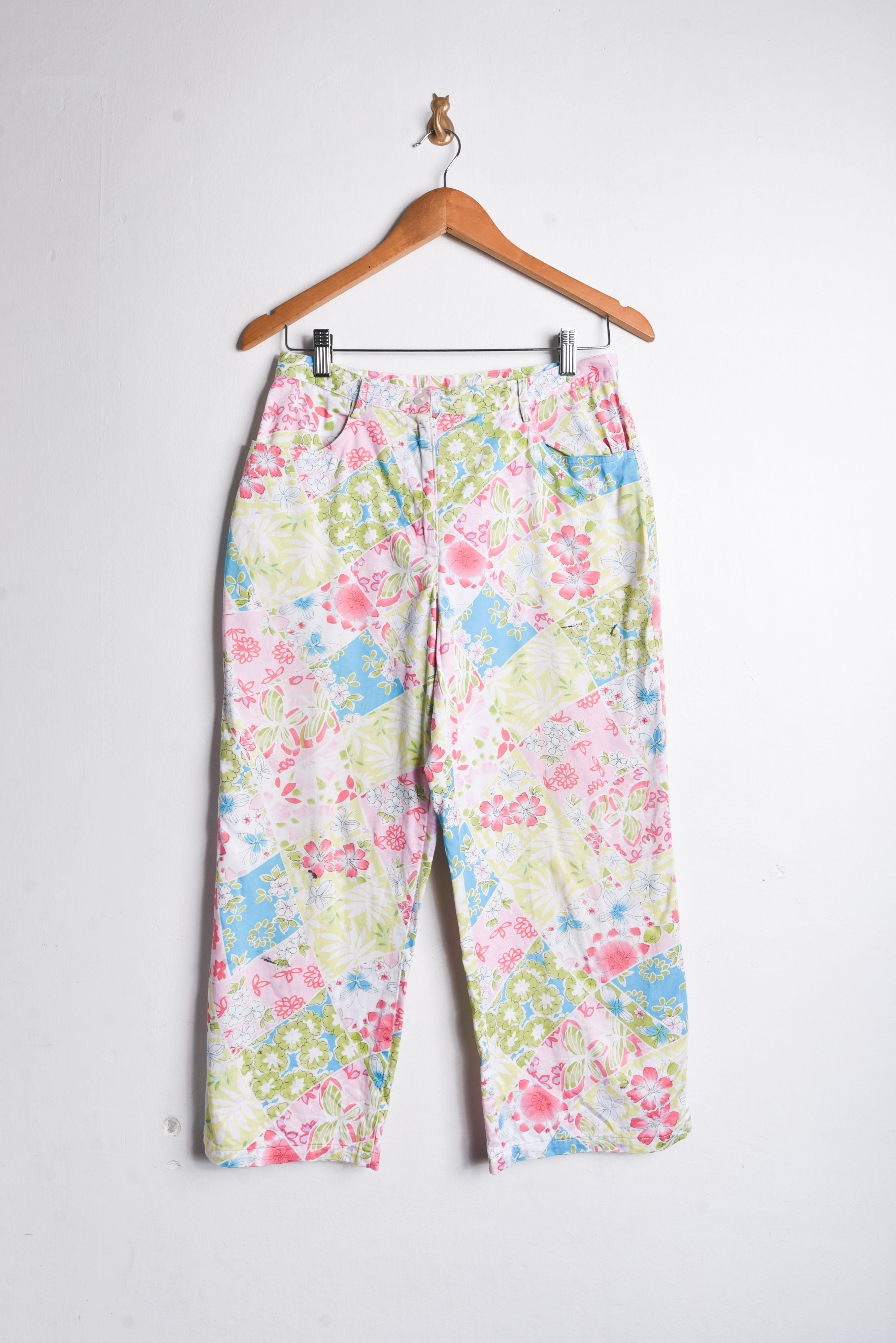 Hermoso pantalón vintage de tiro alto, color blanco con diseño floral multicolor, cierre delantero y bolsillos. 97% algodón y 3% spandex