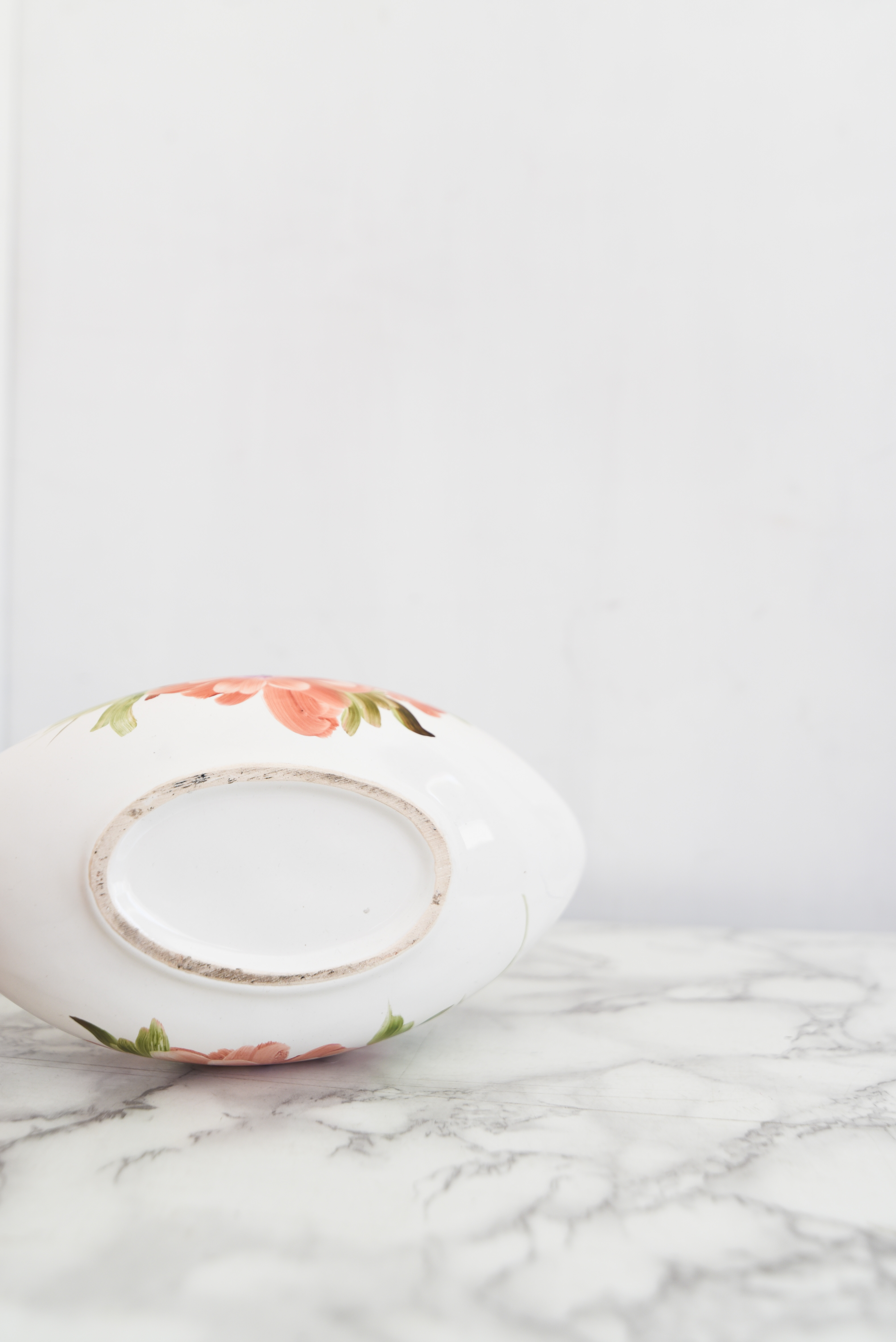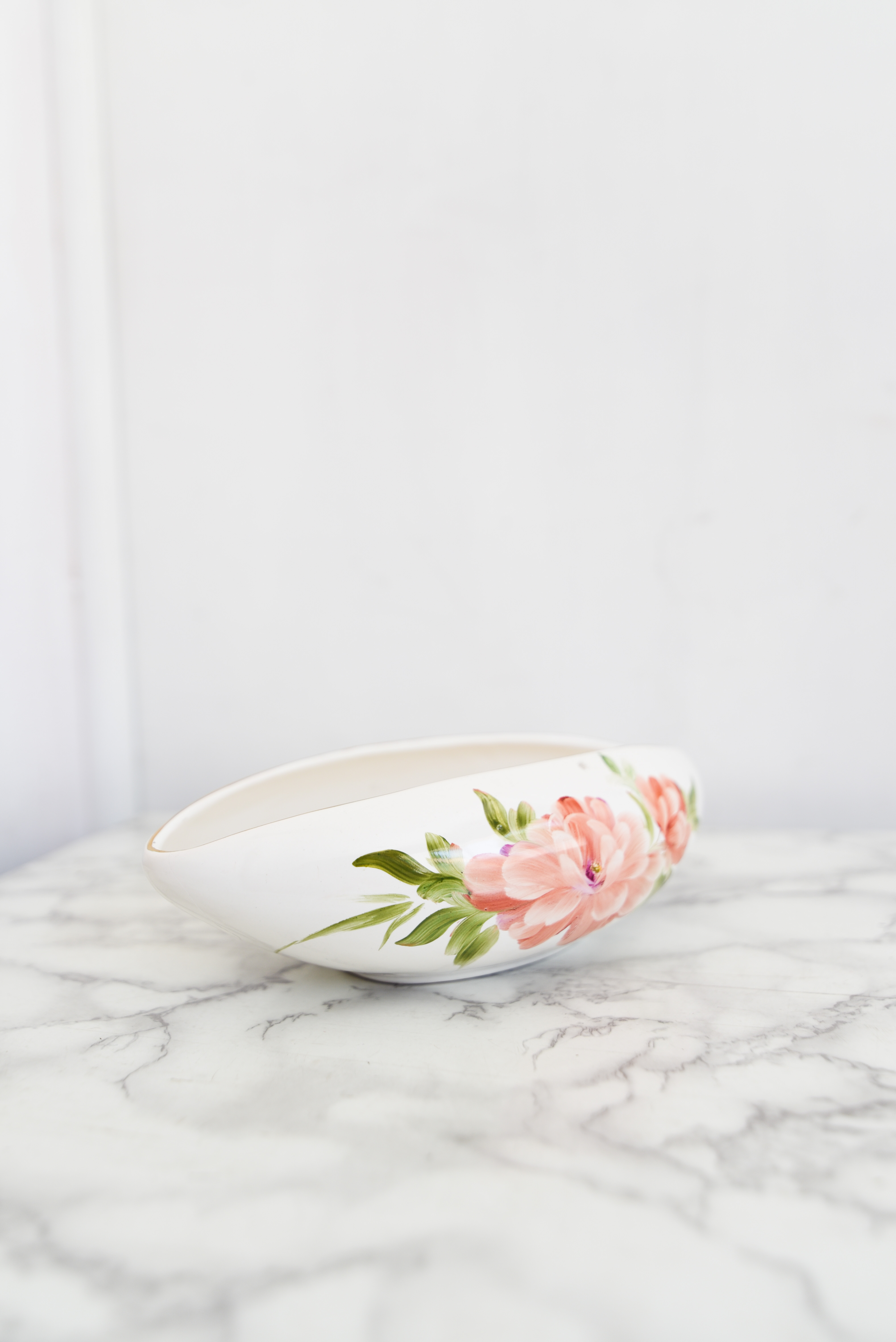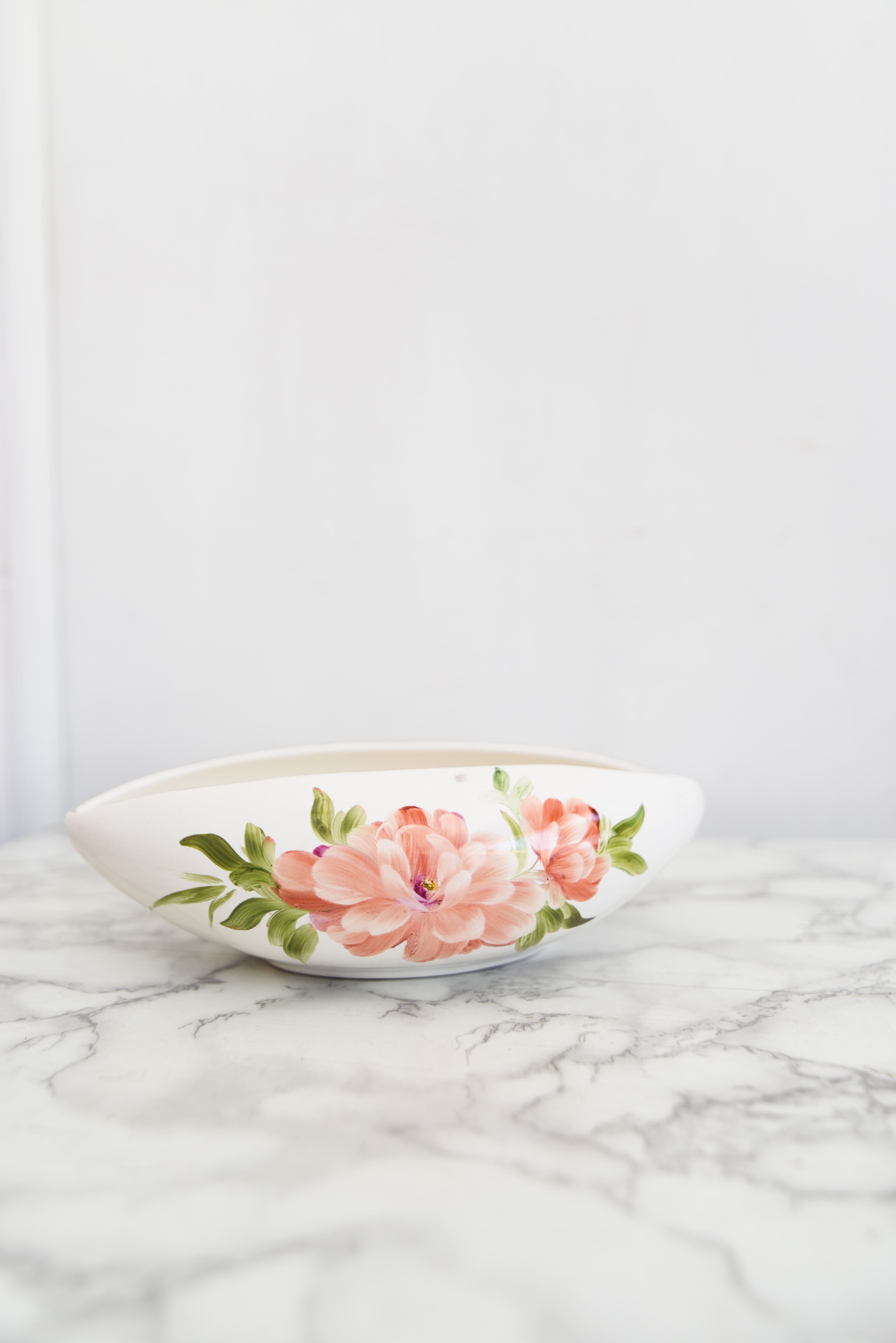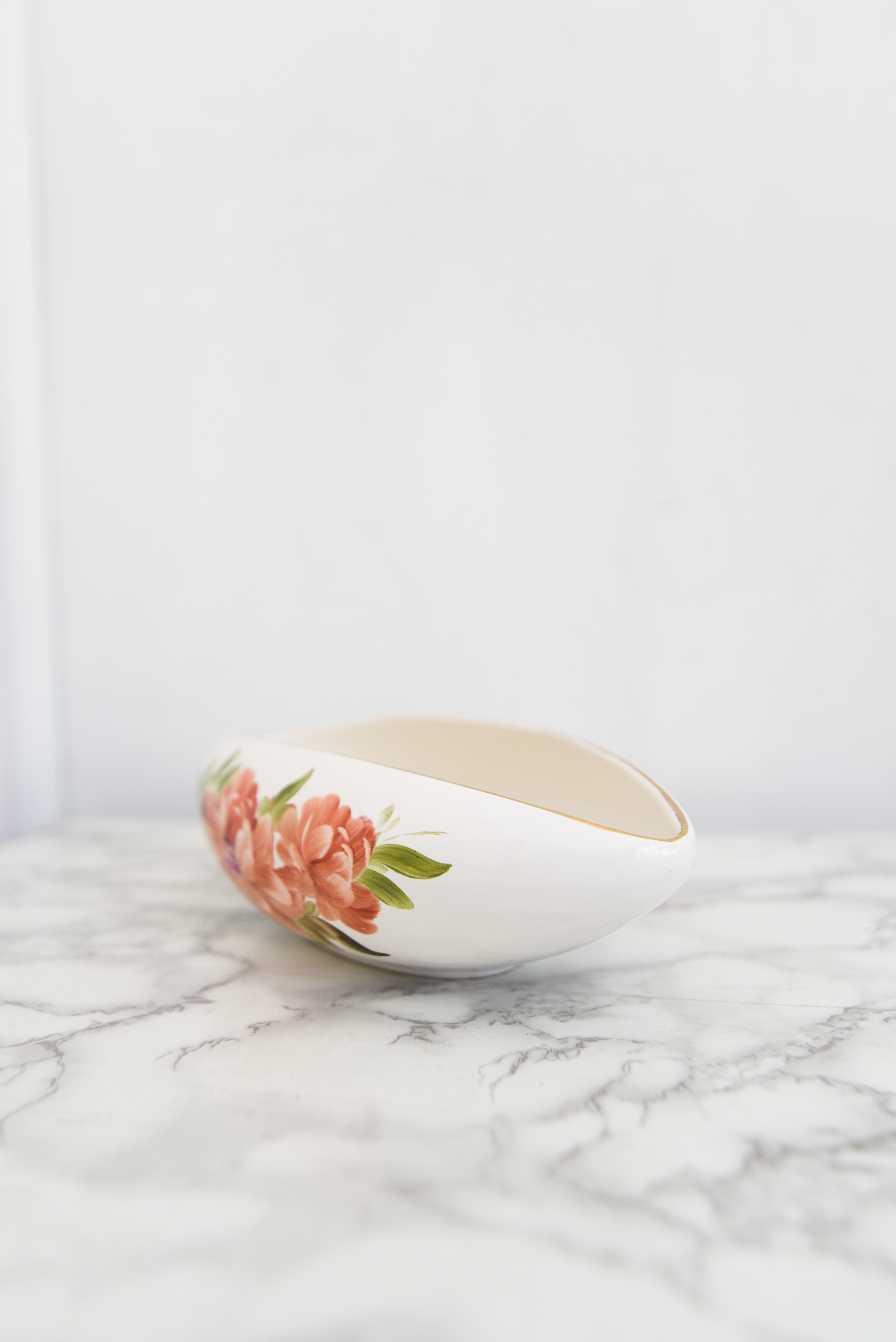 Bello plato vintage estilo salsero, color marfil con esmaltado brillante y diseño floral en coral y verde.