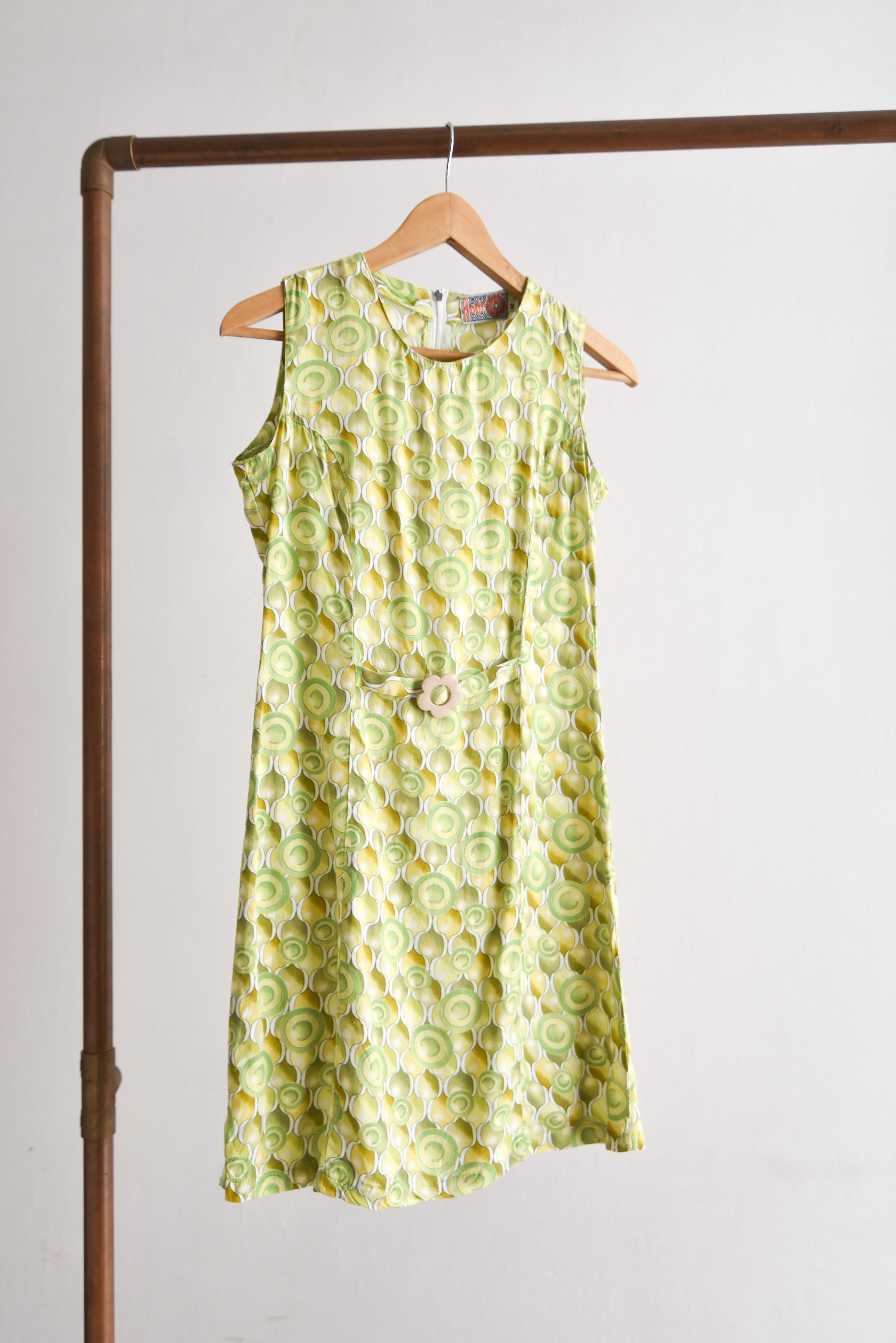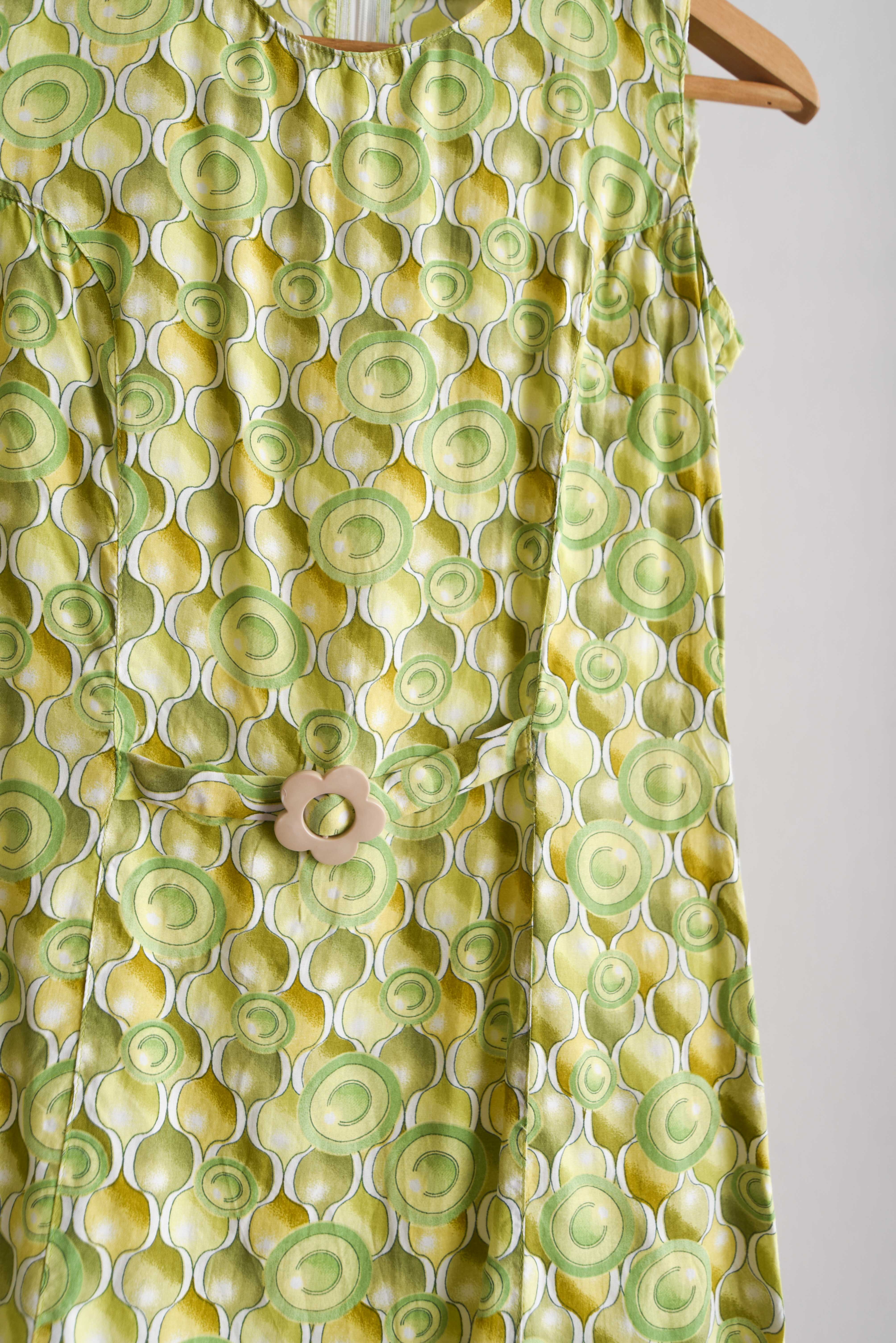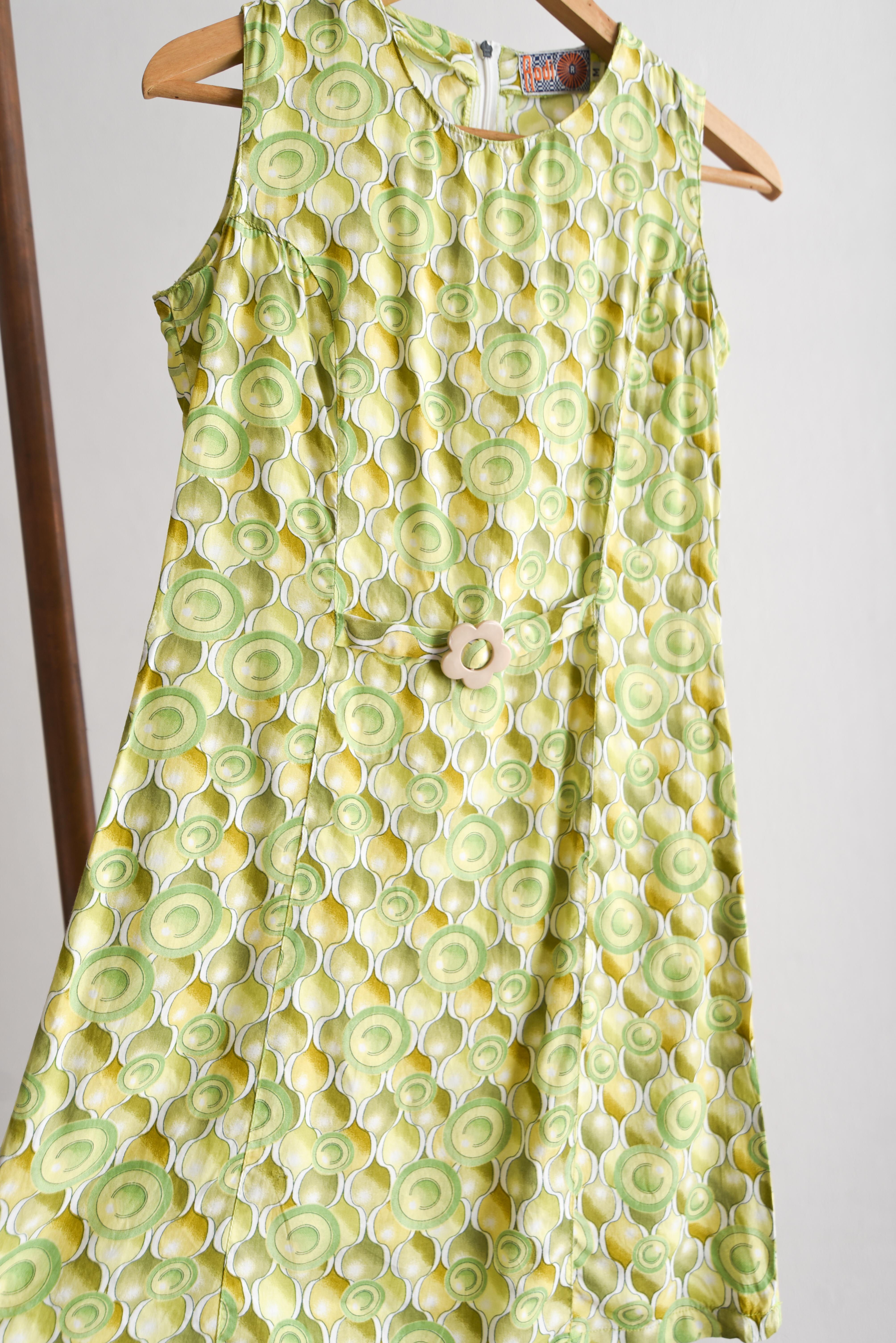 Hermoso vestido vintage en color verde, tiene diseño de círculos y cinturón integrado con flor de resina.