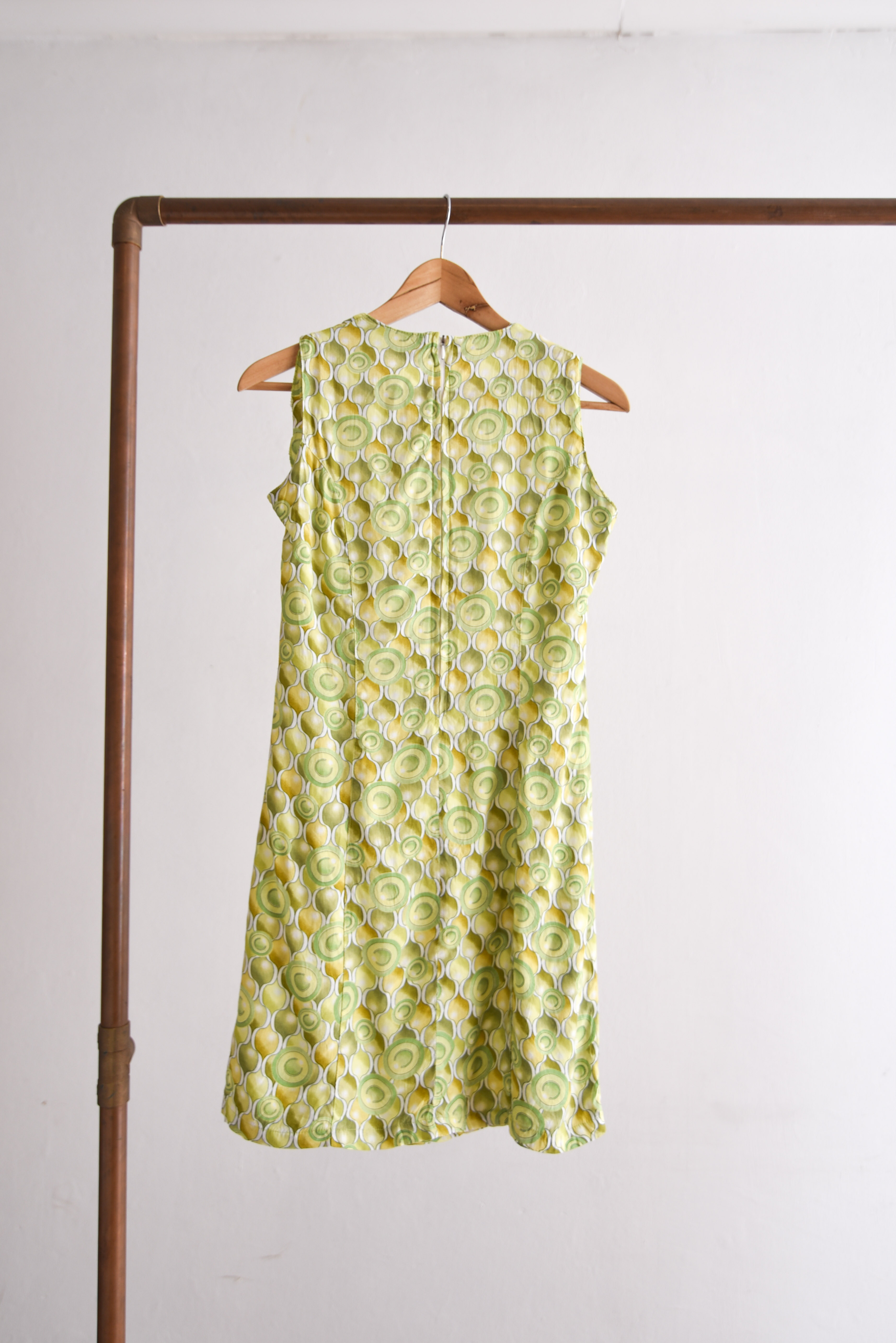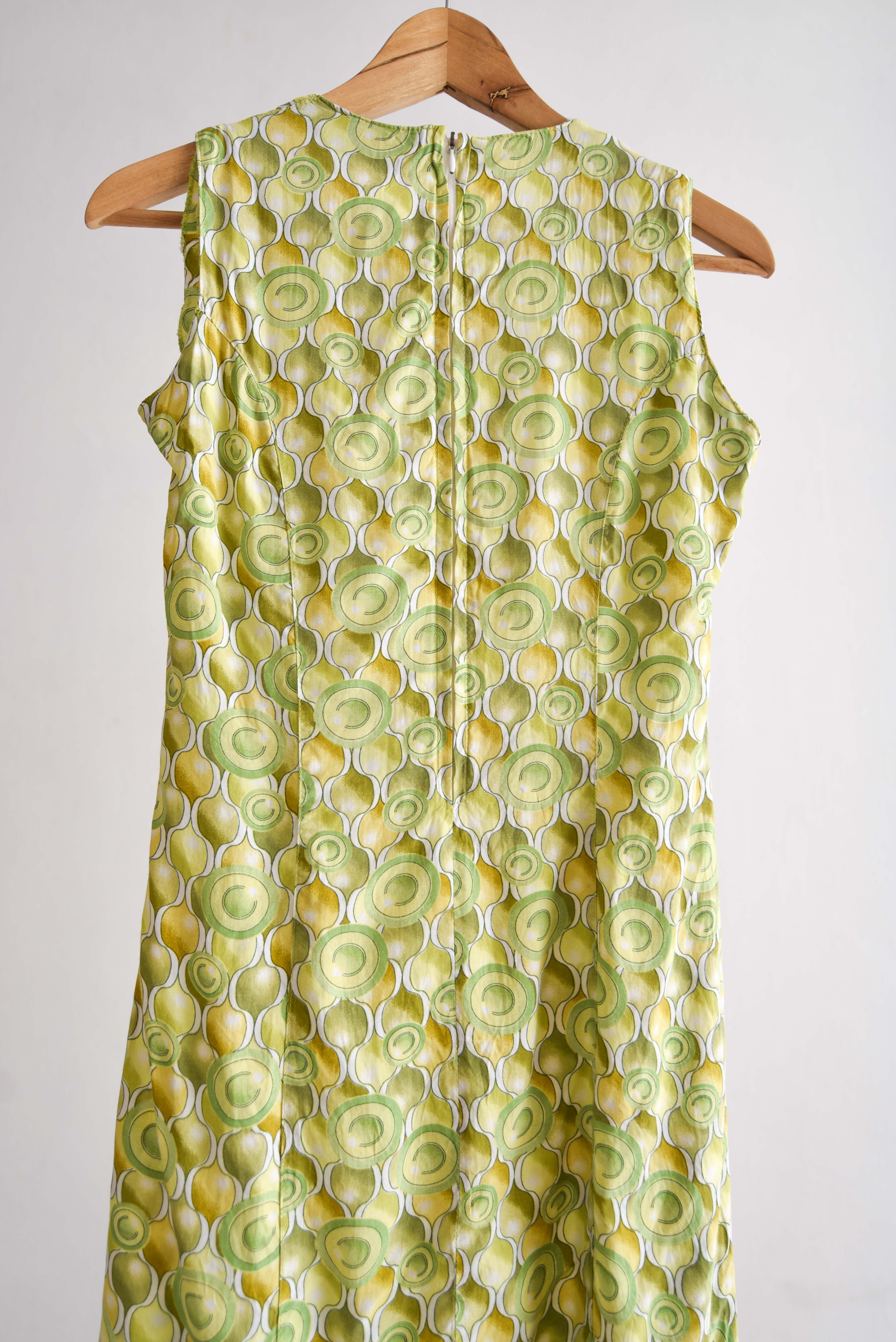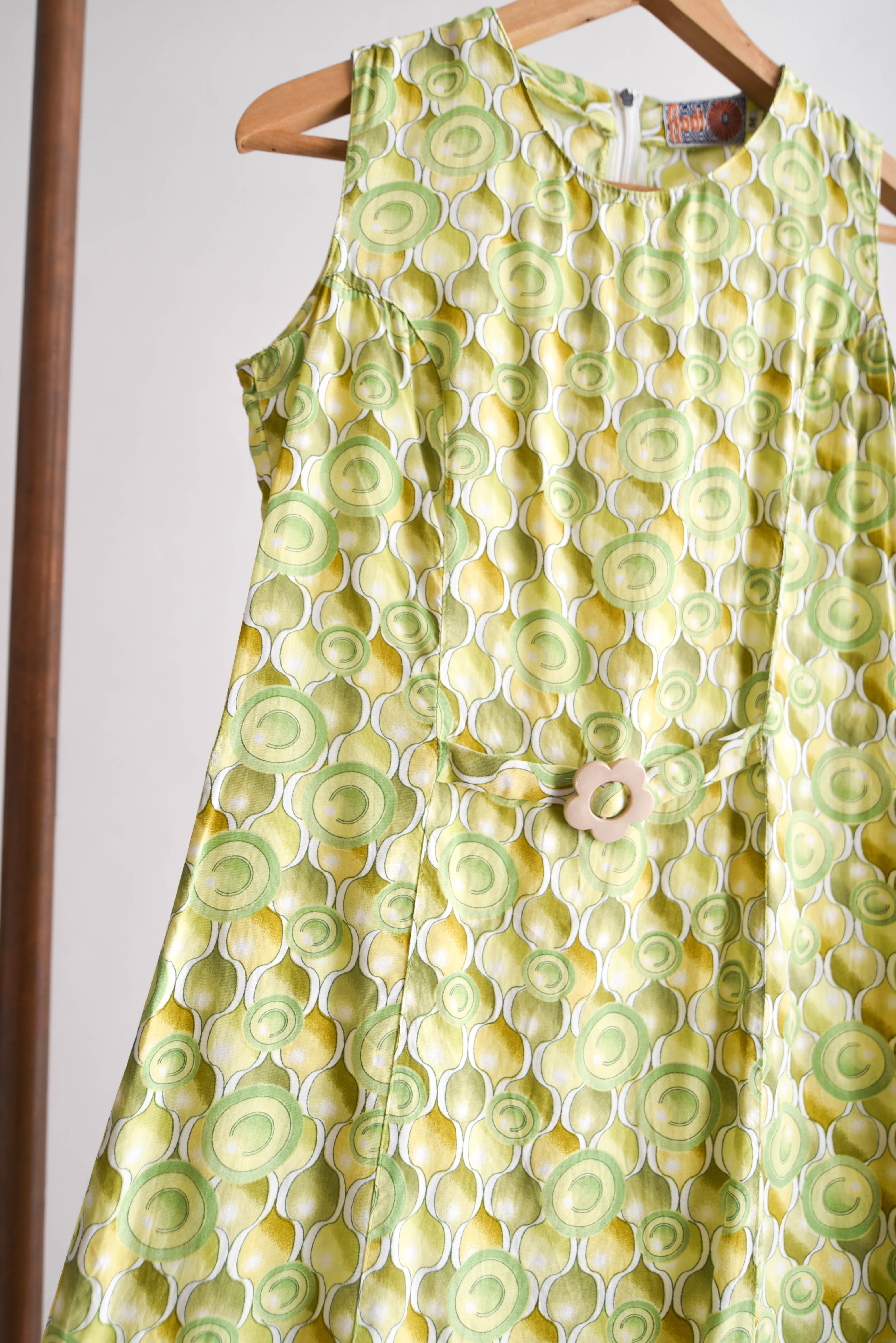 Hermoso vestido vintage en color verde, tiene diseño de círculos y cinturón integrado con flor de resina.